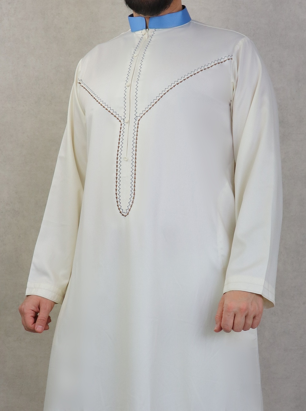 Qamis traditionnel élégant pour homme de qualité supérieure avec broderies - Couleur blanc cassé et bleu - REF. 34129 (49.00 €)