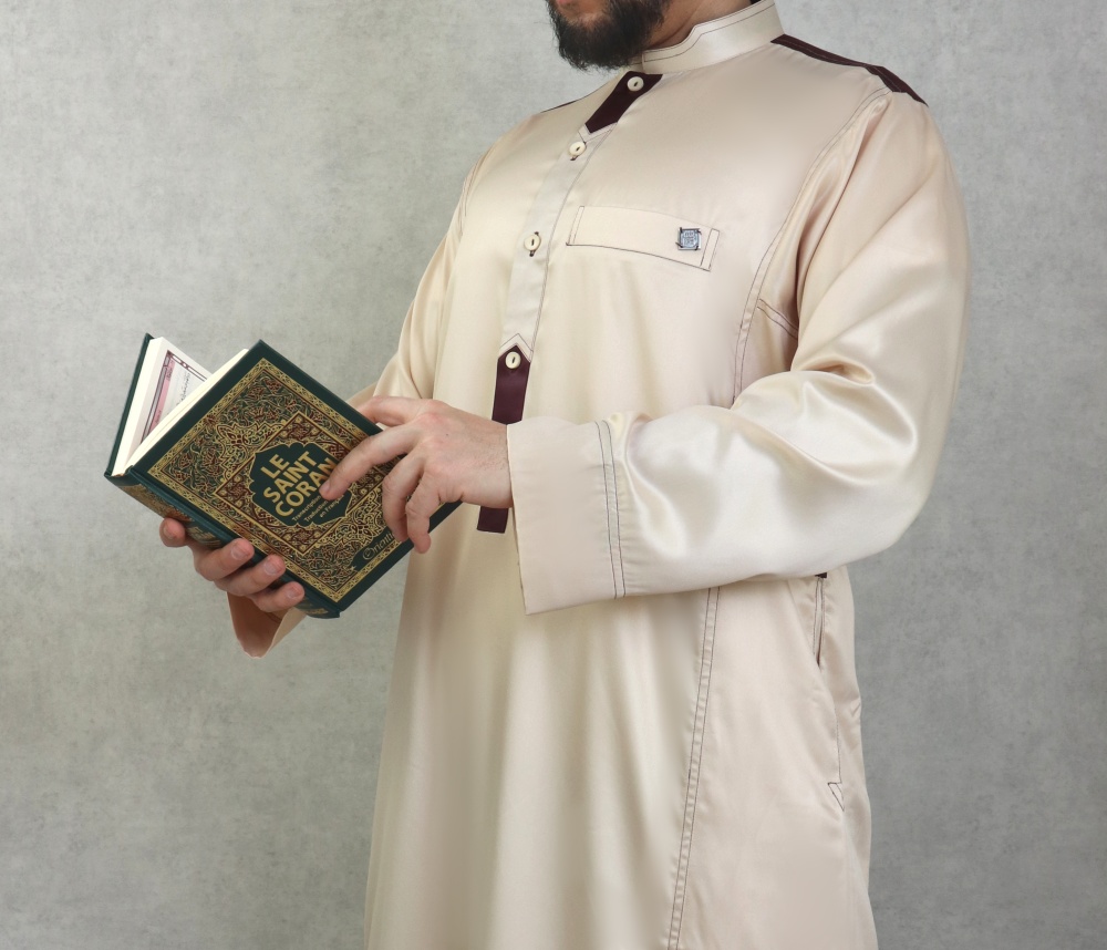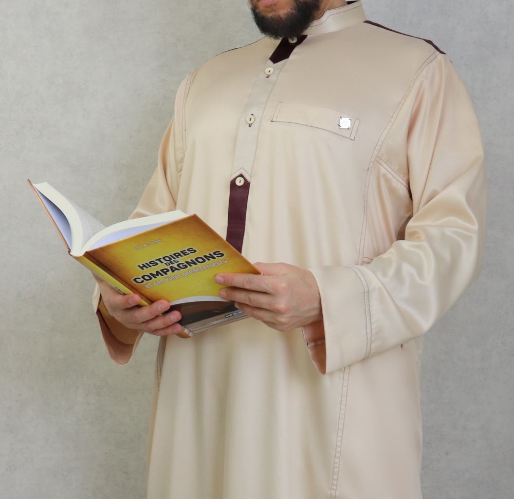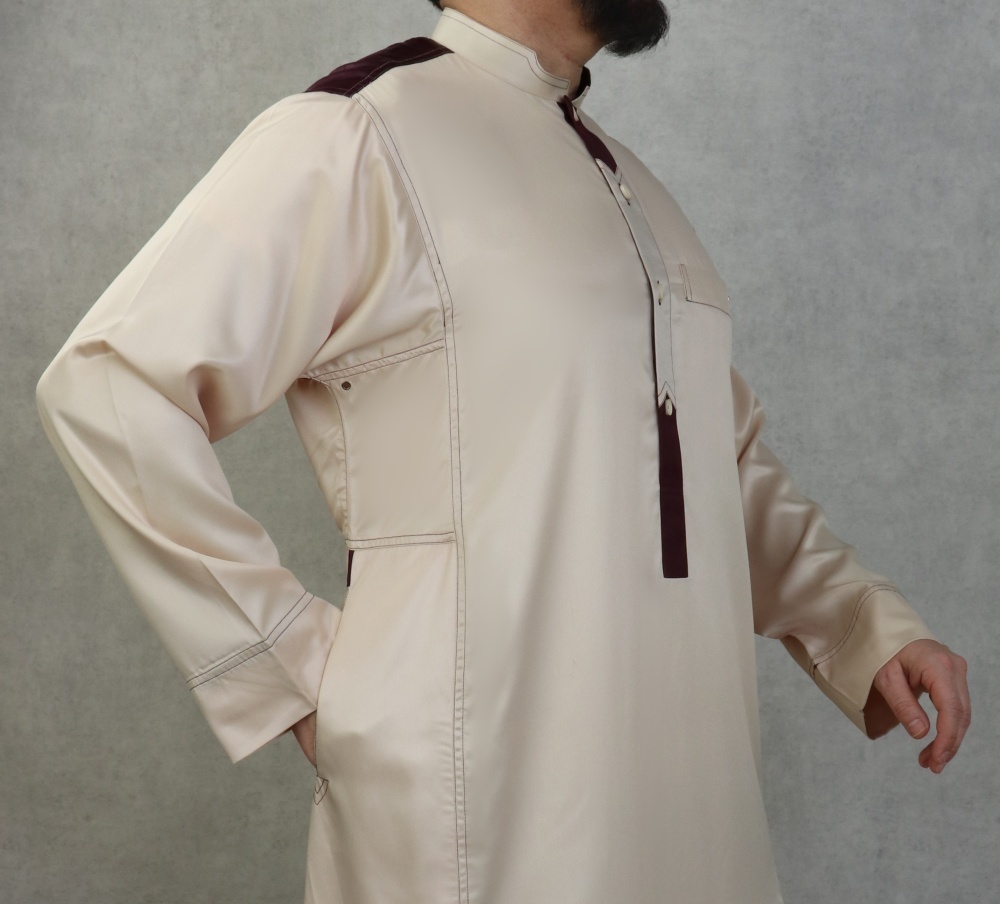 Qamis de de luxe de marque AlBai de couleur beige avec de belles décorations et finitions couleur aubergine.