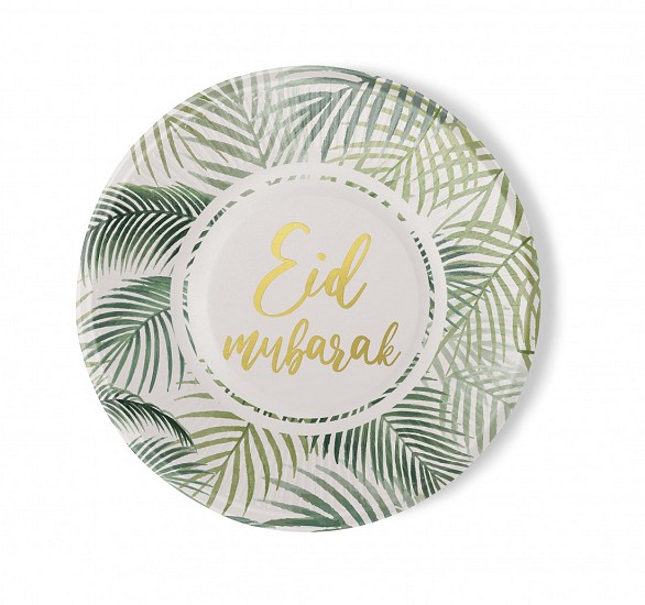 Assiette Motif tropical avec inscriptions dorée "Eid Mubarak" : Lot de 6 assiettes pour fête musulmane de l'Aïd - REF. 35513 (3.50 €)