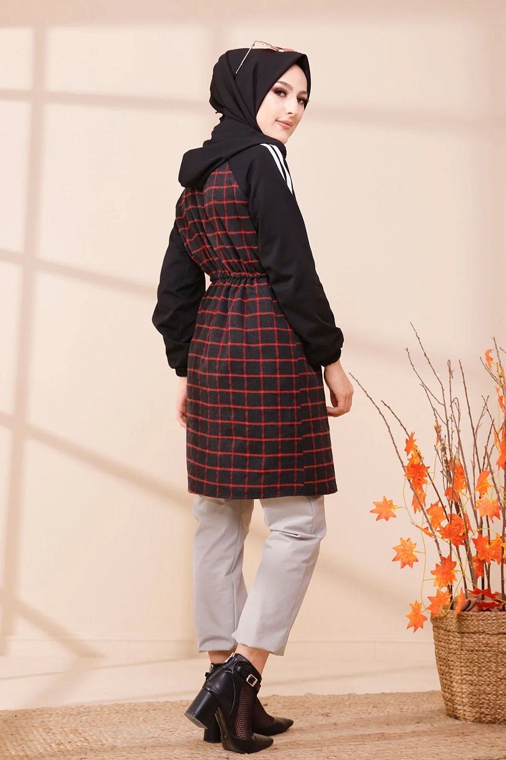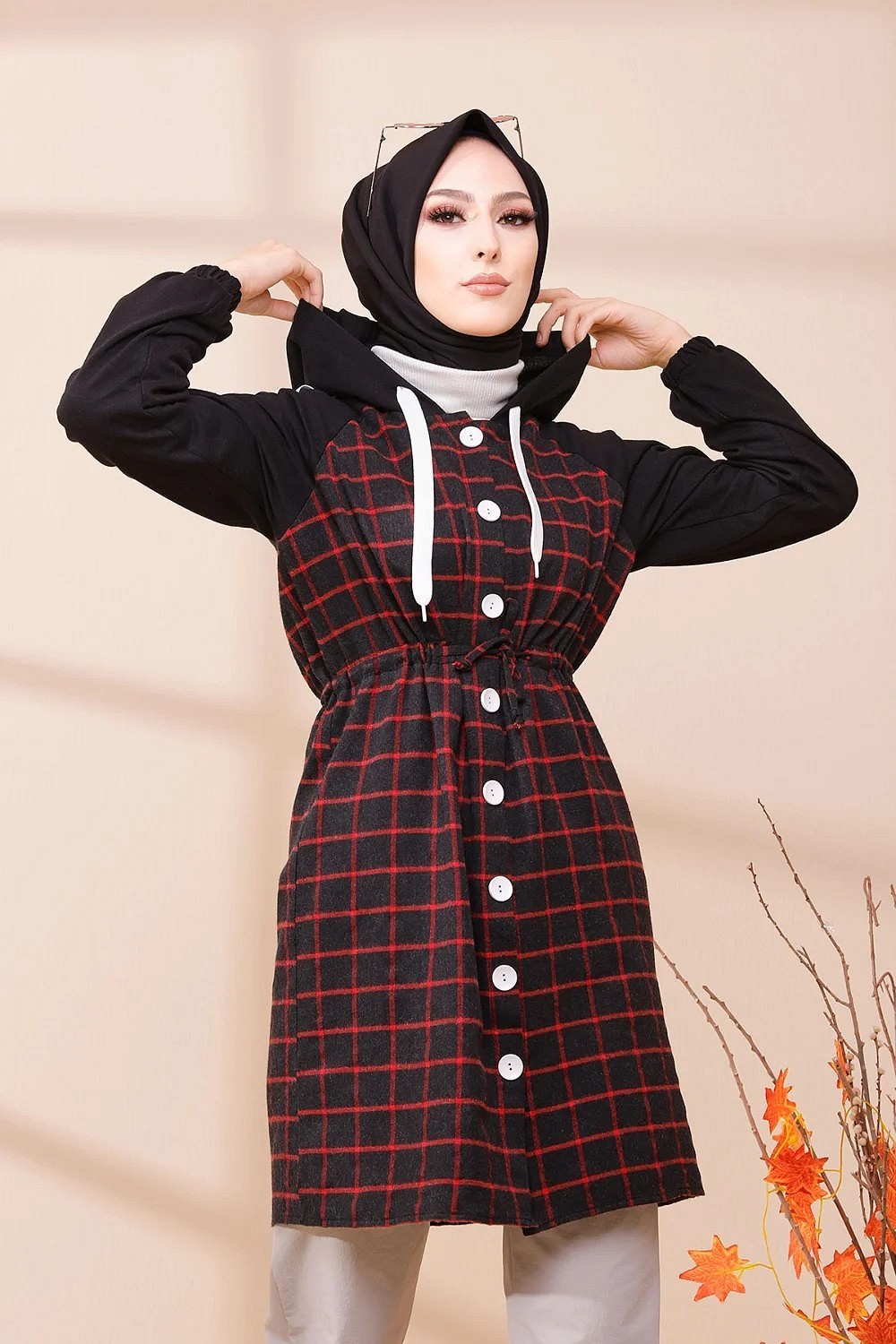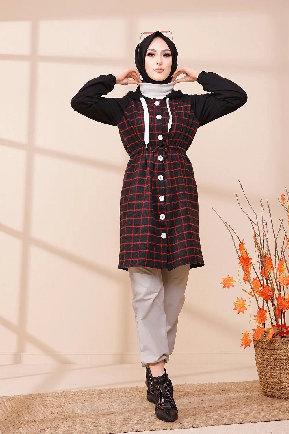 Tunique avec capuche pour femme (Vetement hijab style moderne) - Couleur noir et rouge