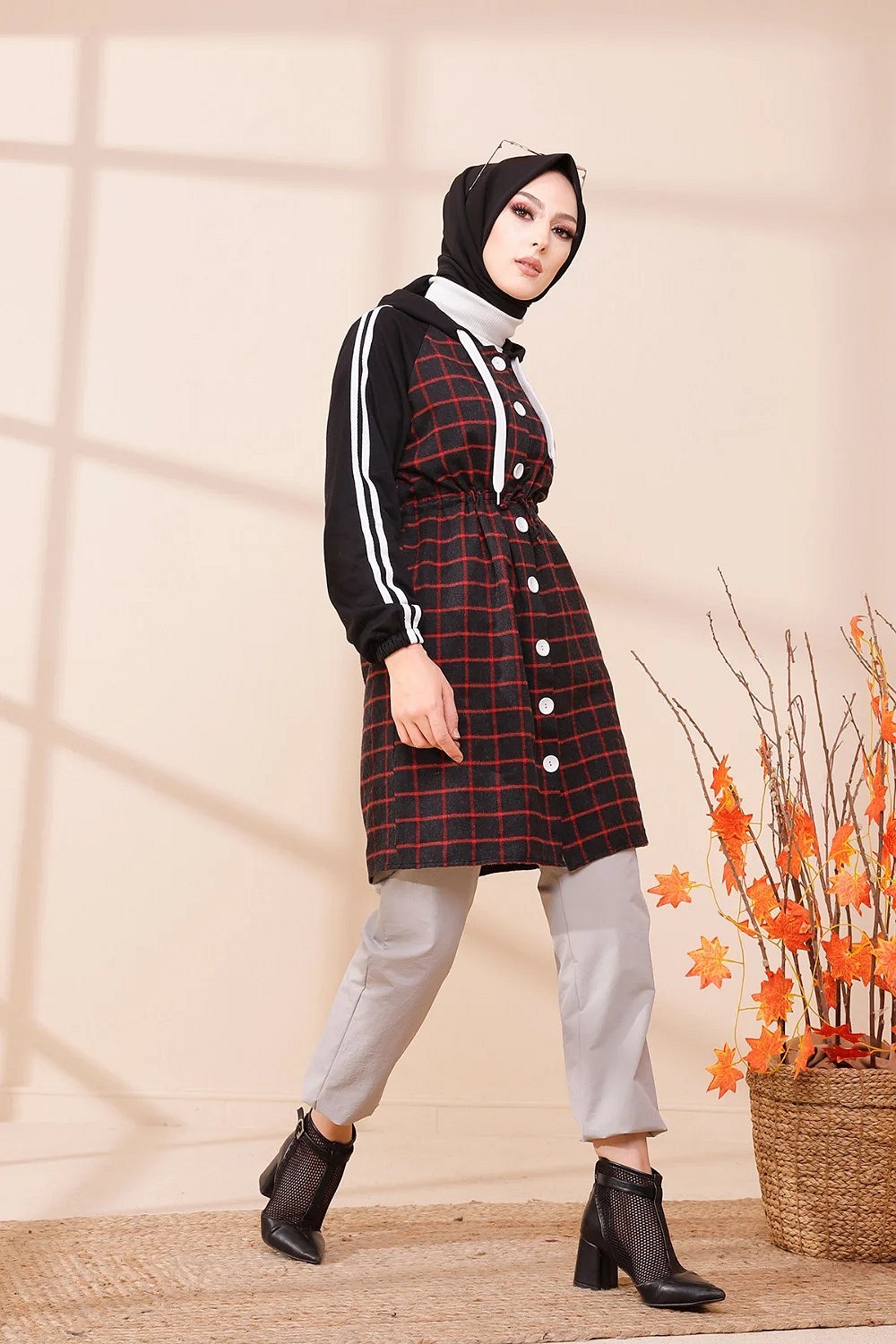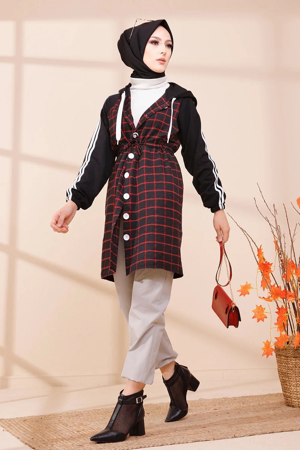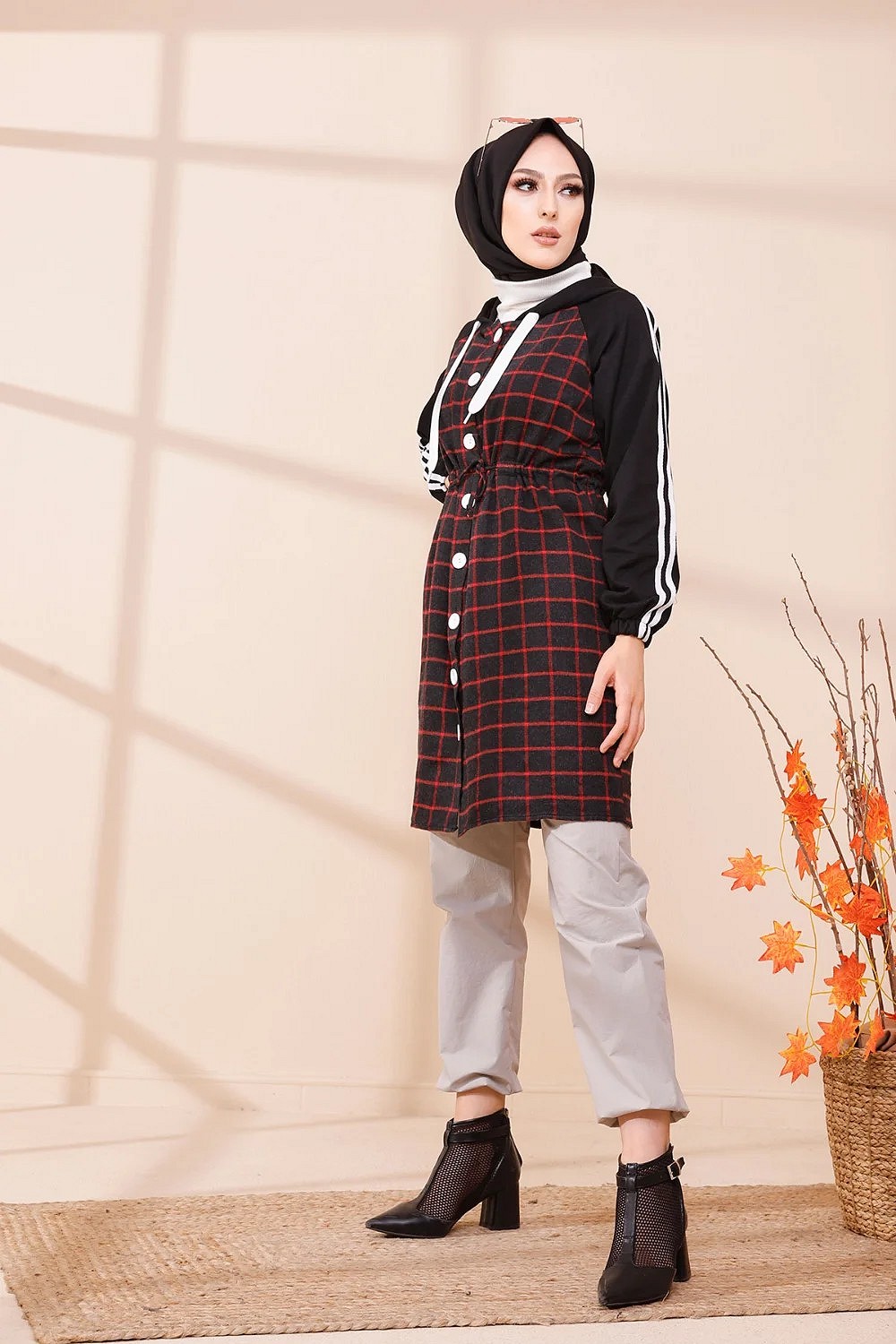 Tunique avec capuche pour femme (Vetement hijab style moderne) - Couleur noir et rouge