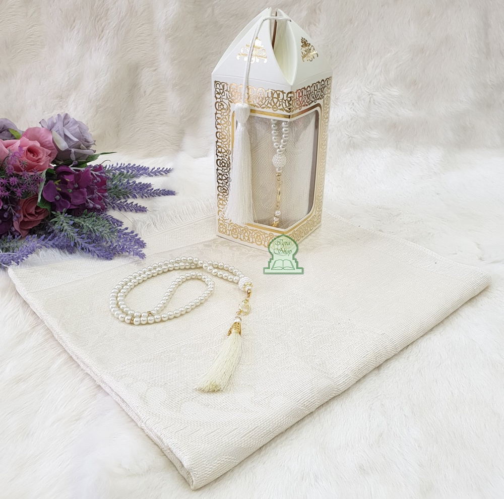 Joli coffret original doré contenant un tapis de prière adulte brodé de coton 70 x 110 cm. Chapelet décoré à 99 perles.