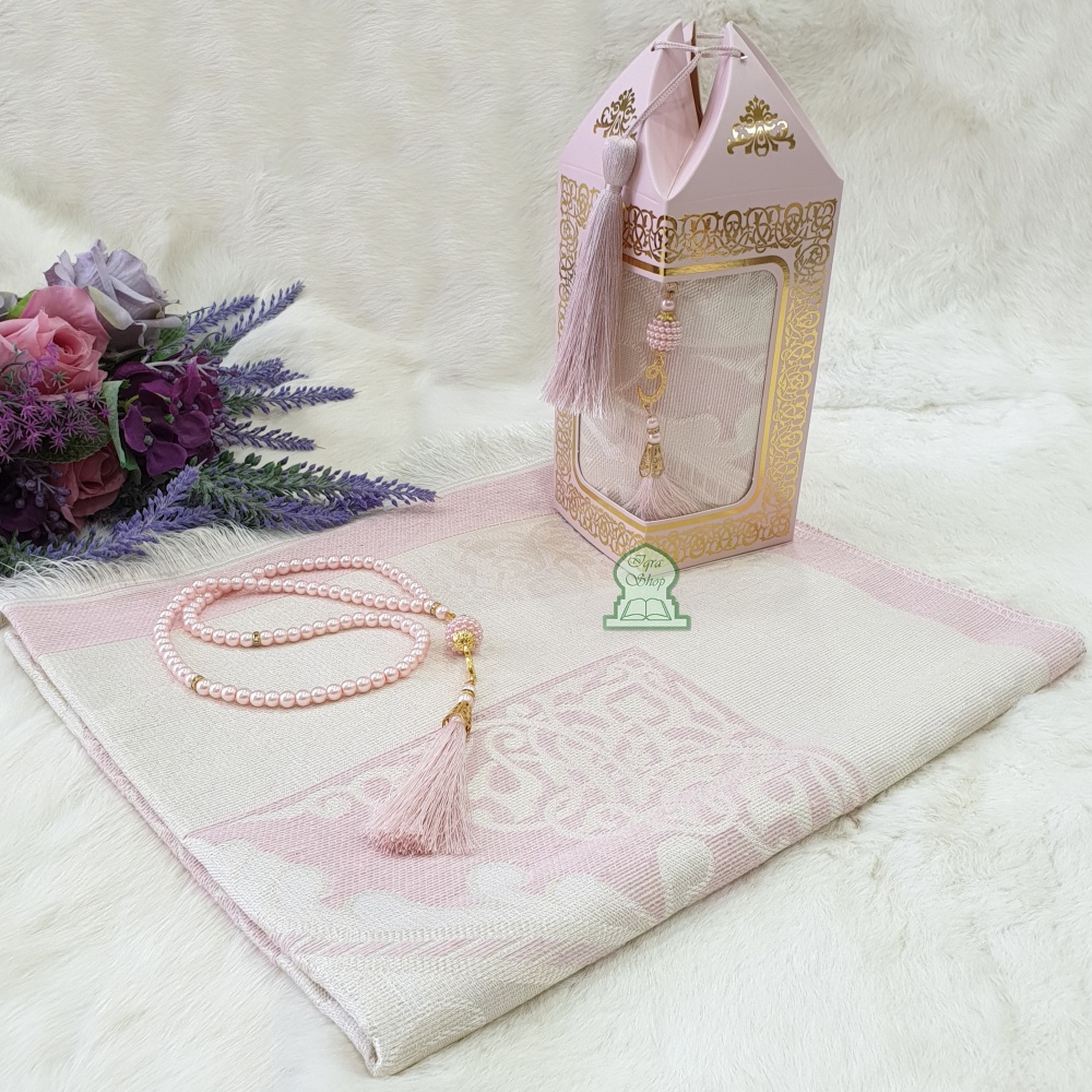 Coffret Cadeau Musulman dore : Tapis decore brillant et Chapelet (Sebha) - Couleur Rose clair