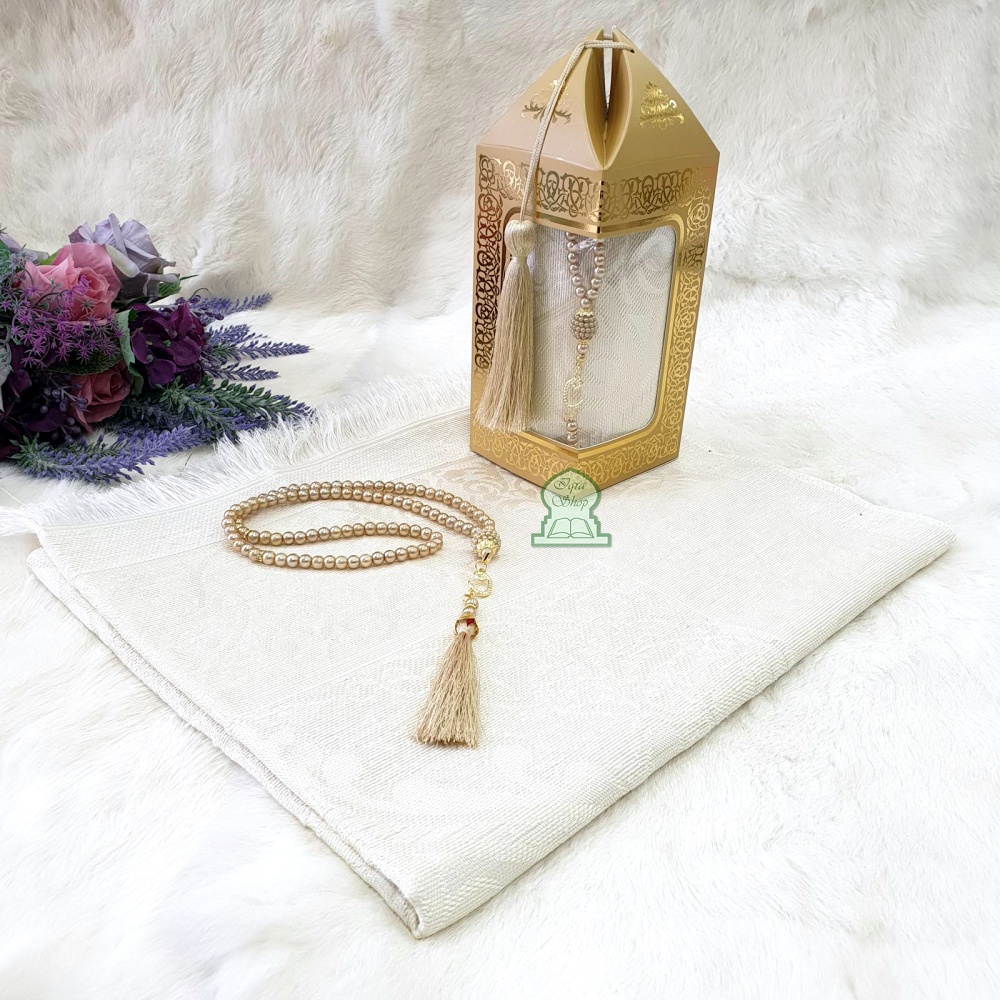 Coffret Cadeau Musulman doré : Tapis décoré brillant et Chapelet (Sebha) - Couleur Blanc cassé - REF. 37620 (16.90 €)