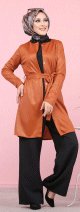 Veste-tunique satinée à ceinture pour femme (Mode musulmane en ligne pas cher) - Couleur rouille - REF. 32260 (20.00 €) - En Promotion à 16.90 €