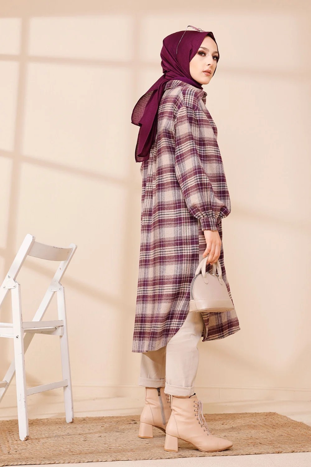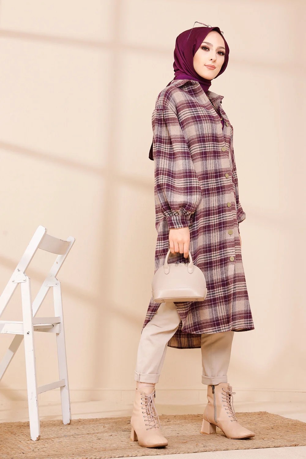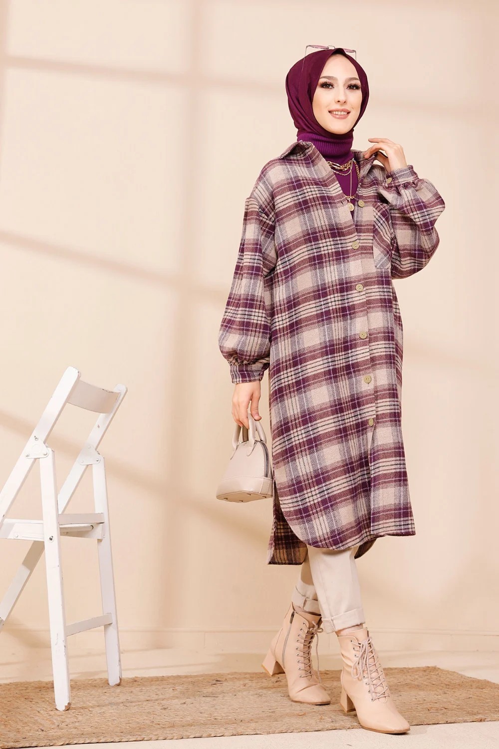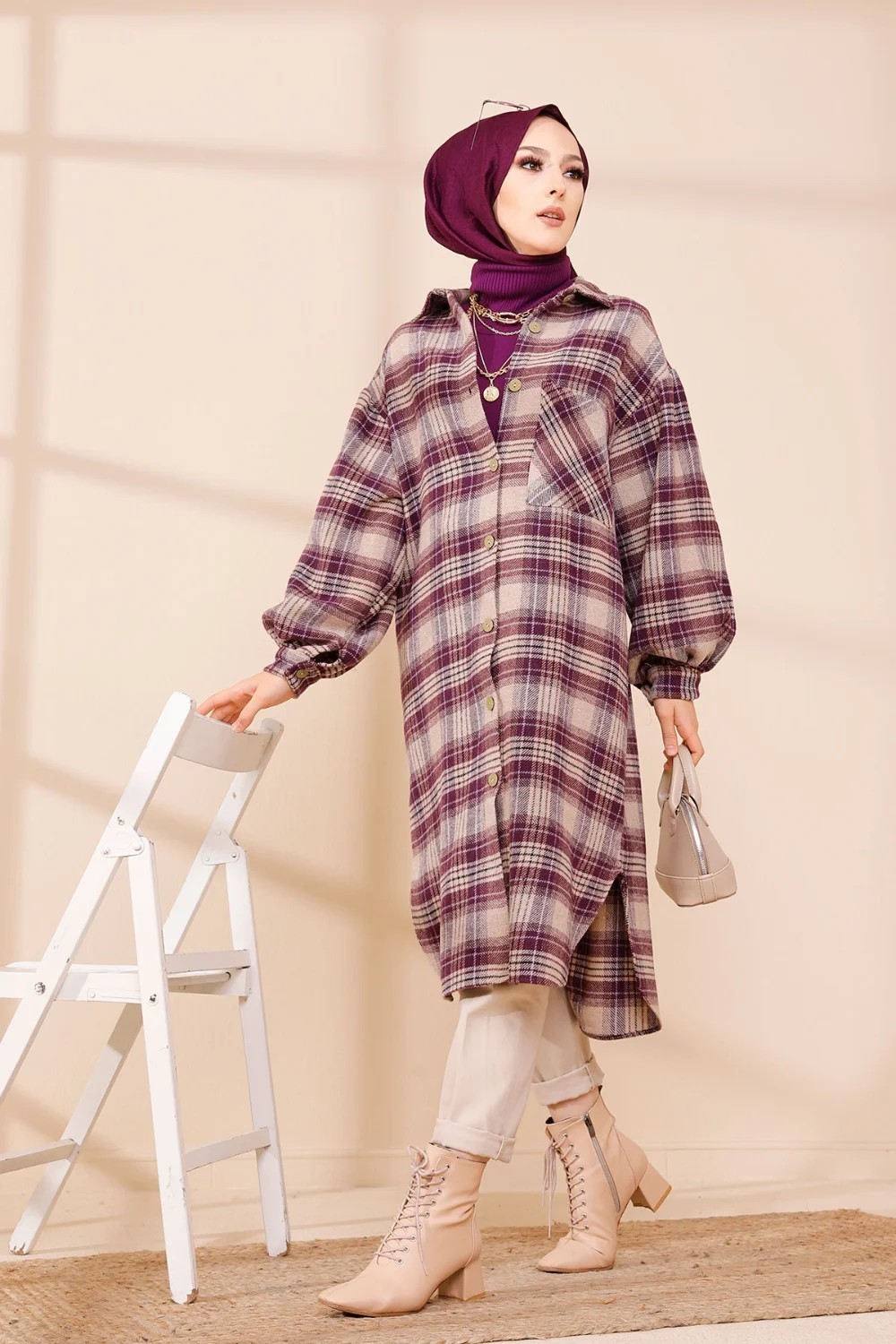 Surchemise longue et ample a carreaux (Mode pudique Mouslima) - Couleur prune