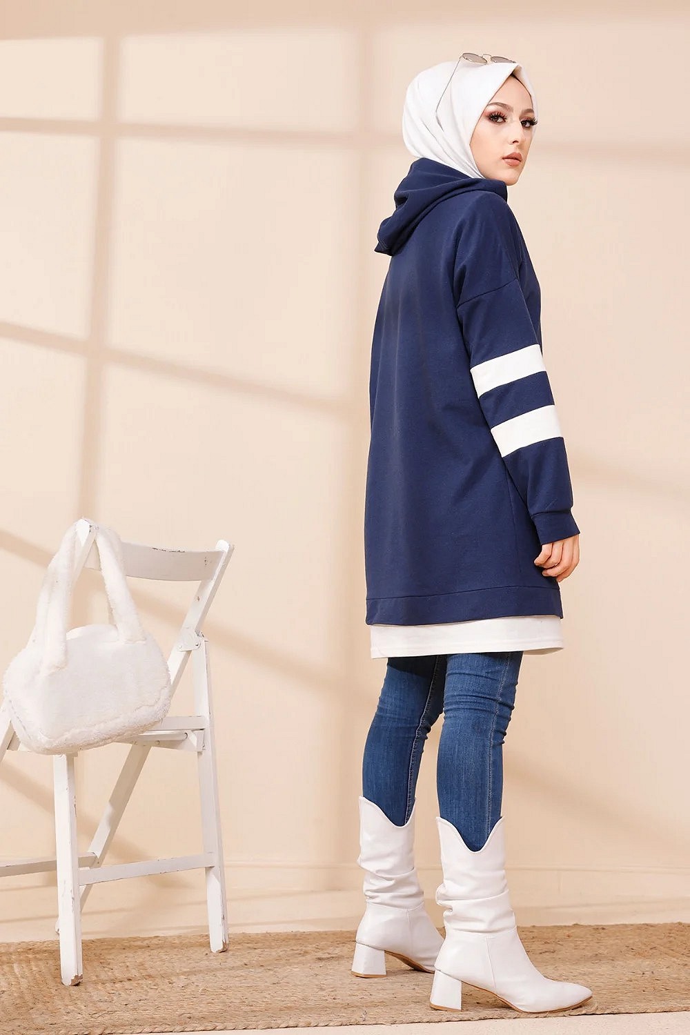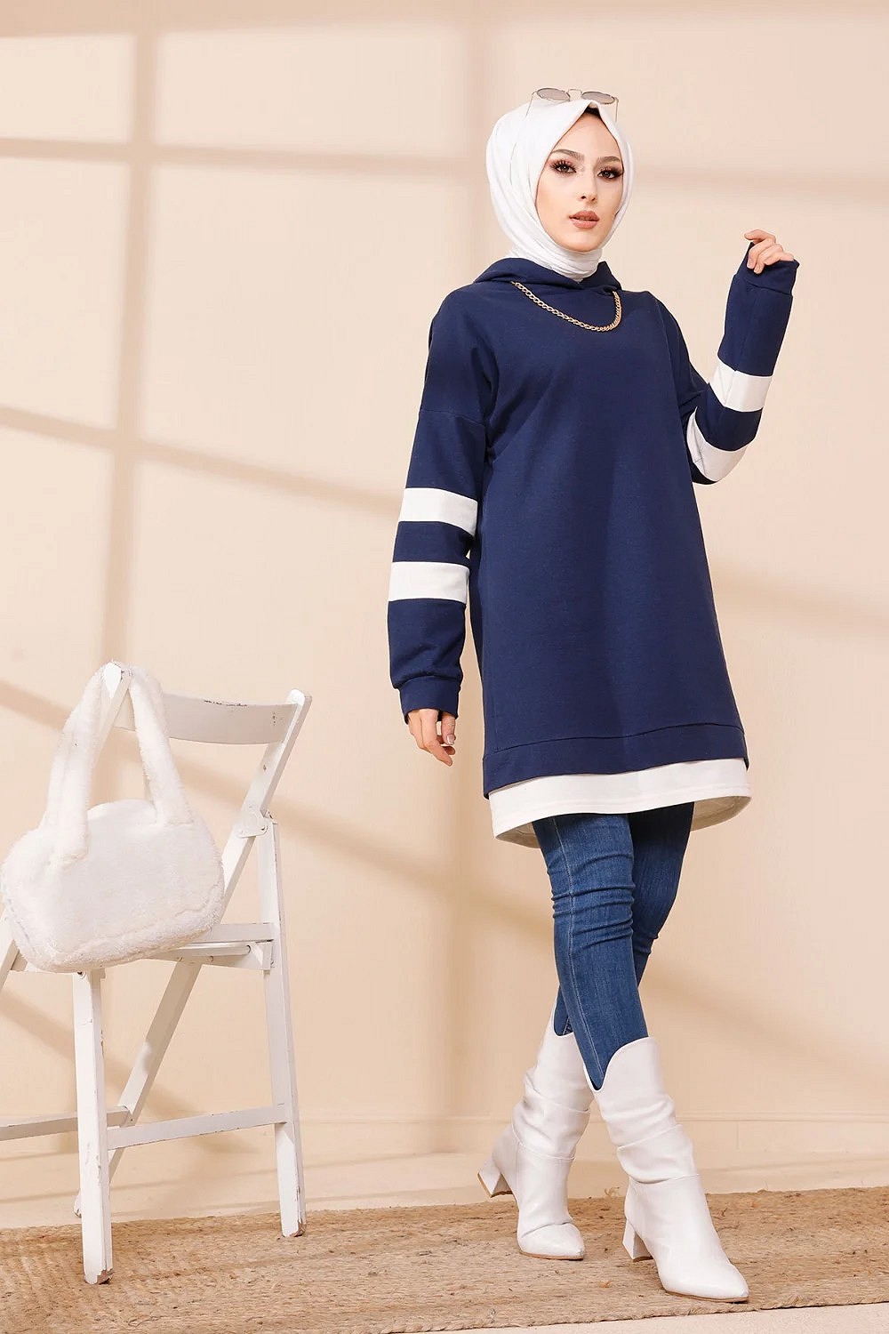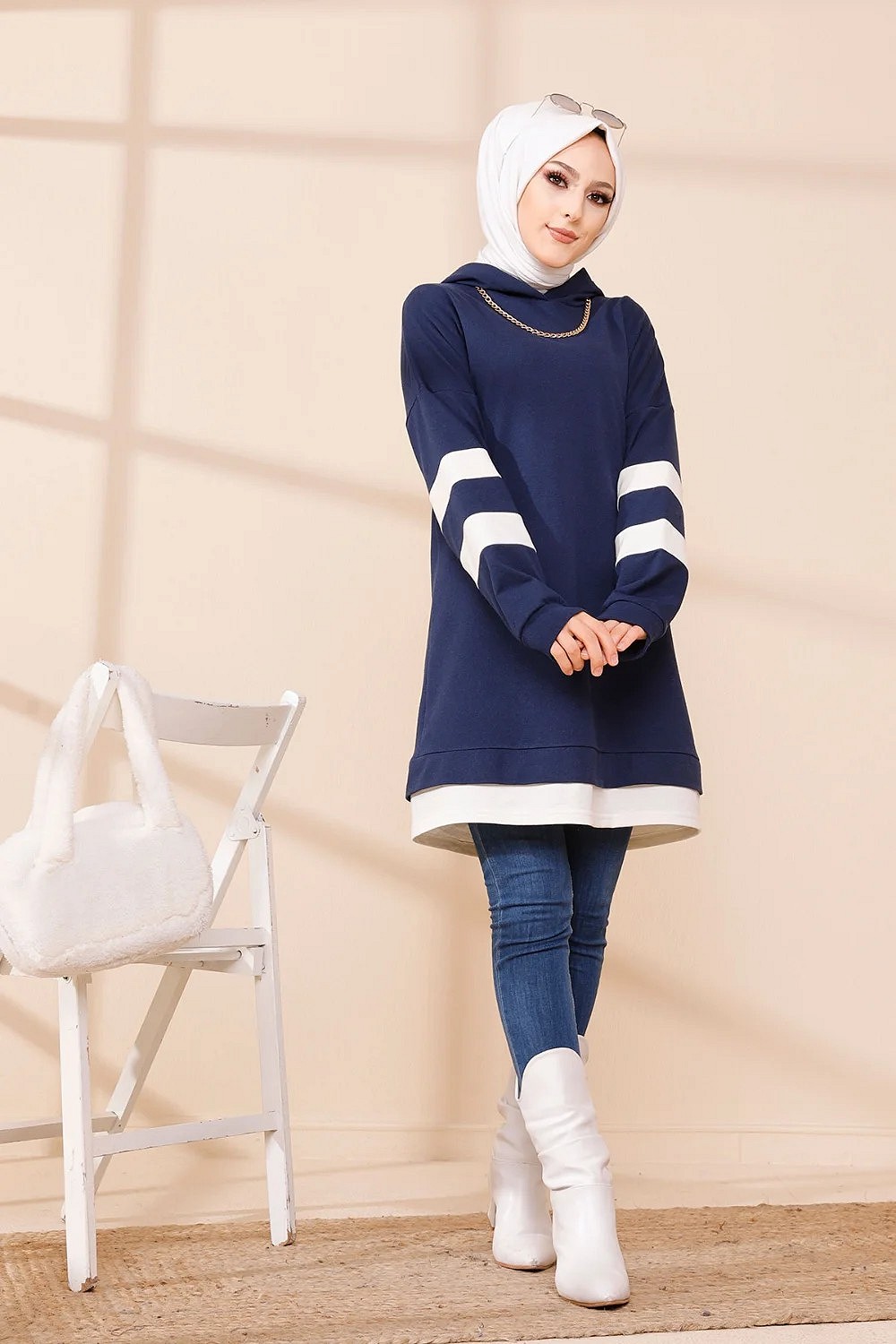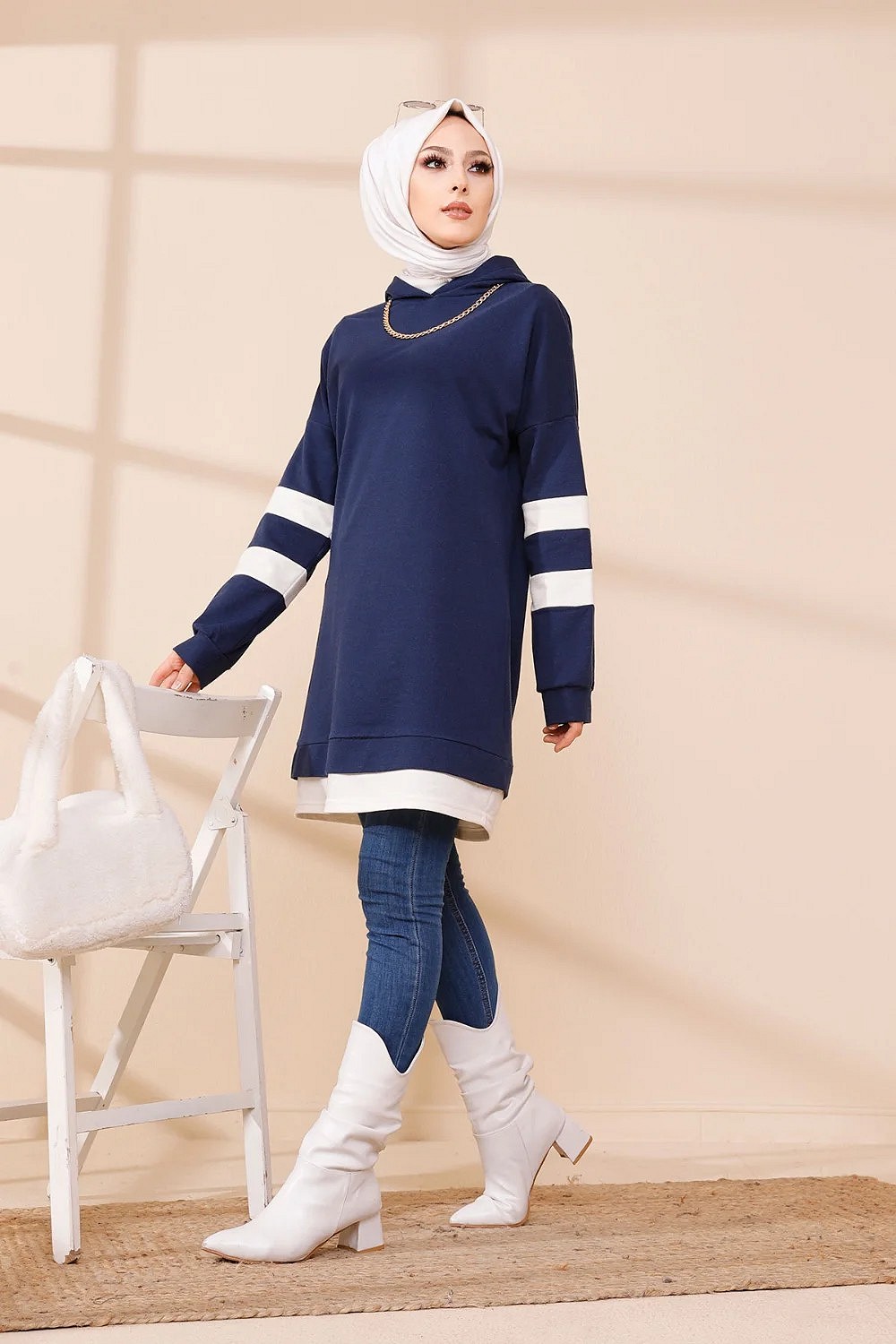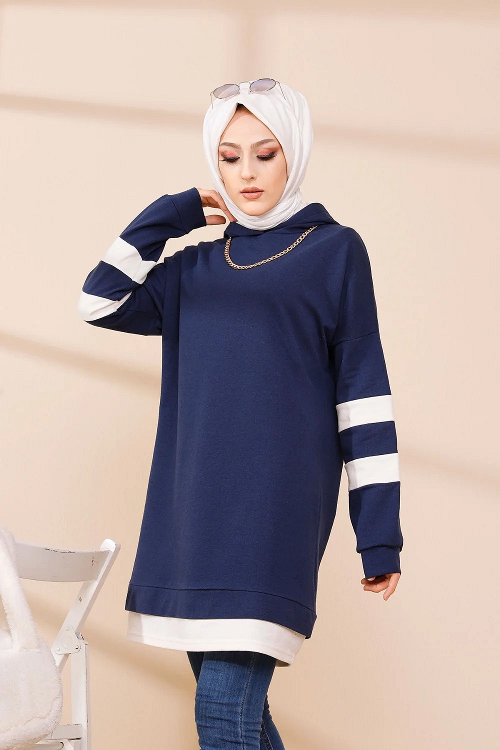 Tunique décontractée avec capuche (Sweat long pour femme voilée) - Couleur bleu marine avec bandes blanches Vetement & Accessoire