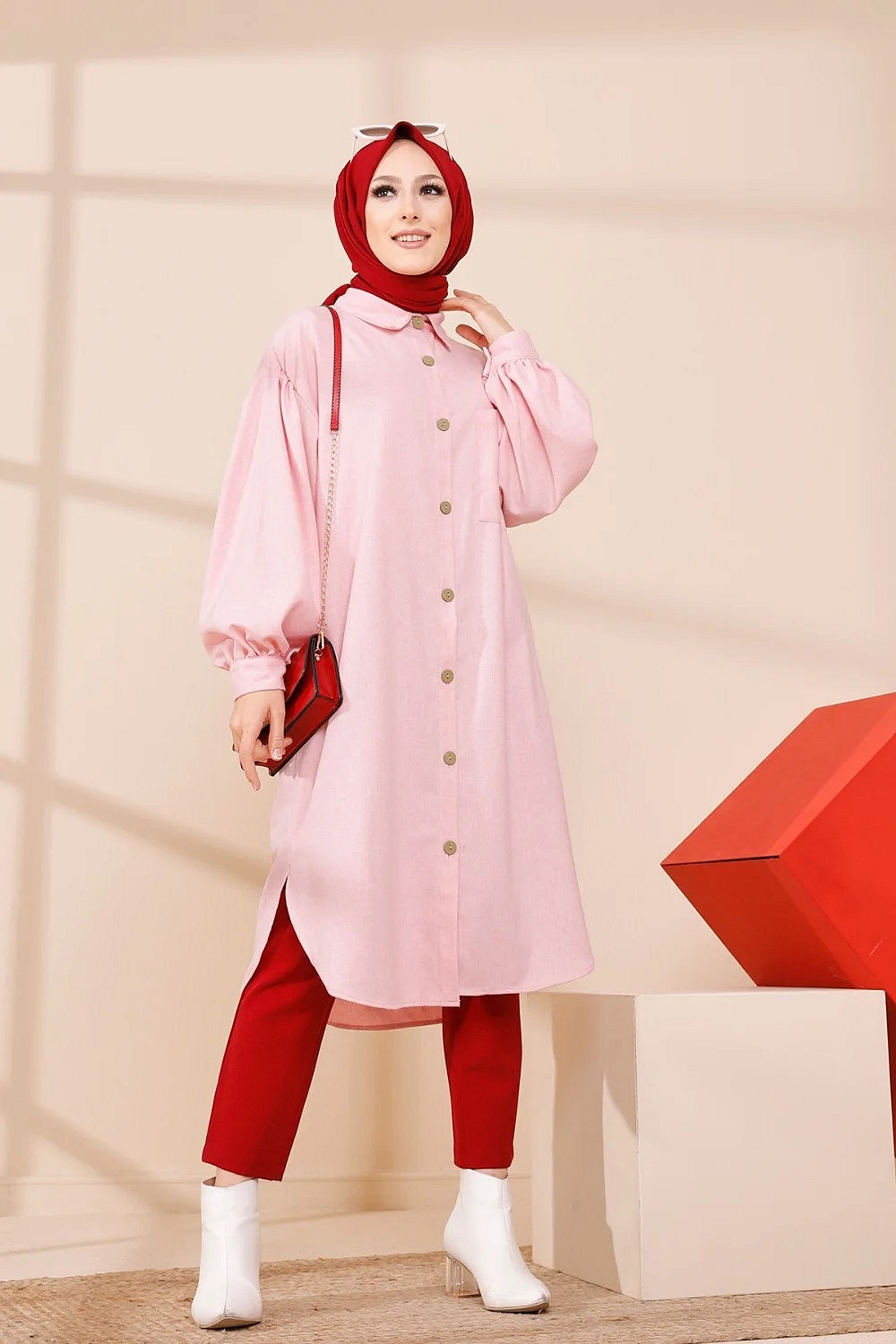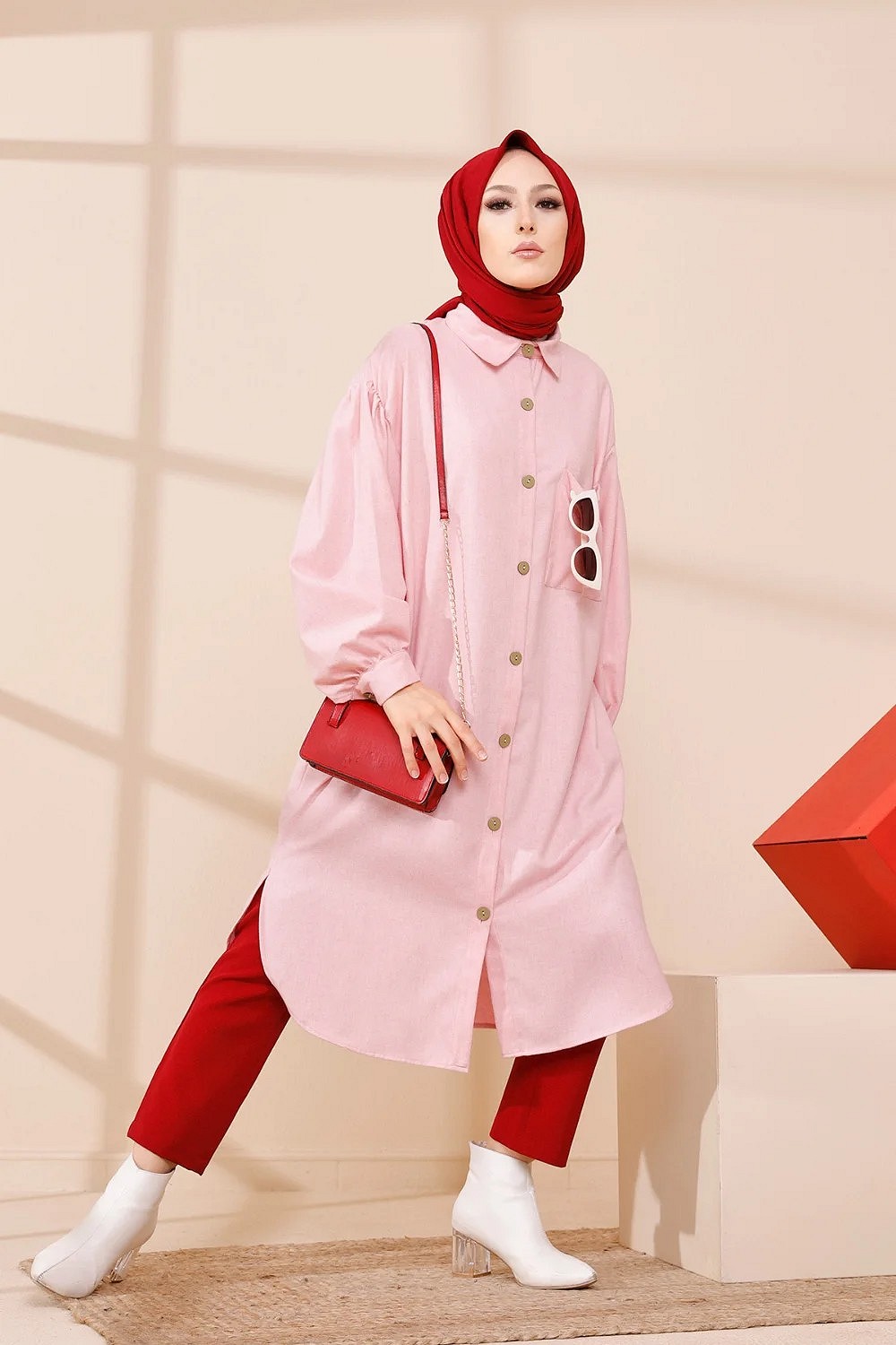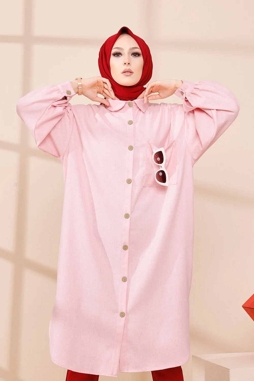 Chemise longue et ample pour femme (Vetement hijab tendance) - Couleur rose poudre