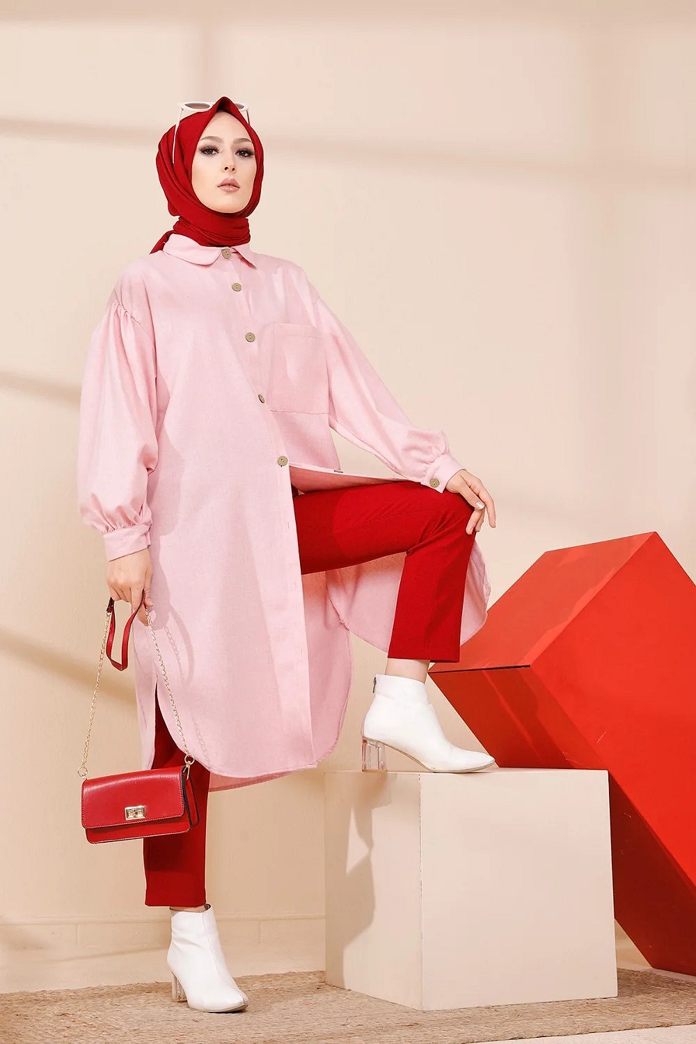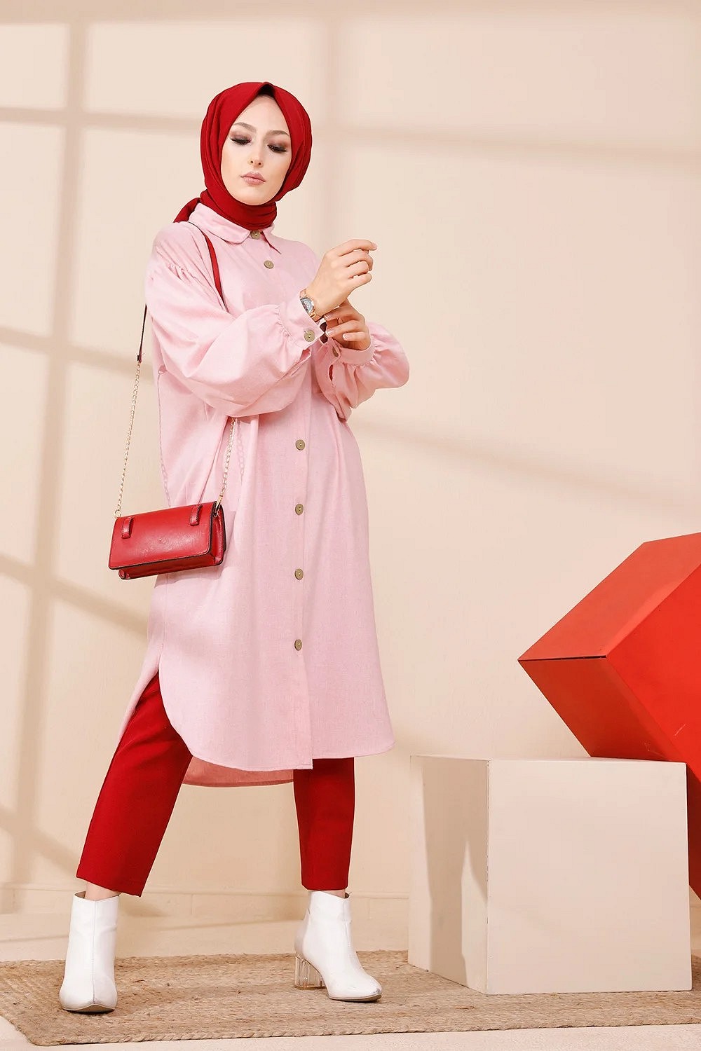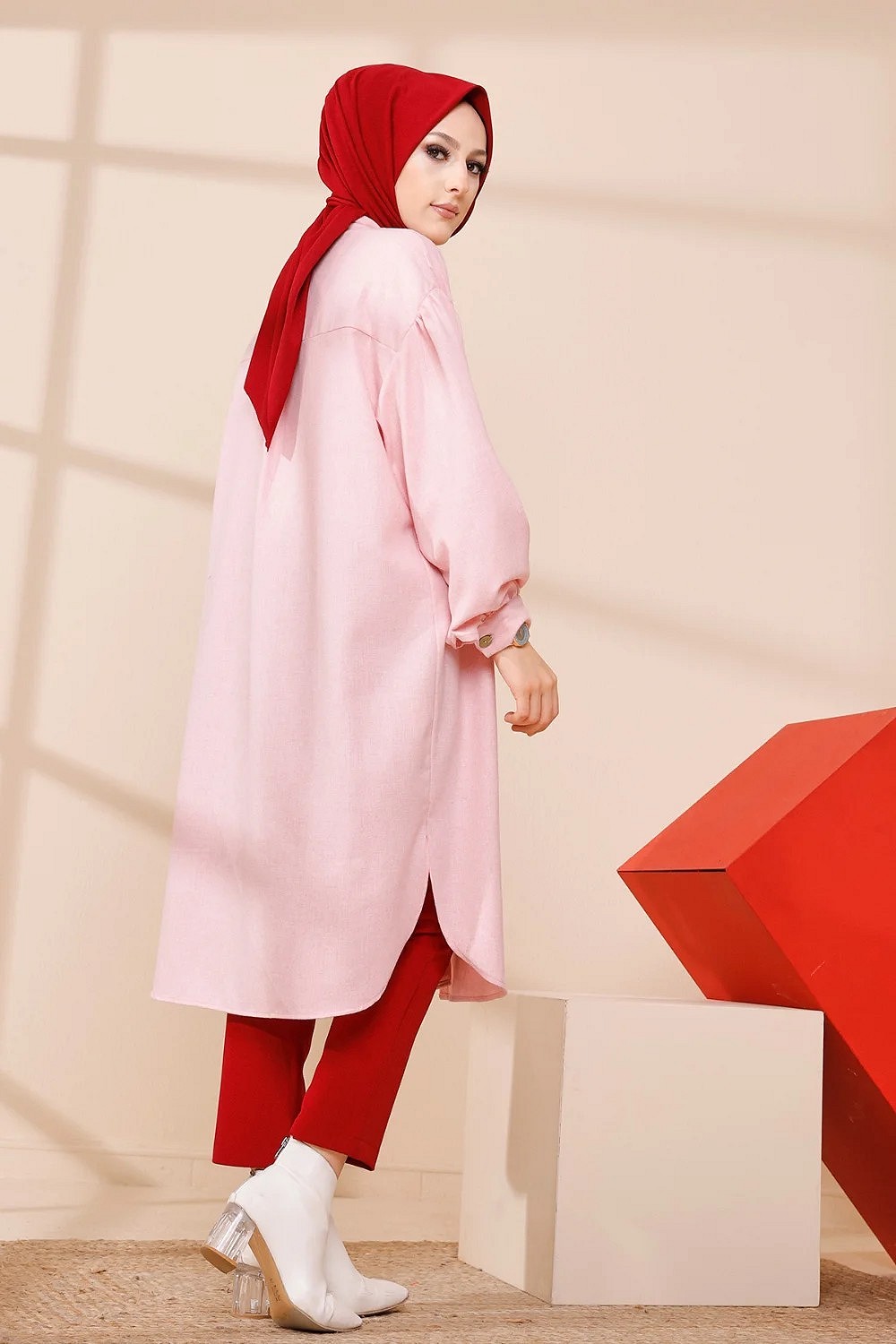 Chemise longue et ample pour femme (Vetement hijab tendance) - Couleur rose poudre