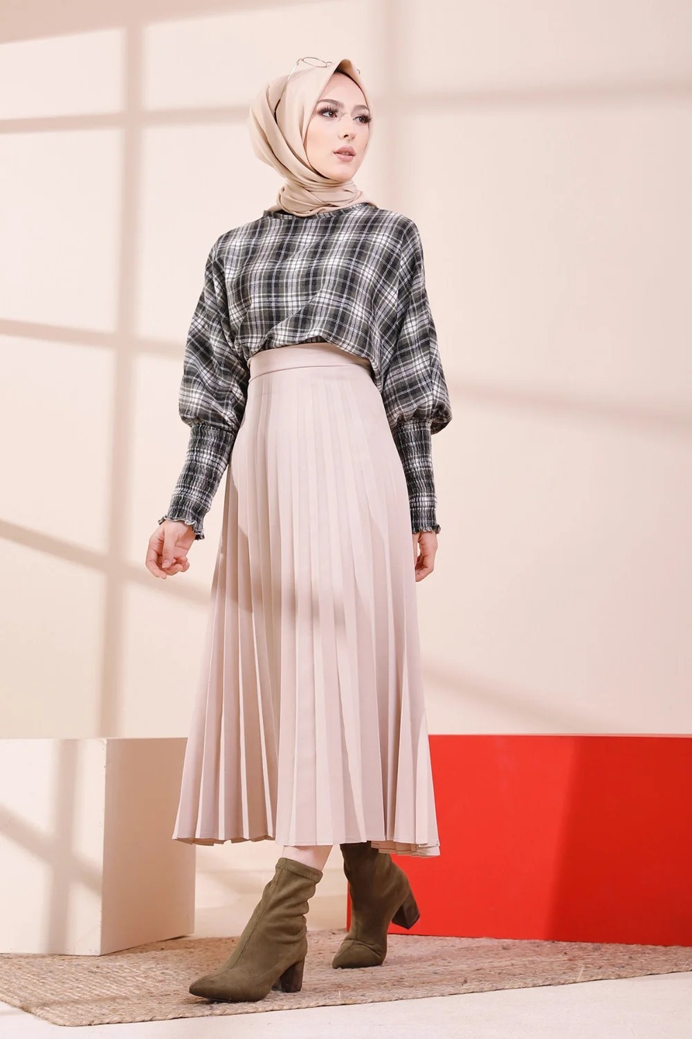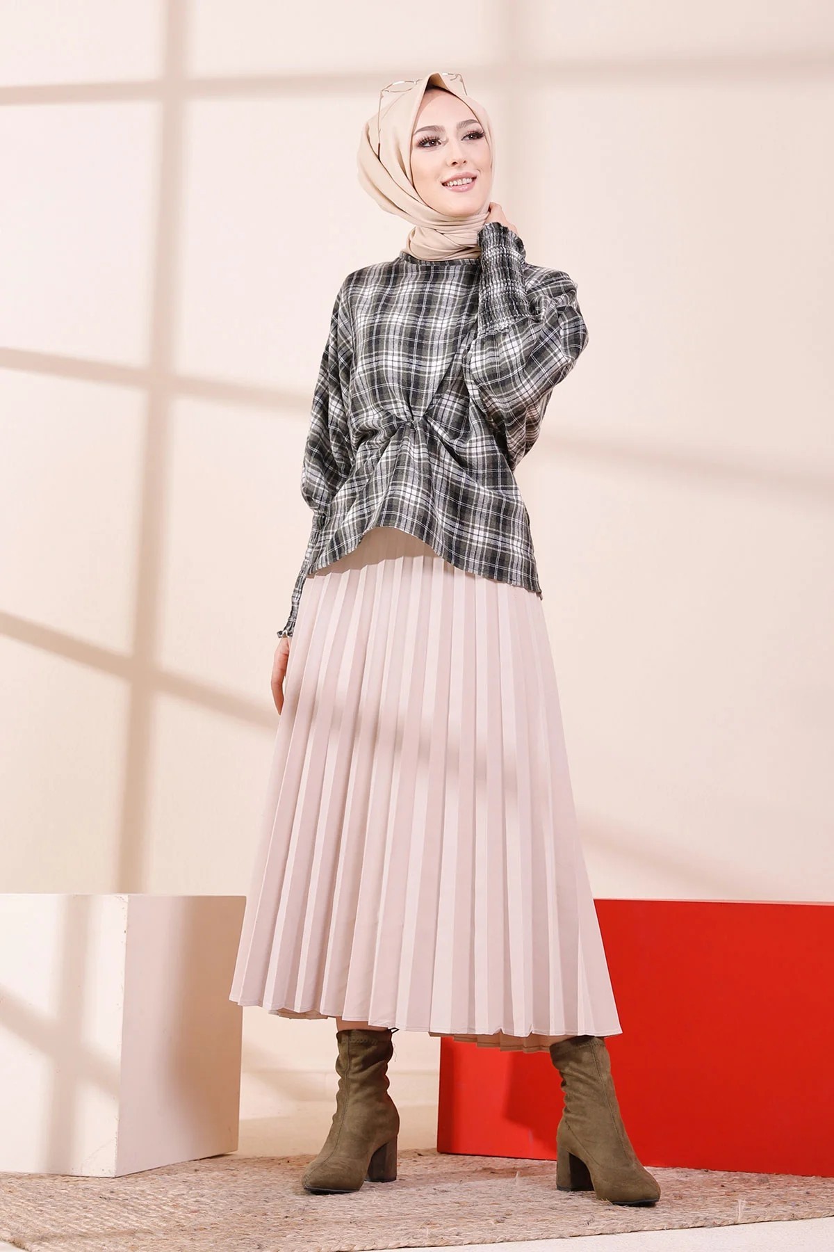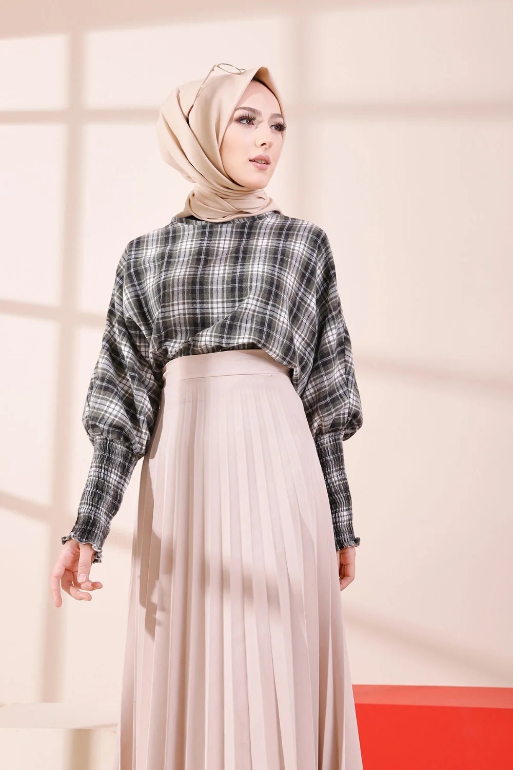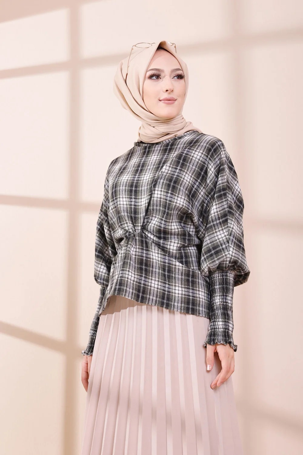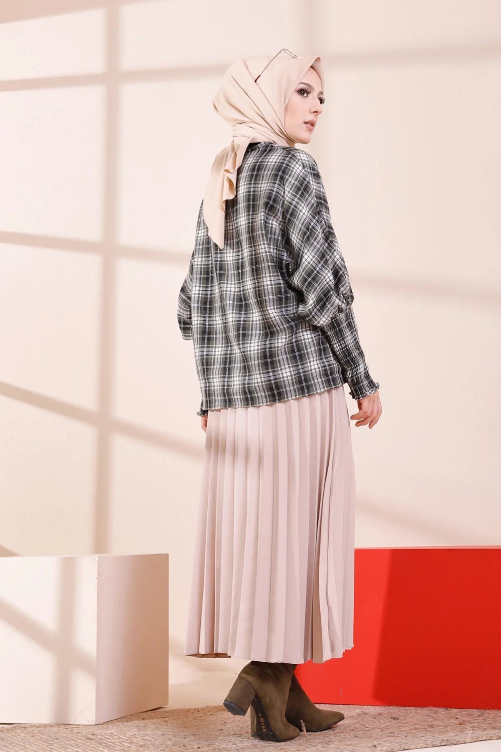 Chemisier a carreaux (Tenue Hijab Chic) - Couleur noir blanc et kaki