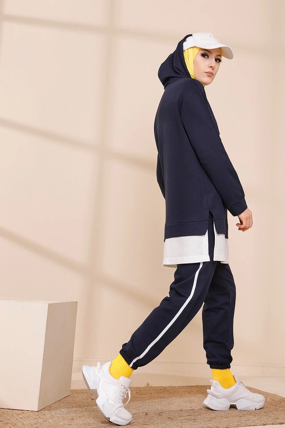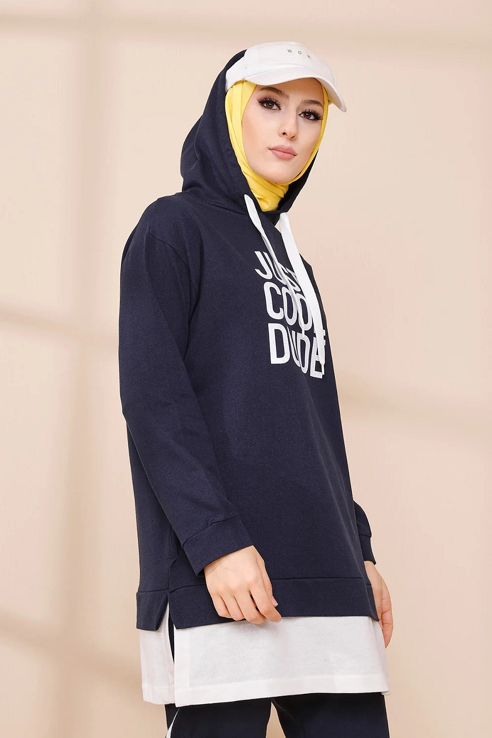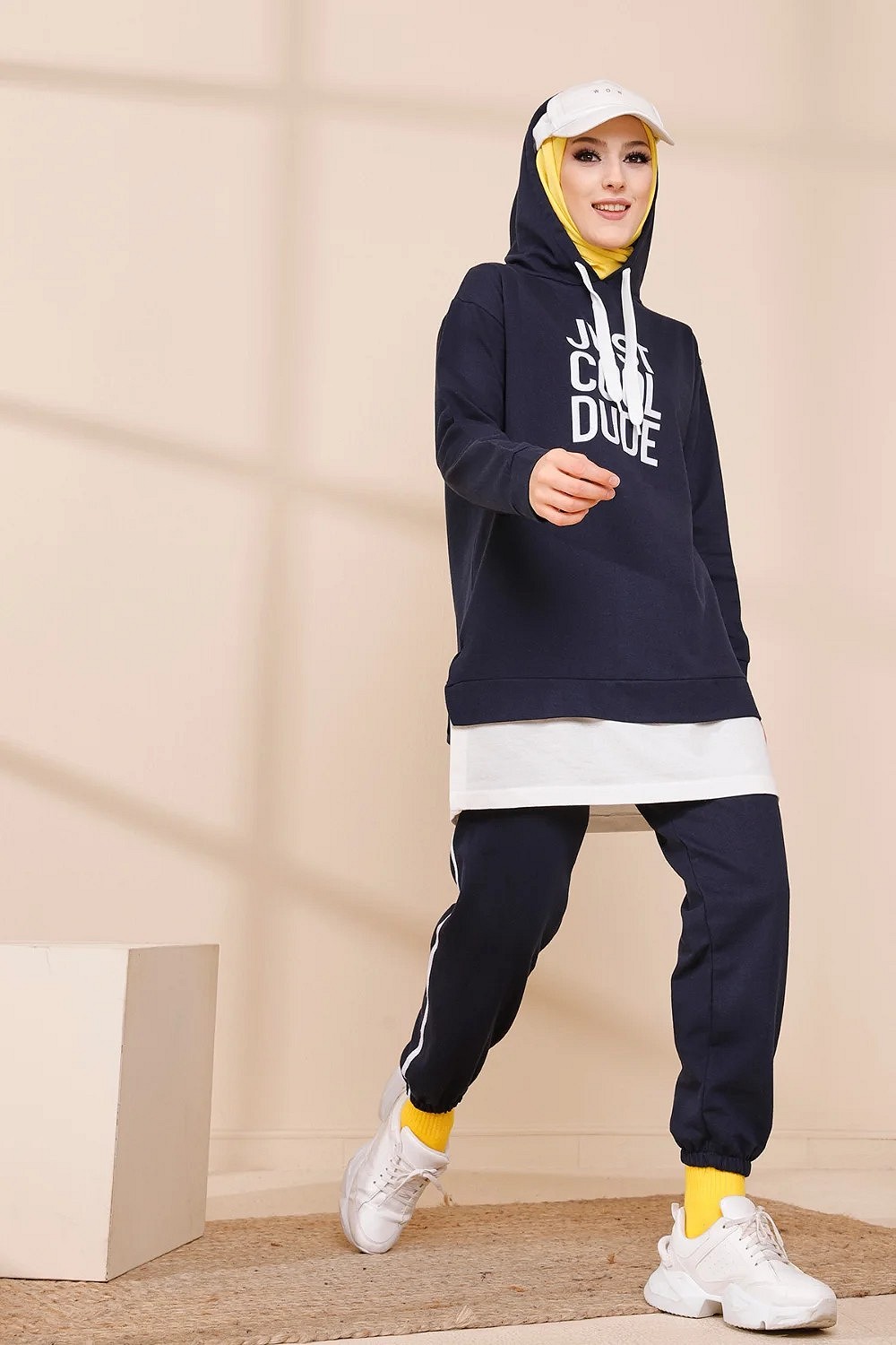Survêtement avec extension blanche - Sweat à capuche imprimé et pantalon (Boutique de vêtement Chic pour femme voilée) - Couleur bleu marine Vetement & Accessoire