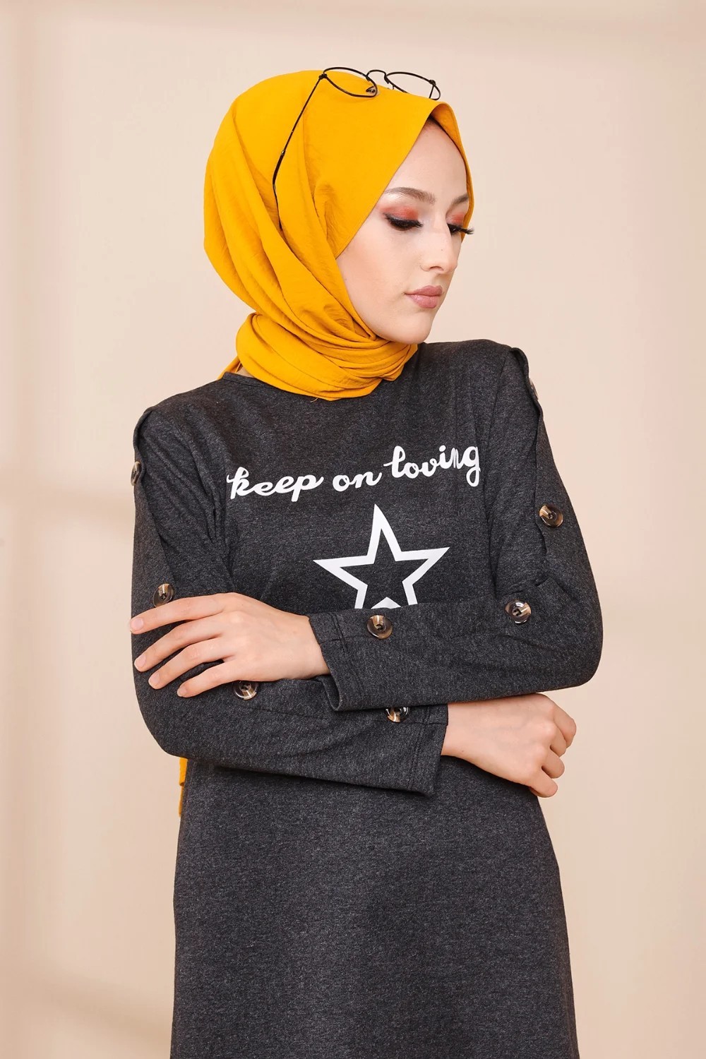 Tunique longue avec boutons imprimee etoile et "Keep on loving" - Couleur anthracite