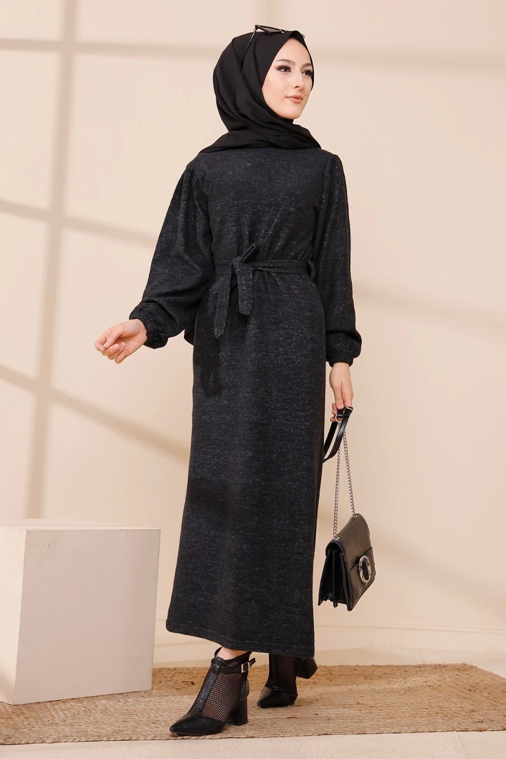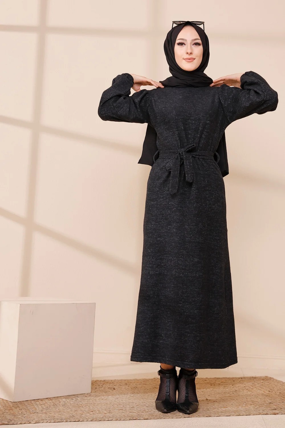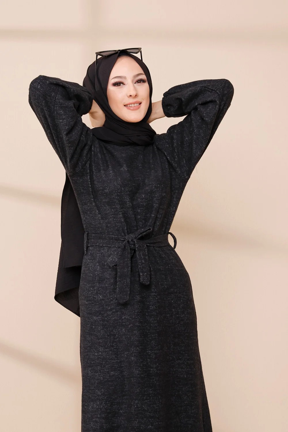 Robe tissu polaire avec ceinture (Vêtement Hijab Saison Automne-Hiver) - Couleur noir Vetement & Accessoire