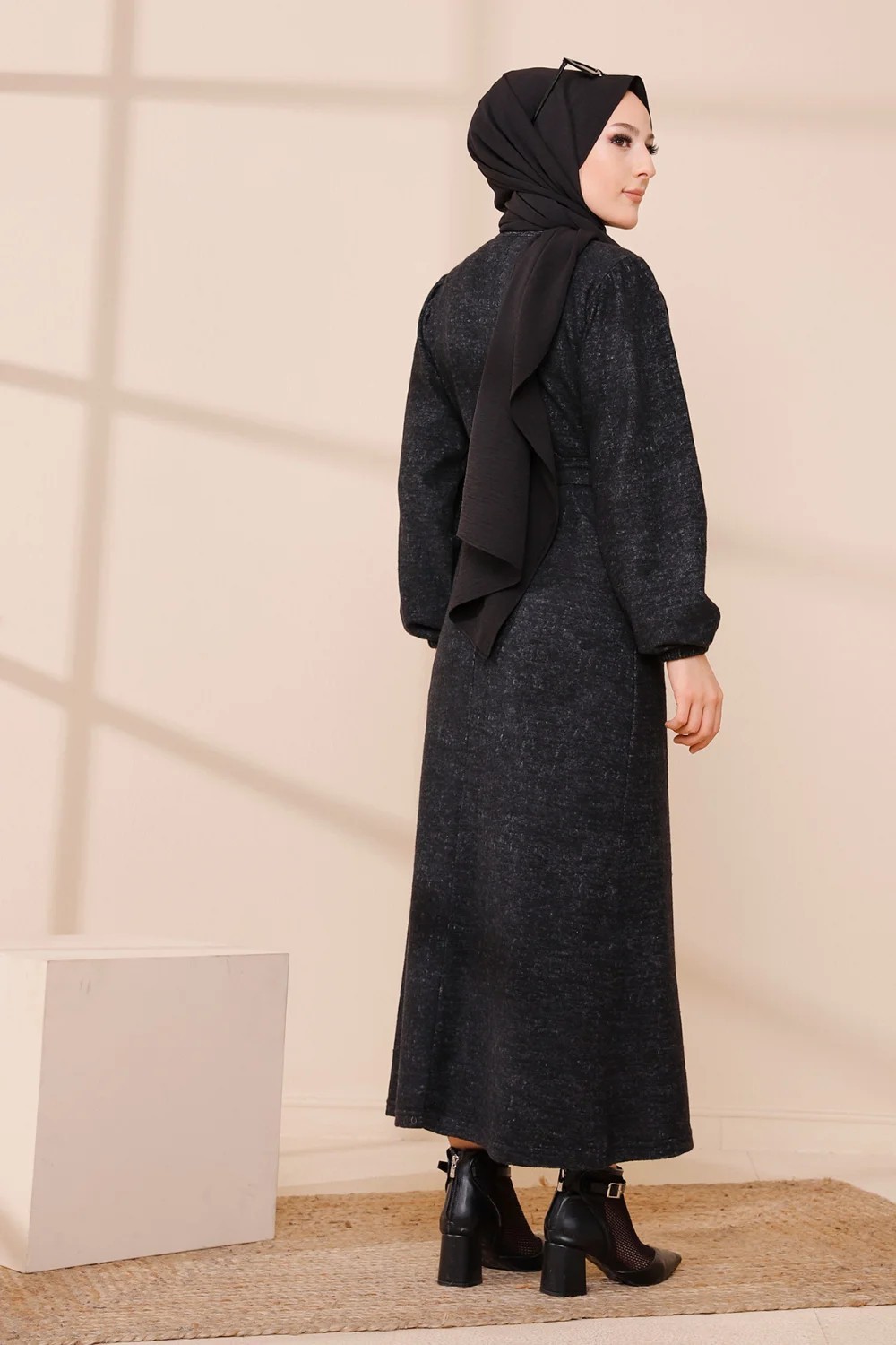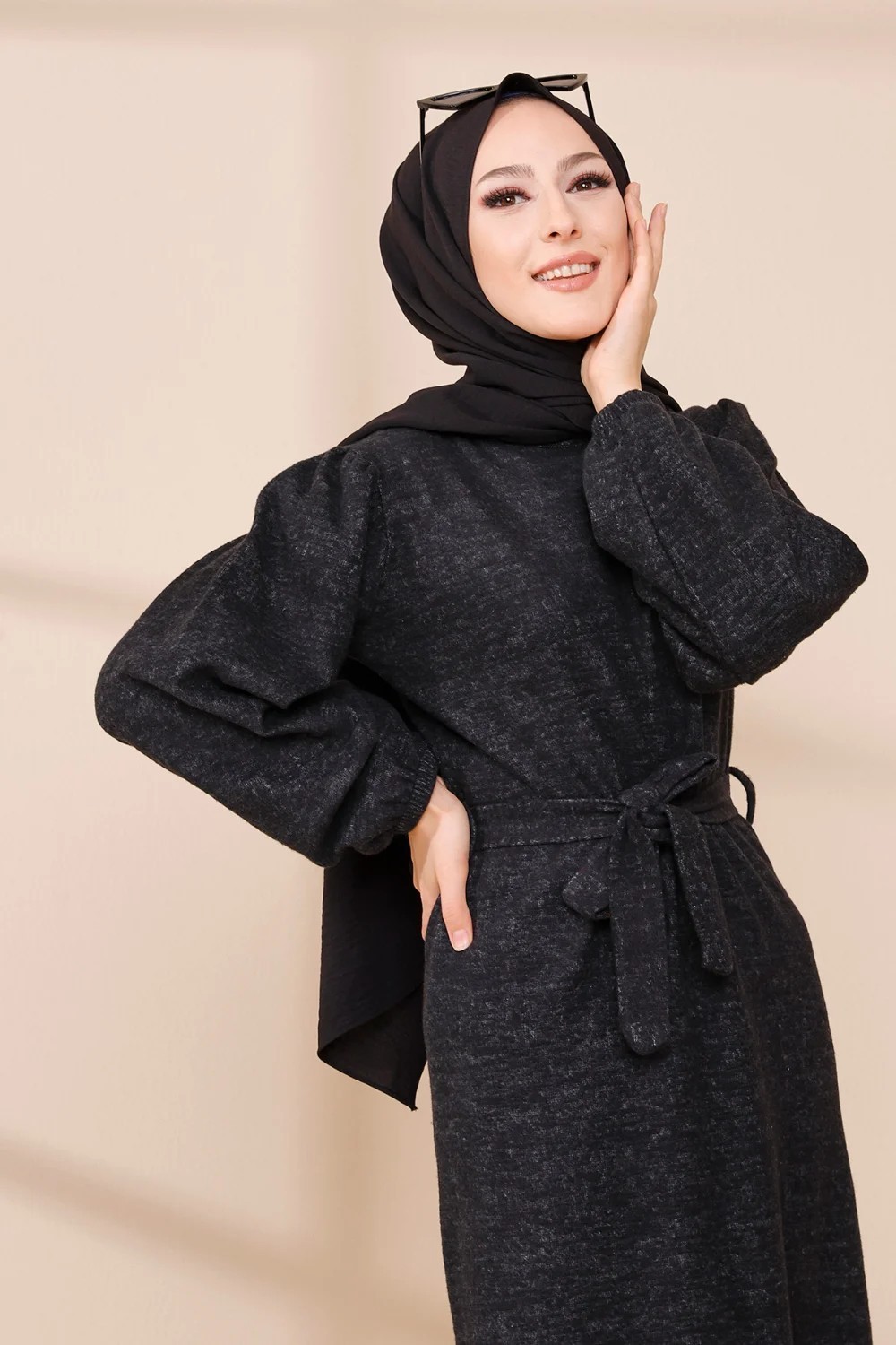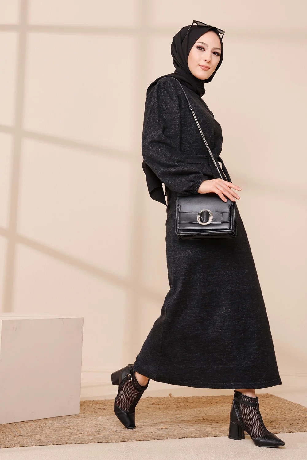 Robe tissu polaire avec ceinture (Vêtement Hijab Saison Automne-Hiver) - Couleur noir Vetement & Accessoire