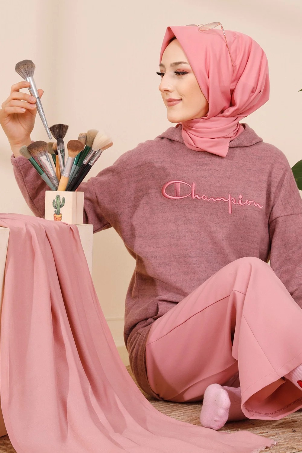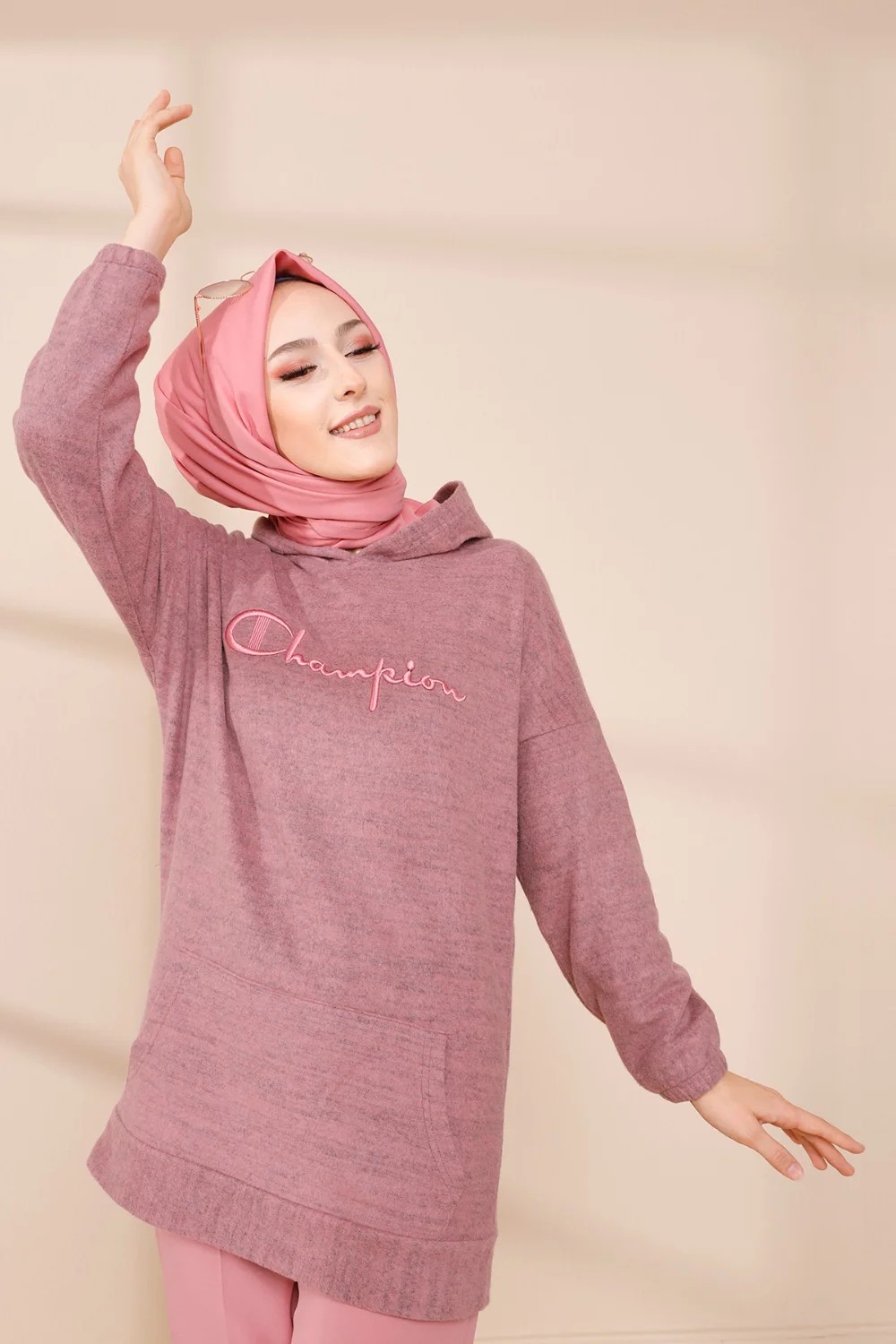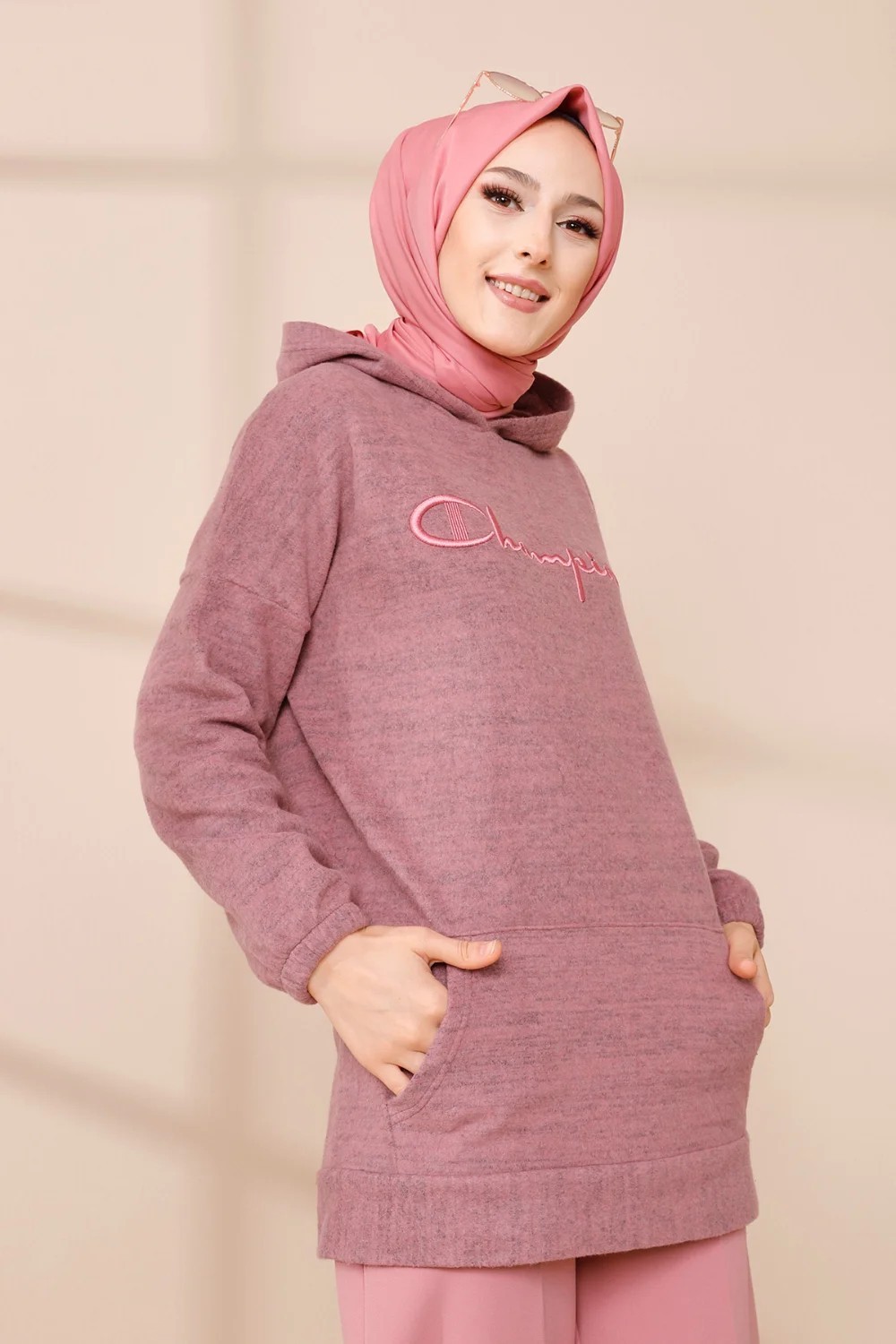 Sweat femme avec capuche brodé "Champion" (Vêtements Automne-Hiver) - Couleur saumon Vetement & Accessoire