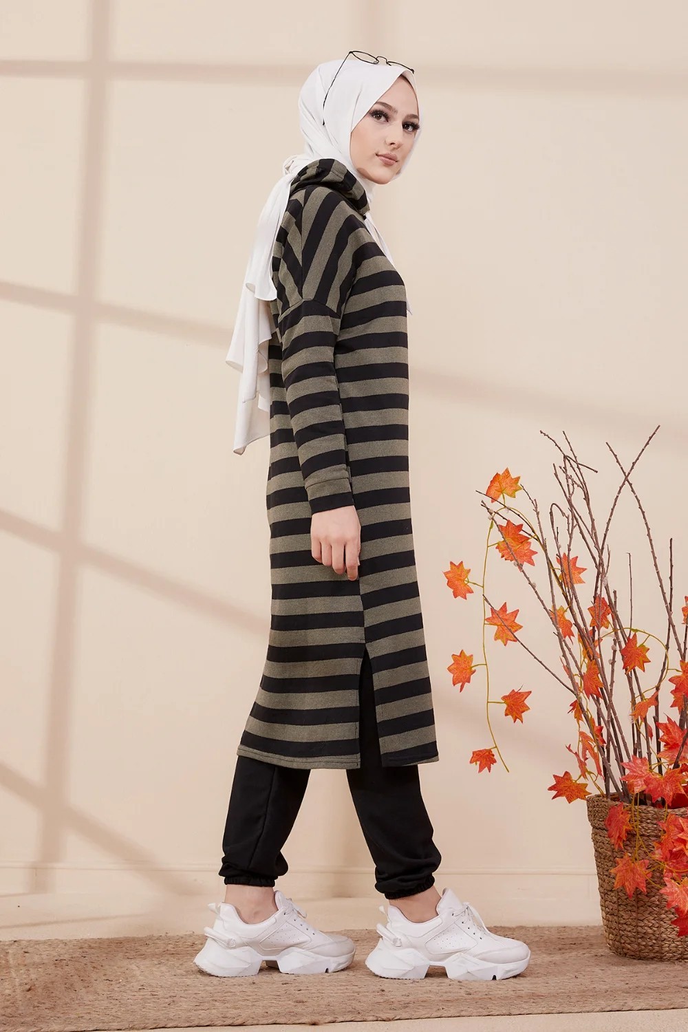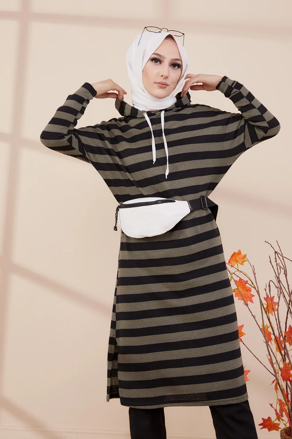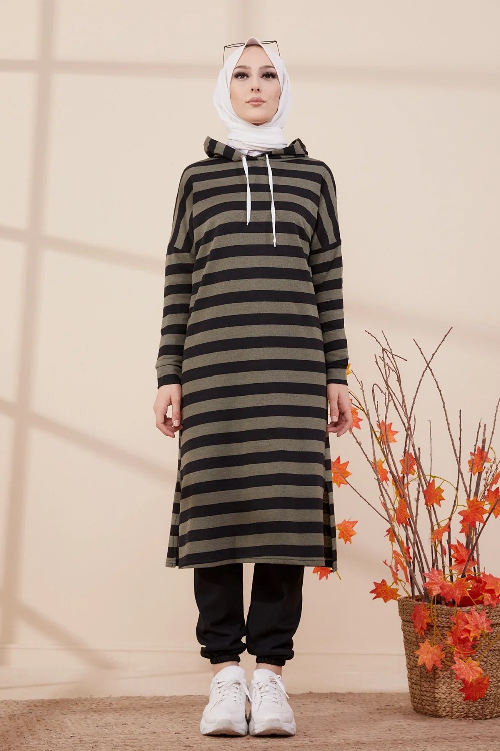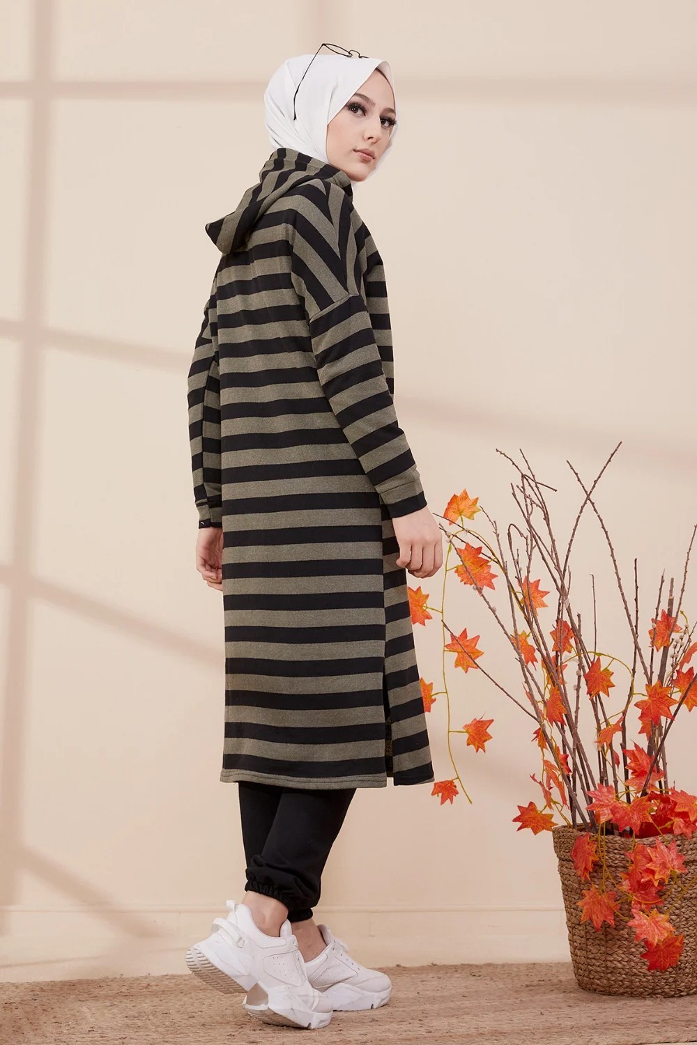 Tunique longue à rayures avec capuche (Vêtement moderne et sport pour hijab) - Couleur vert kaki Vetement & Accessoire