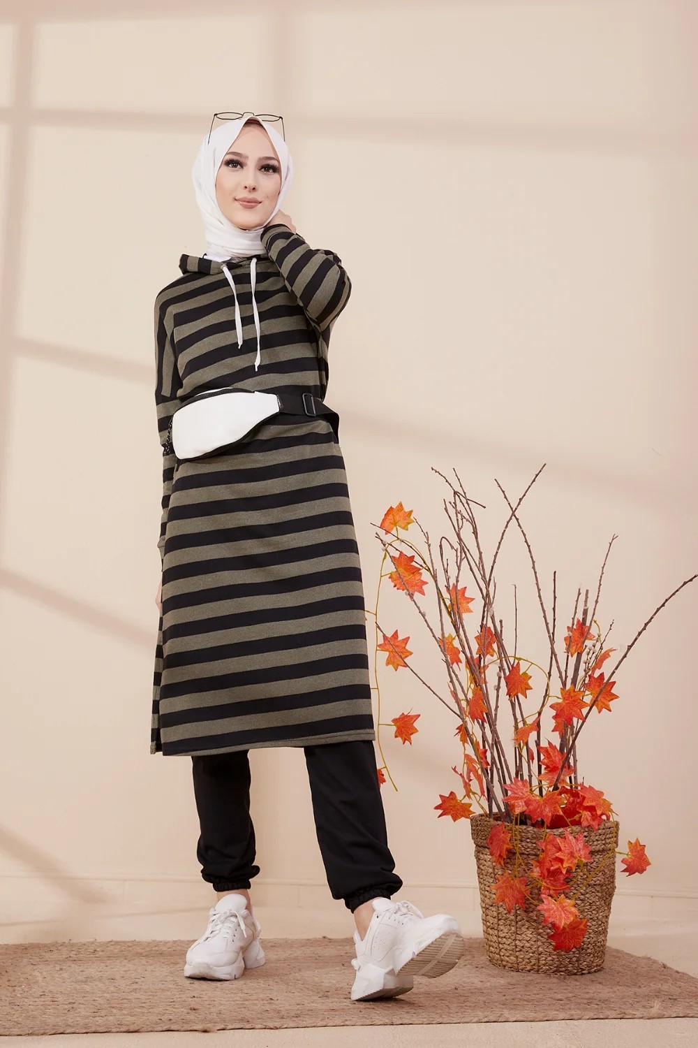 Tunique longue a rayures avec capuche (Vetement moderne et sport pour hijab) - Couleur vert kaki