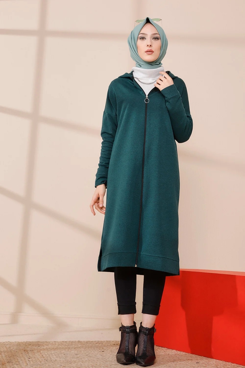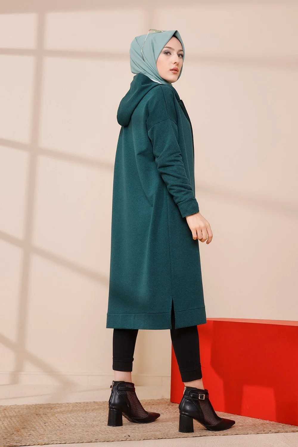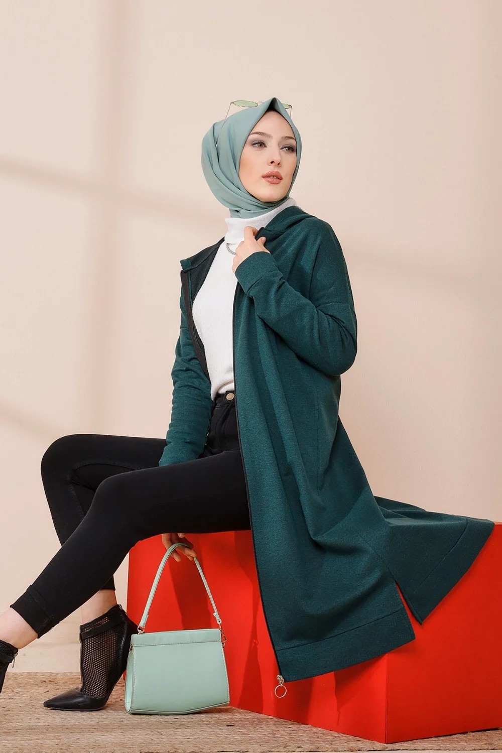 Cardigan Gilet long zippé style décontracté et sport col à capuche pour femme voilée - Couleur vert émeraude Vetement & Accessoire