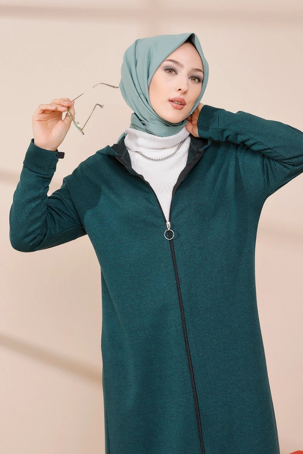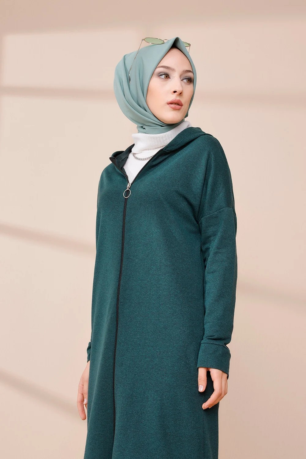 Cardigan Gilet long zippe style decontracte et sport col a capuche pour femme voilee - Couleur vert emeraude