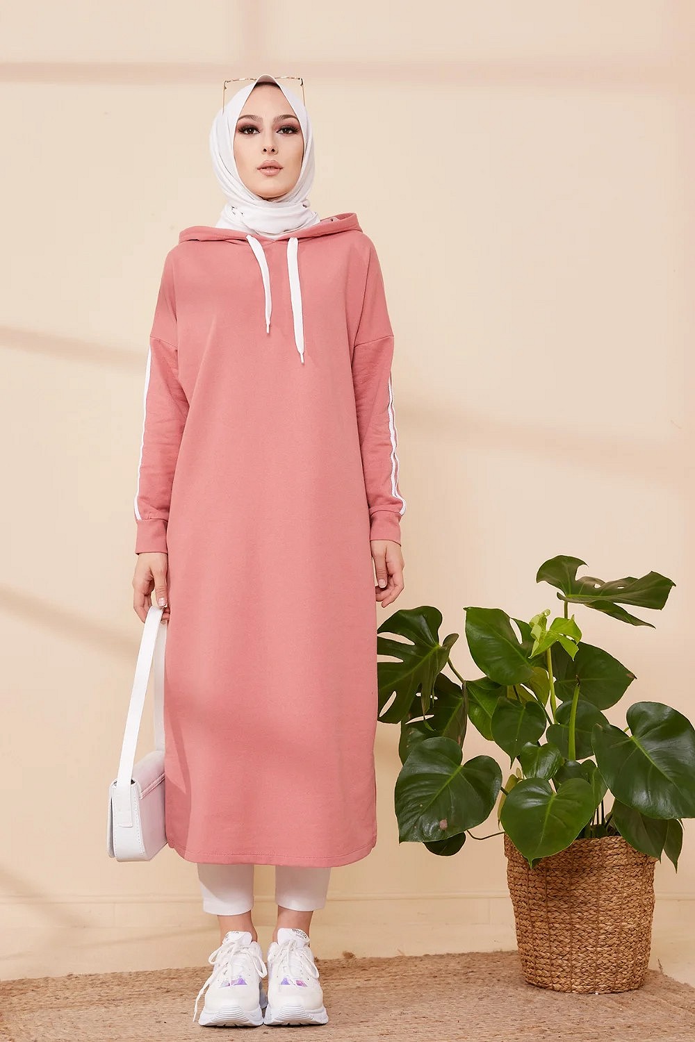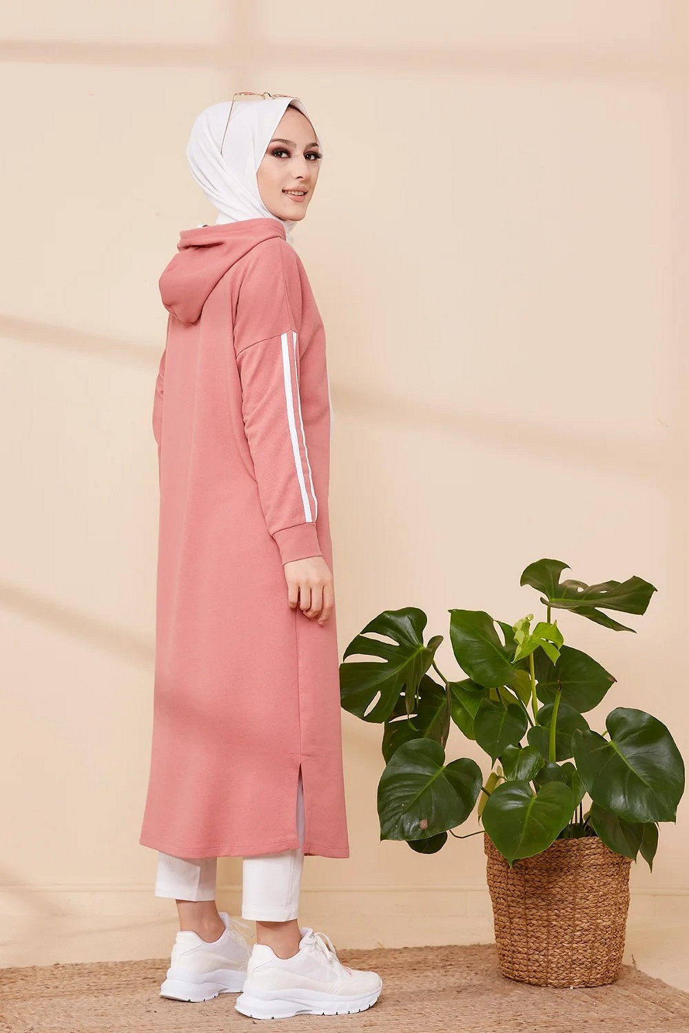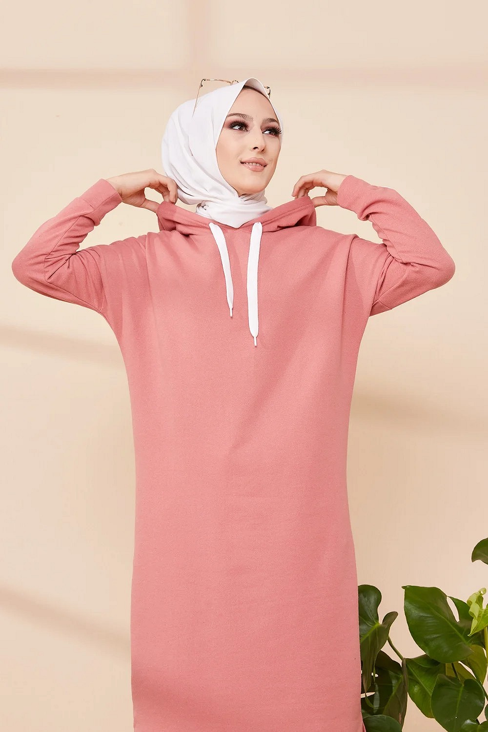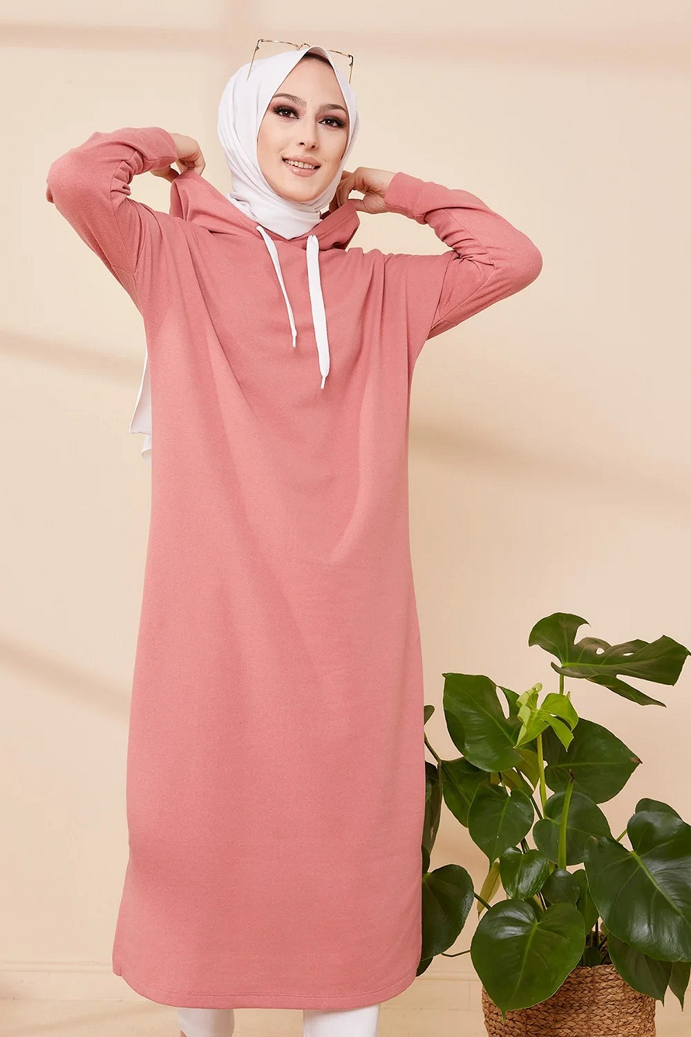 Tunique avec capuche pour femme (Vetement decontracte mastour pour hijab) - Couleur vieux rose