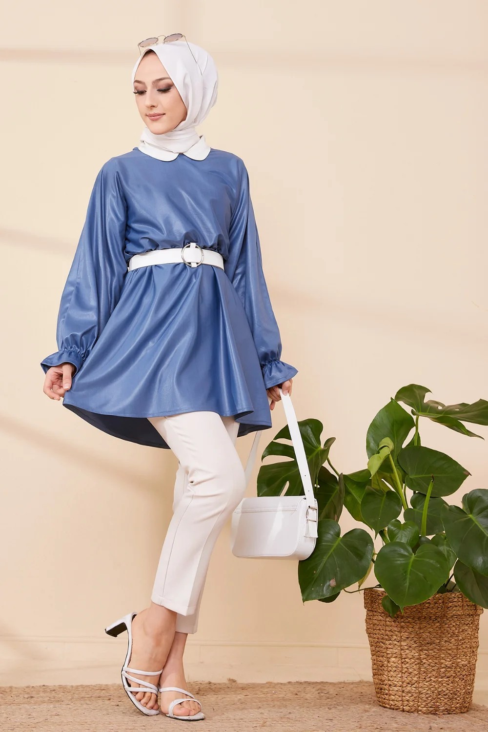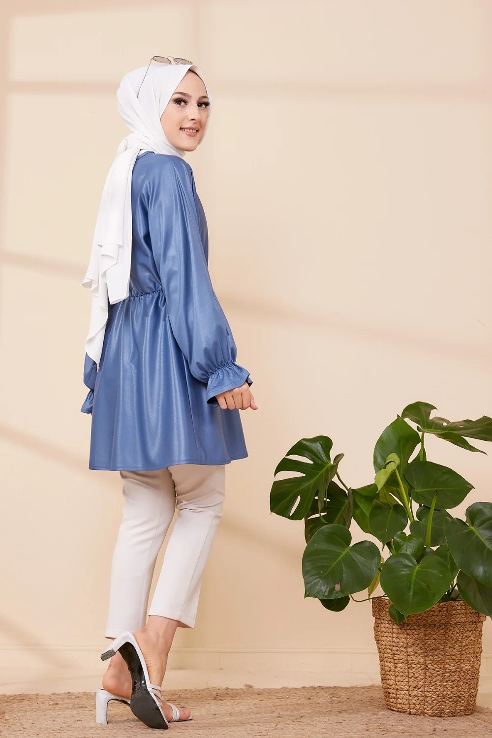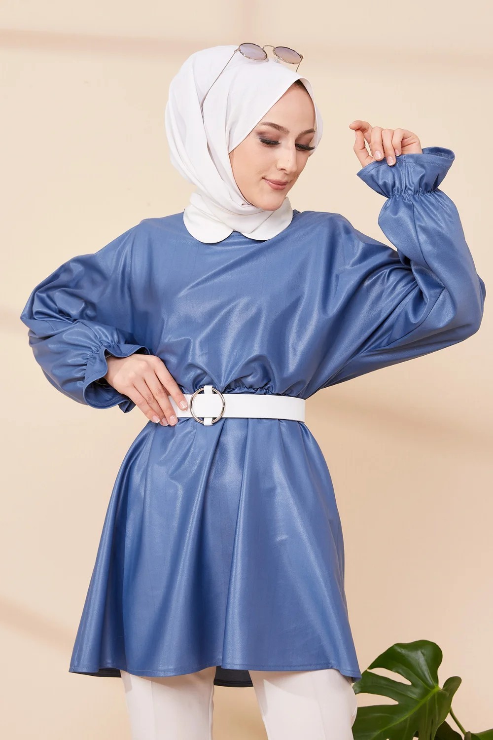 Tunique en skaï (simili cuir) pour femme (Vêtement hijab) - Couleur bleu indigo Vetement & Accessoire
