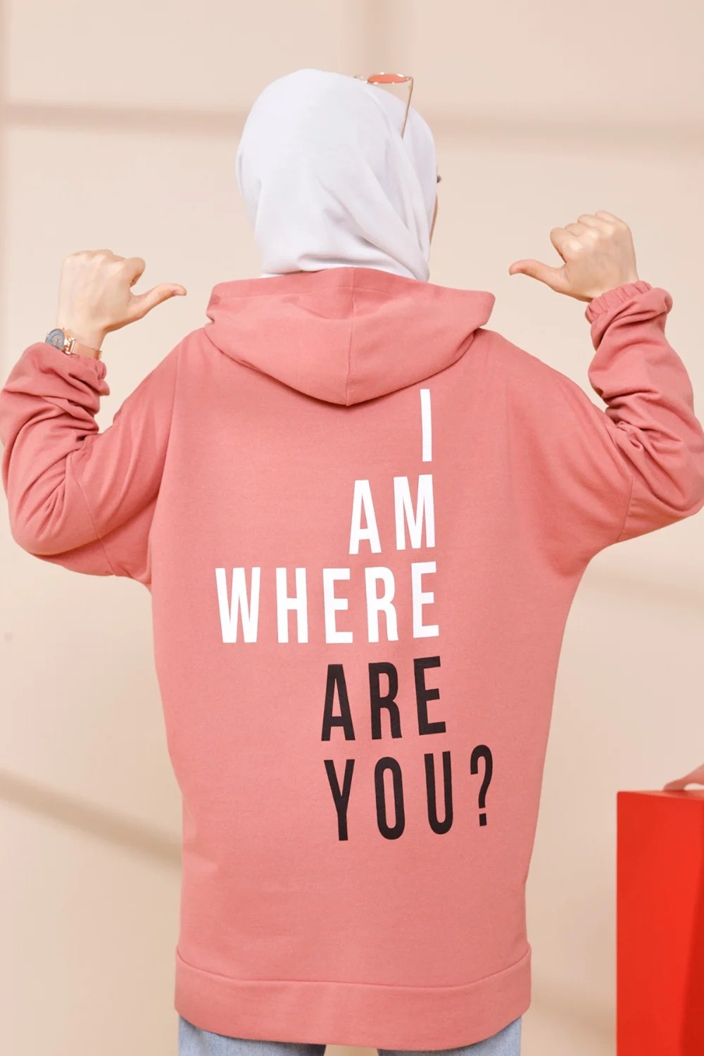 Sweat ample à capuche pour femme imprimé au dos "I am where are you?" (Tunique décontractée pour Hijab) - Couleur rose Vetement & Accessoire