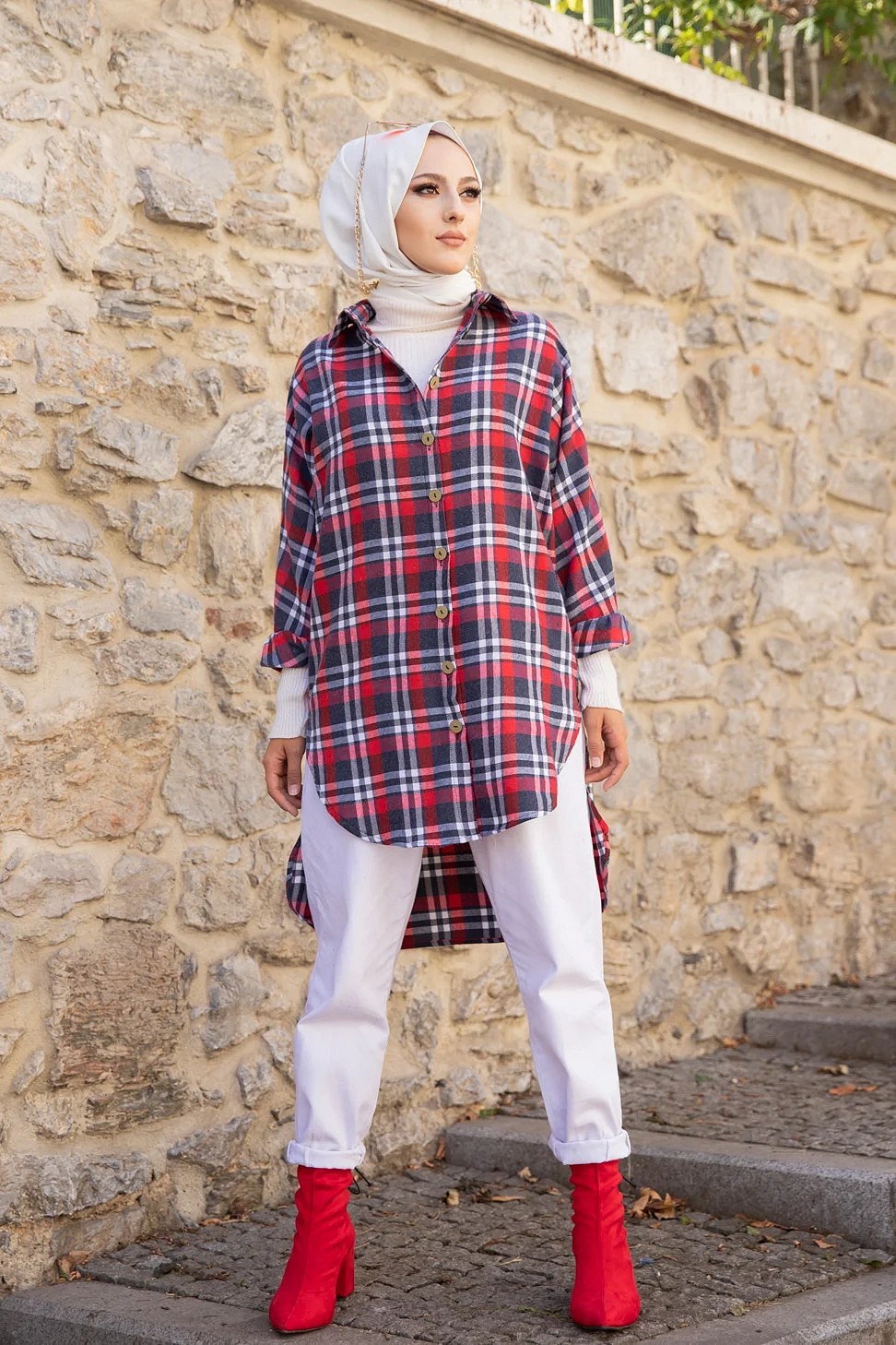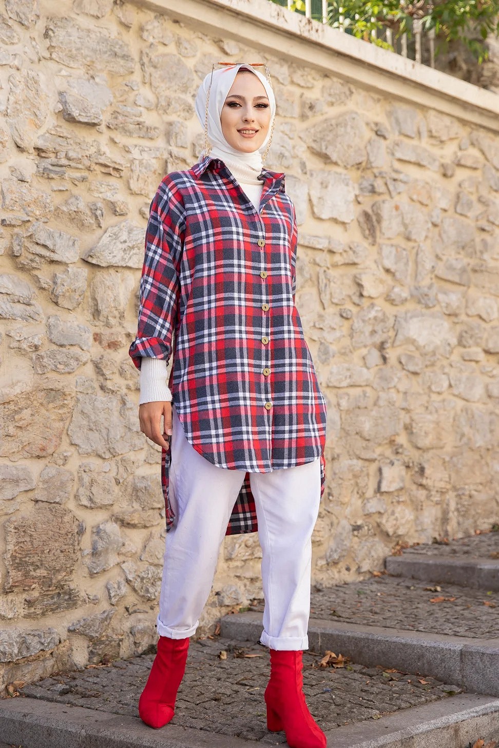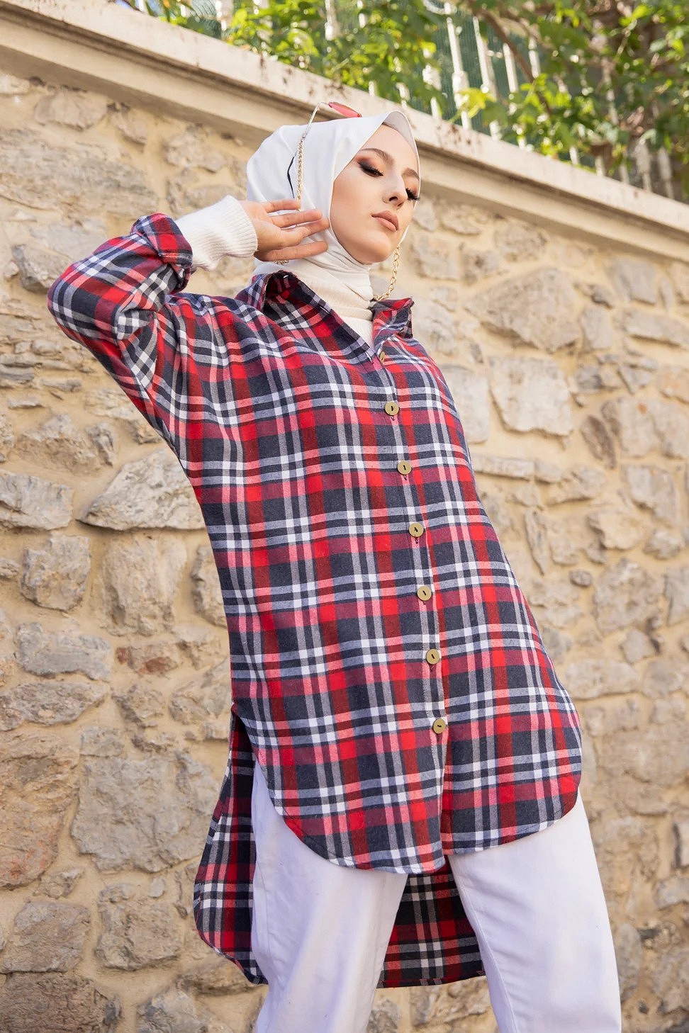 Chemise - Tunique à carreaux (Vêtement hijab pour femme) - Couleur noir et rouge Vetement & Accessoire