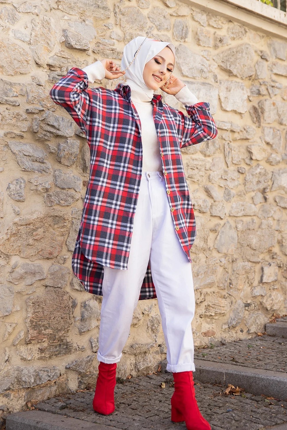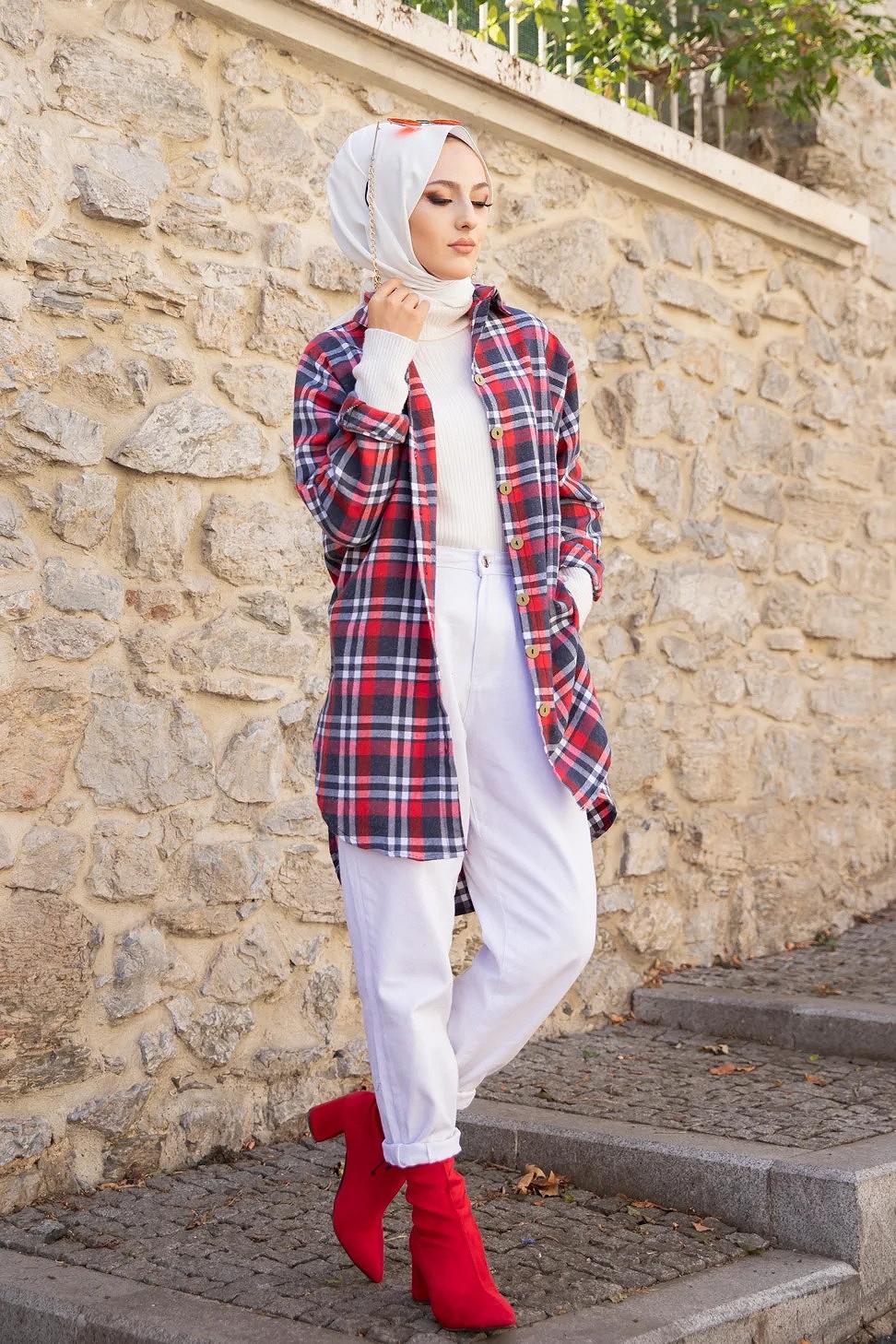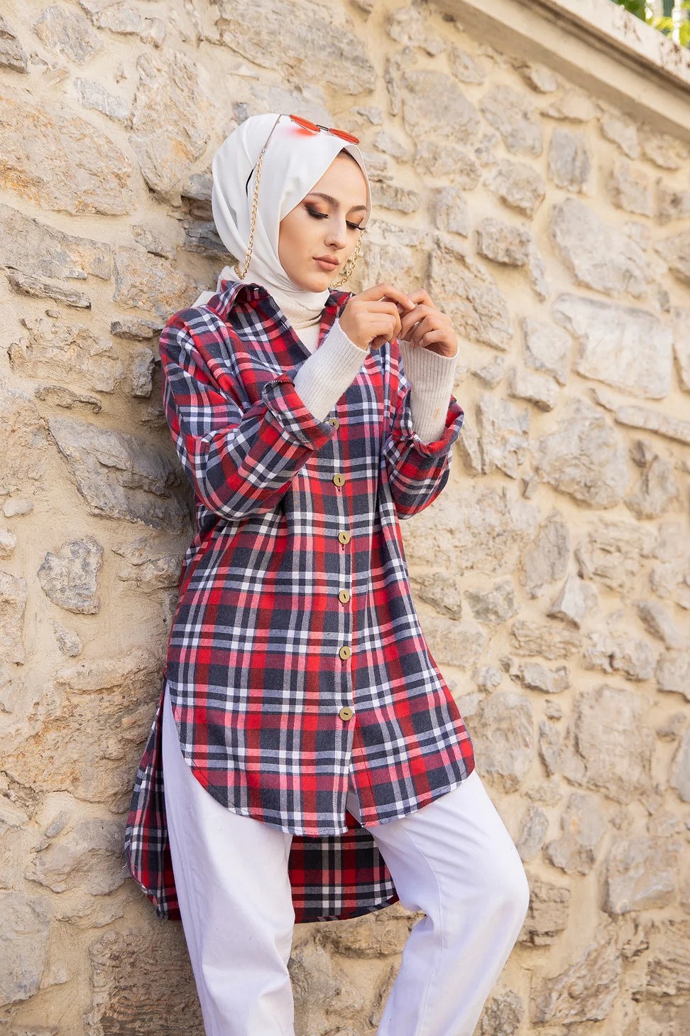 Chemise - Tunique à carreaux (Vêtement hijab pour femme) - Couleur noir et rouge Vetement & Accessoire