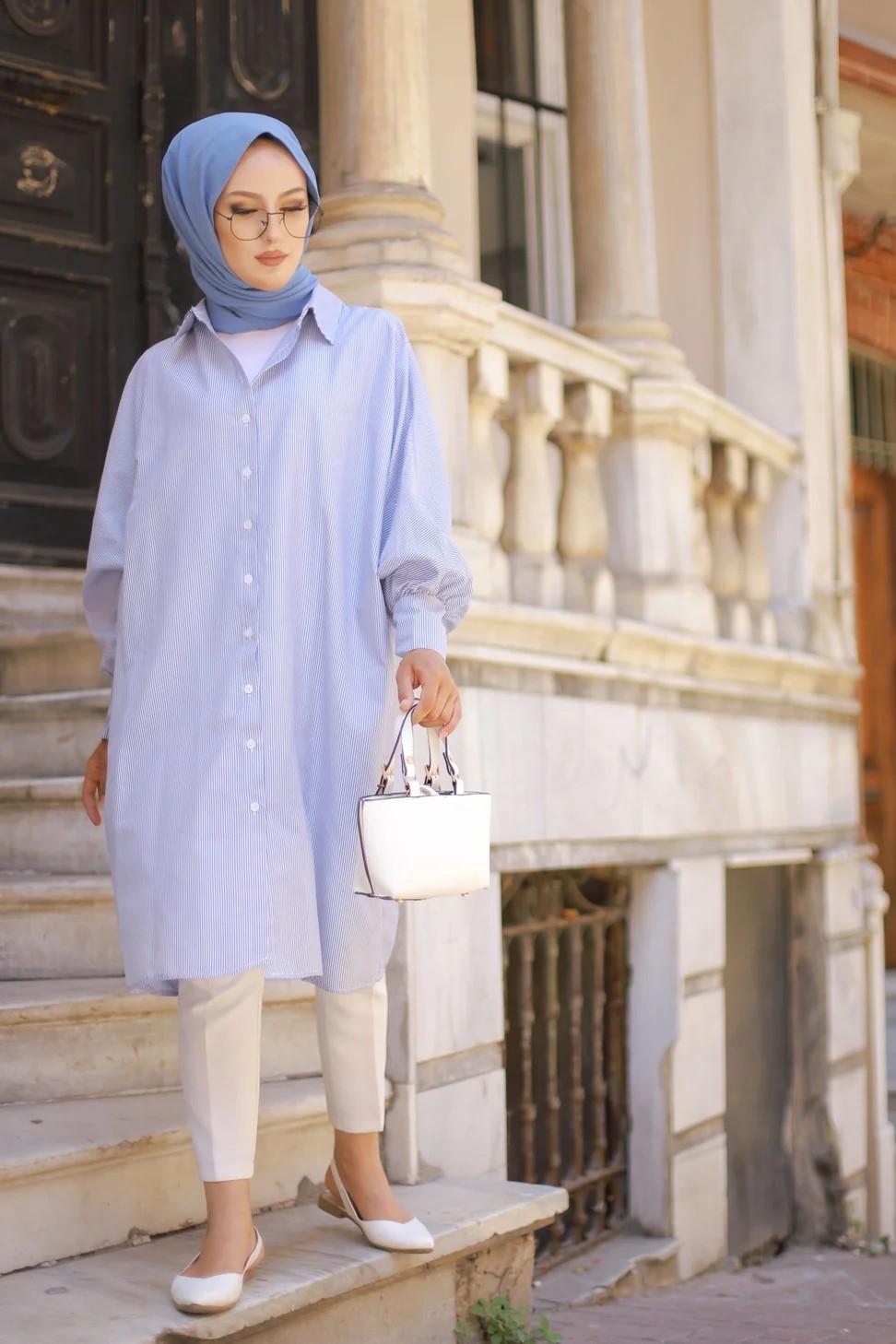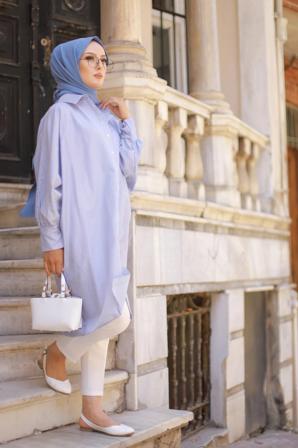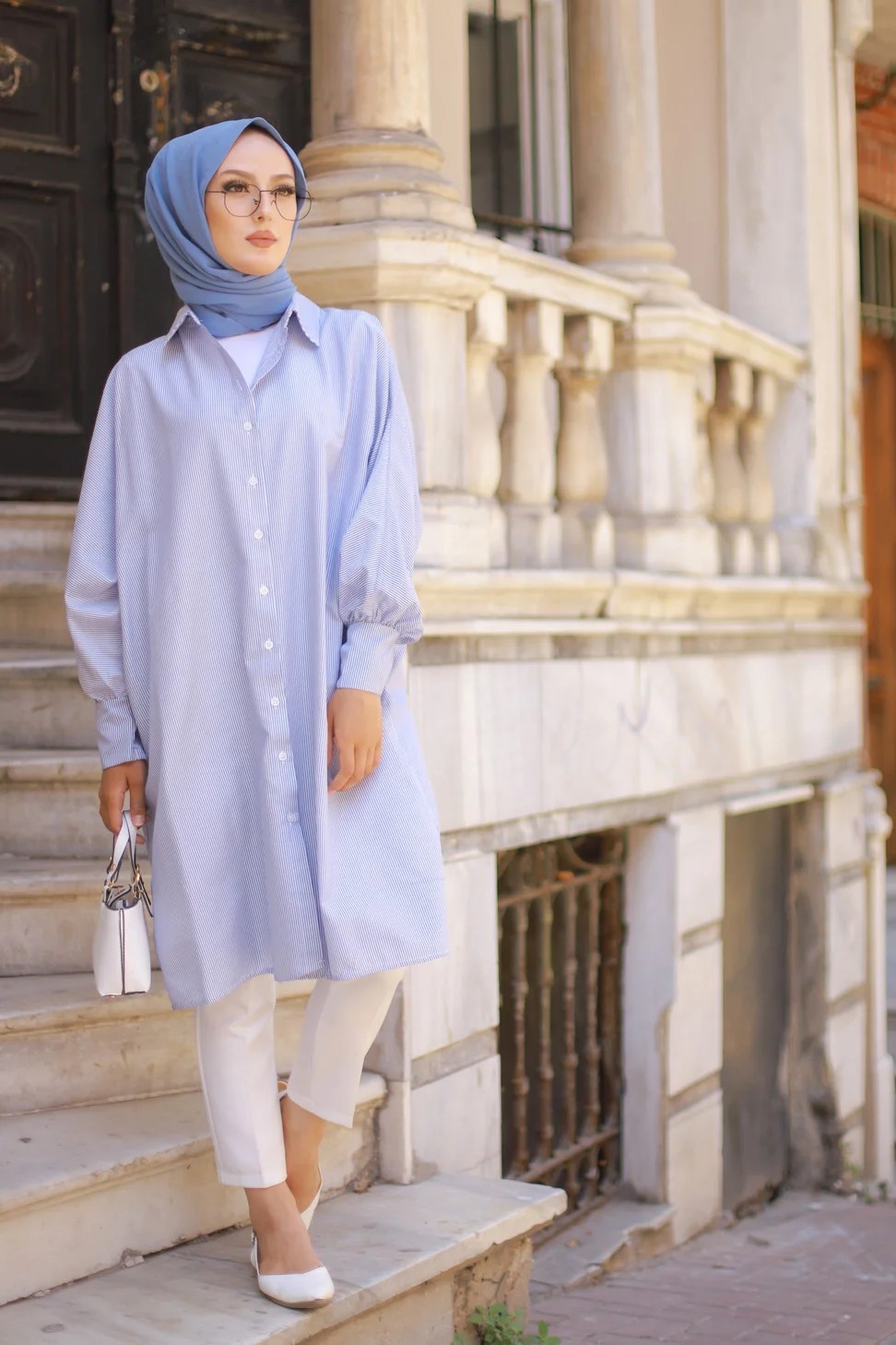 Chemise-Tunique casual ample à rayures bleu clair (Nouveauté Tenue Hijab pour femme voilée) - REF. 33948 (25.00 €)