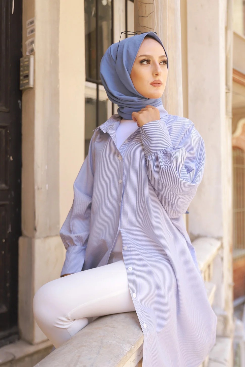 Chemise-Tunique longue à rayures (Vêtements pour femme voilée - Collection Mode musulmane) - Couleur bleu Vetement & Accessoire
