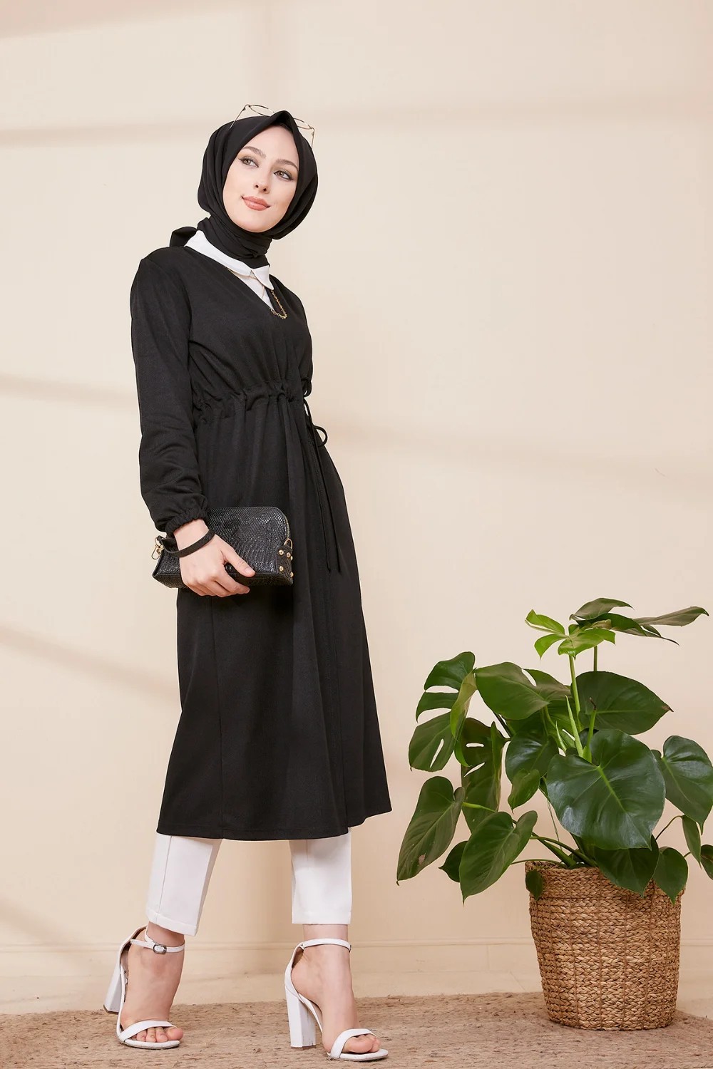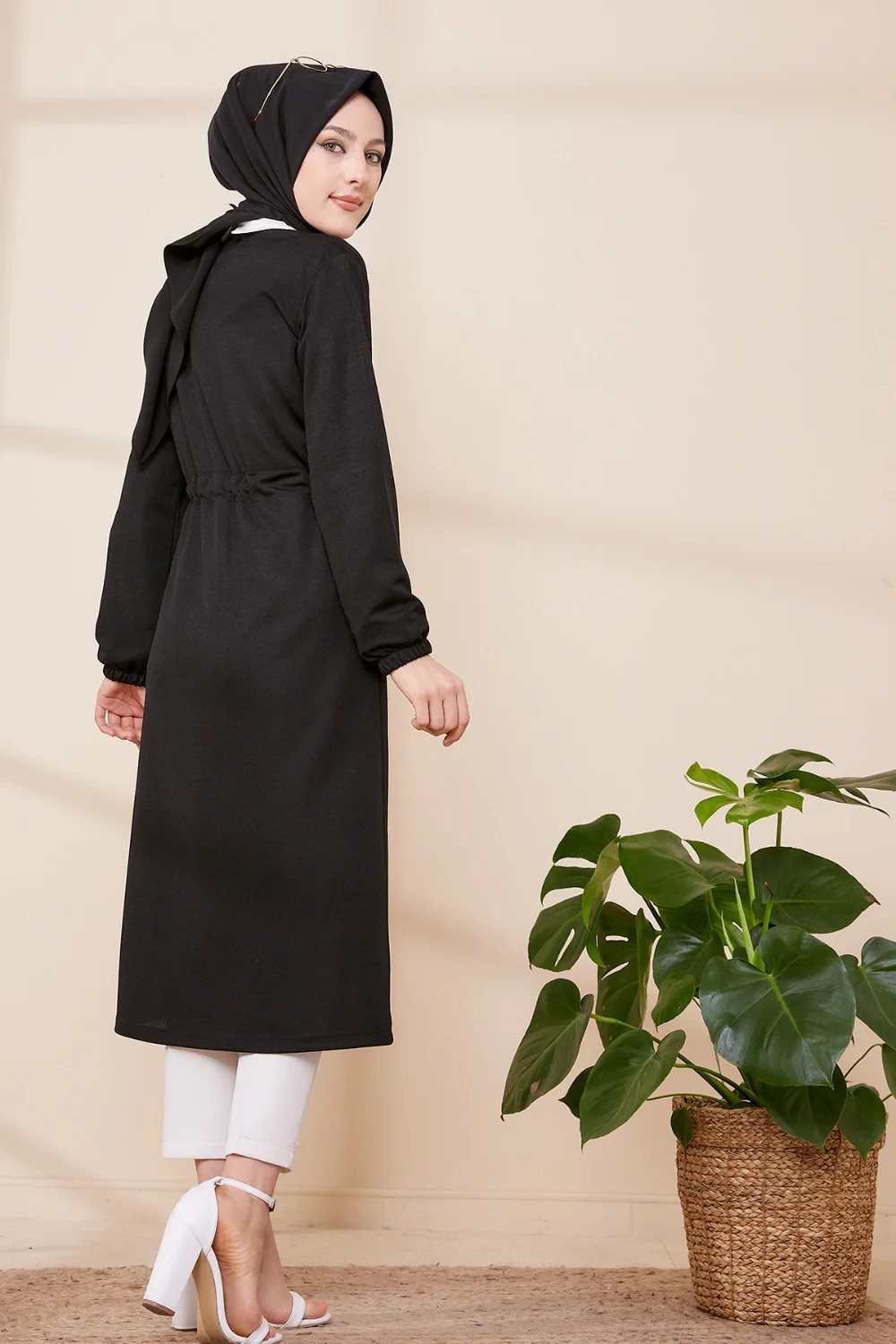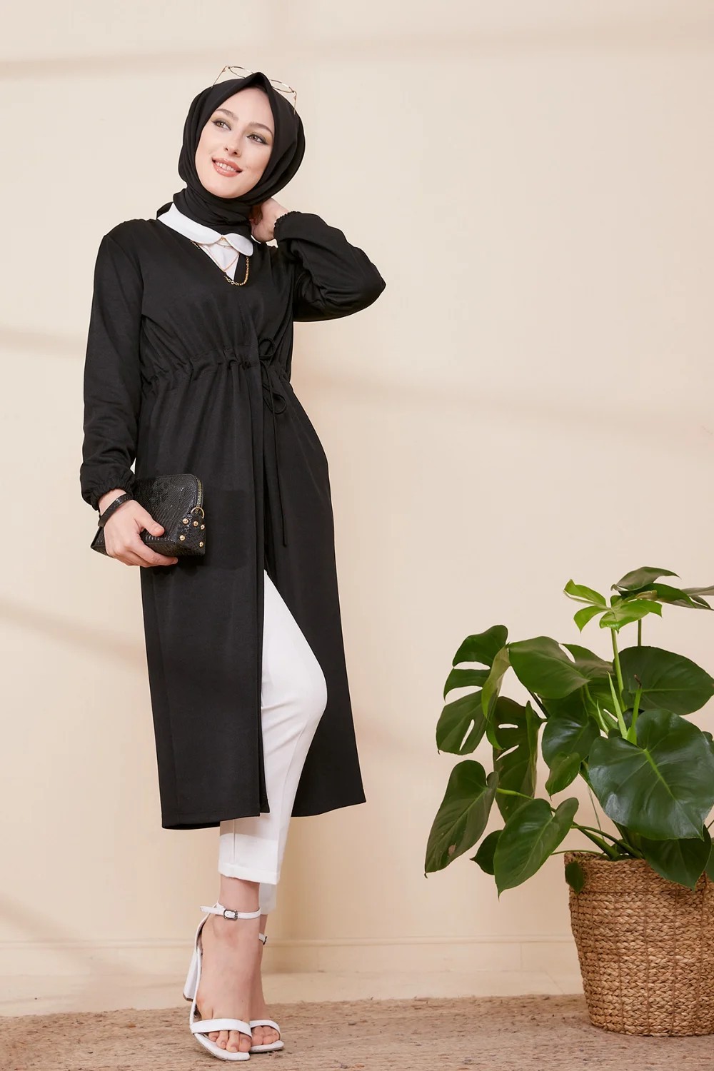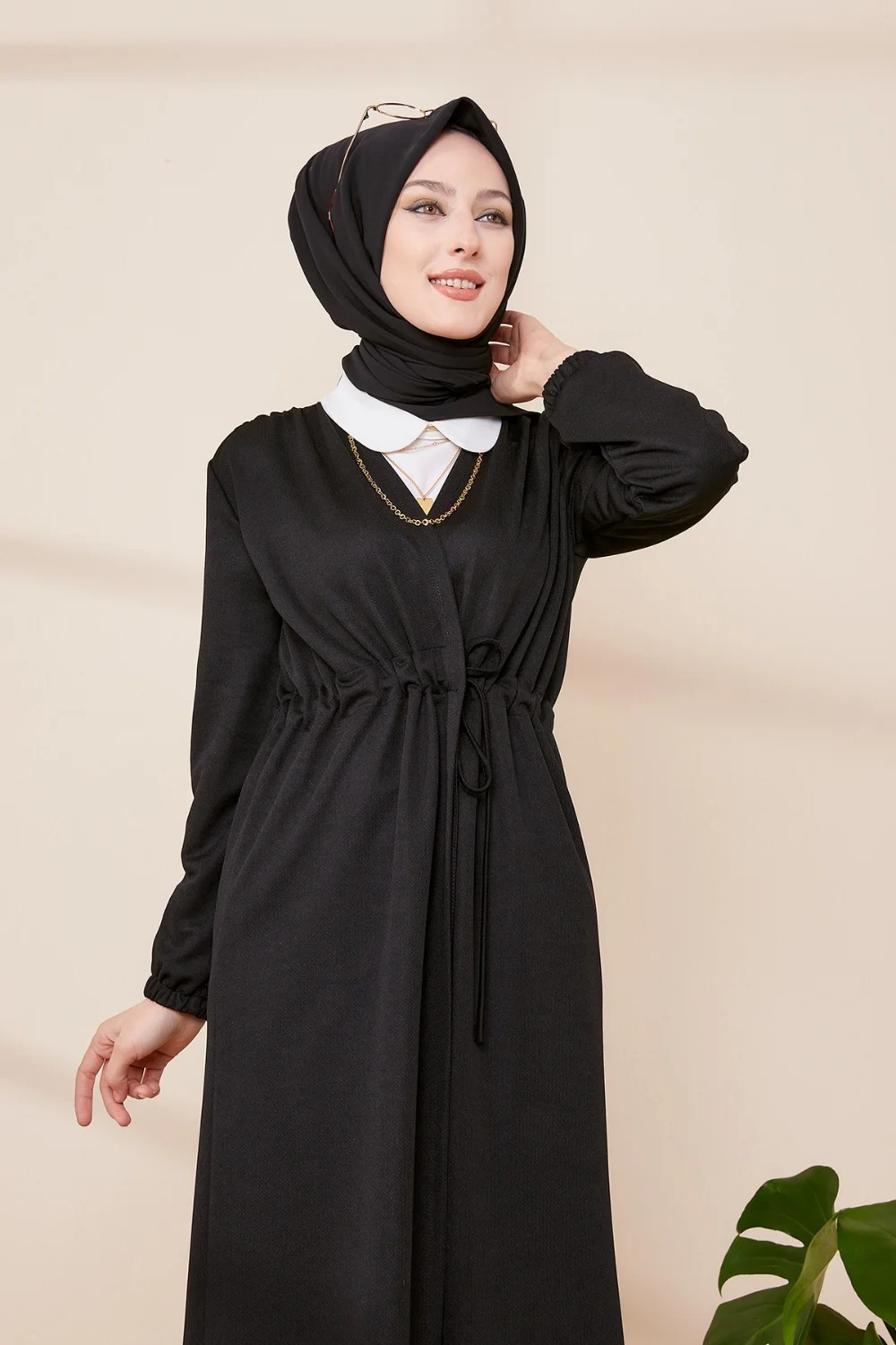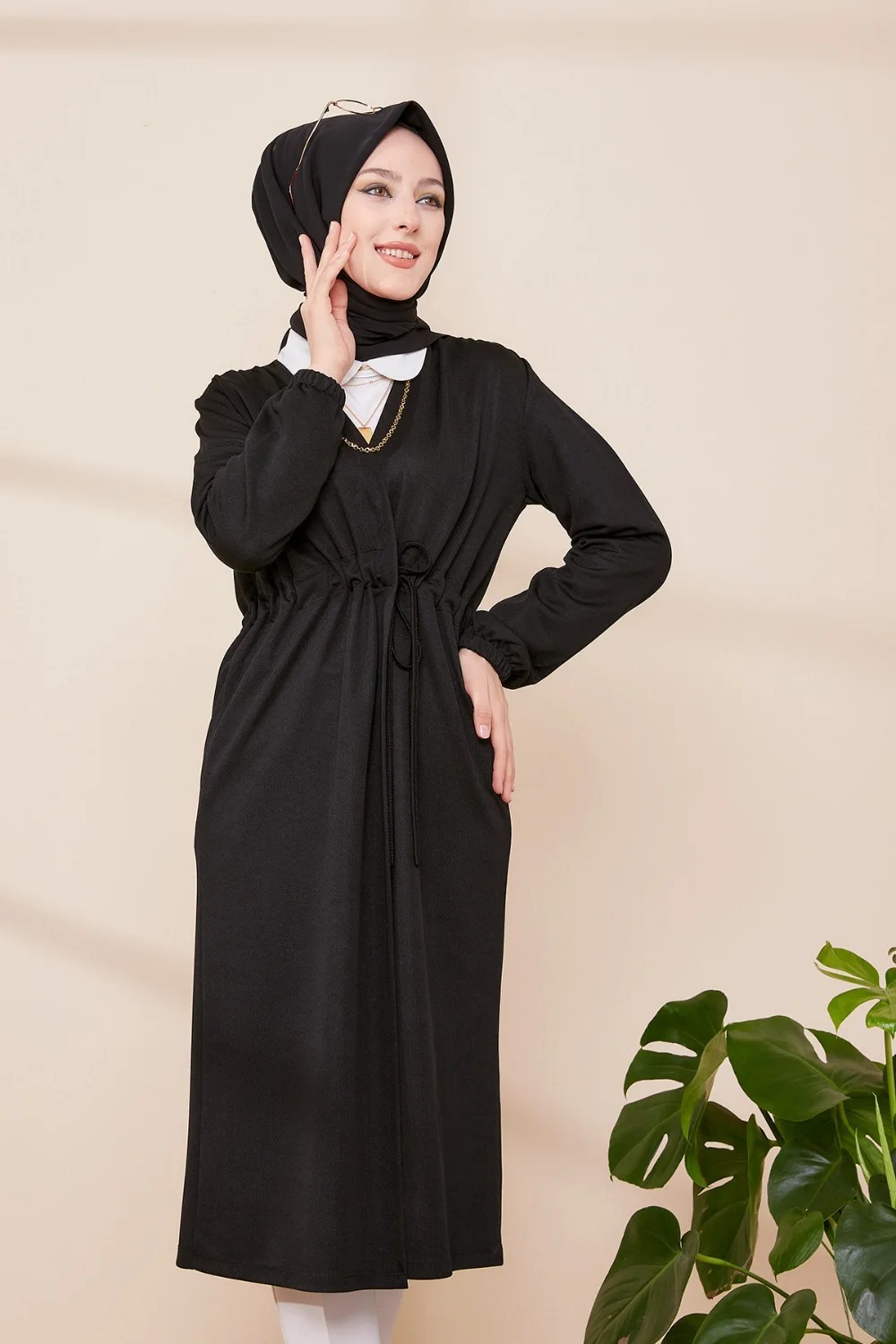 Veste - Tunique longue avec lien de serrage à la taille (Vêtement femme voilée chic) - Couleur noir