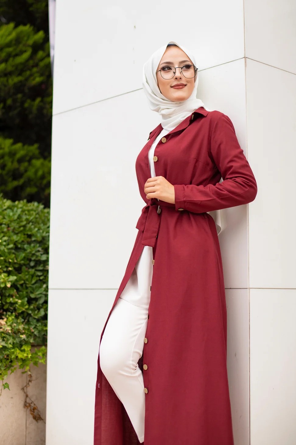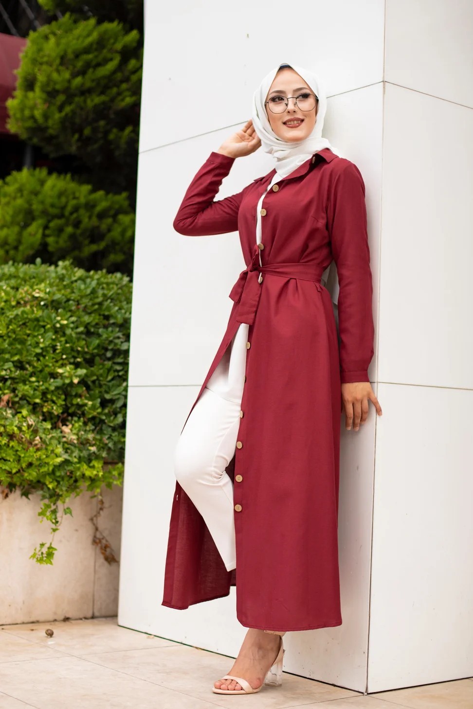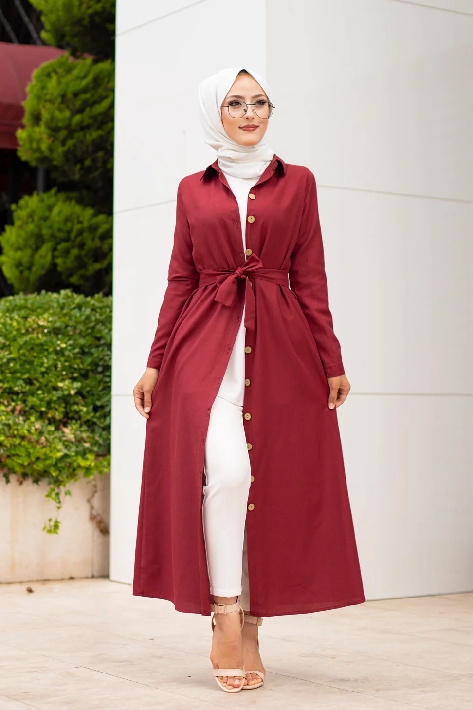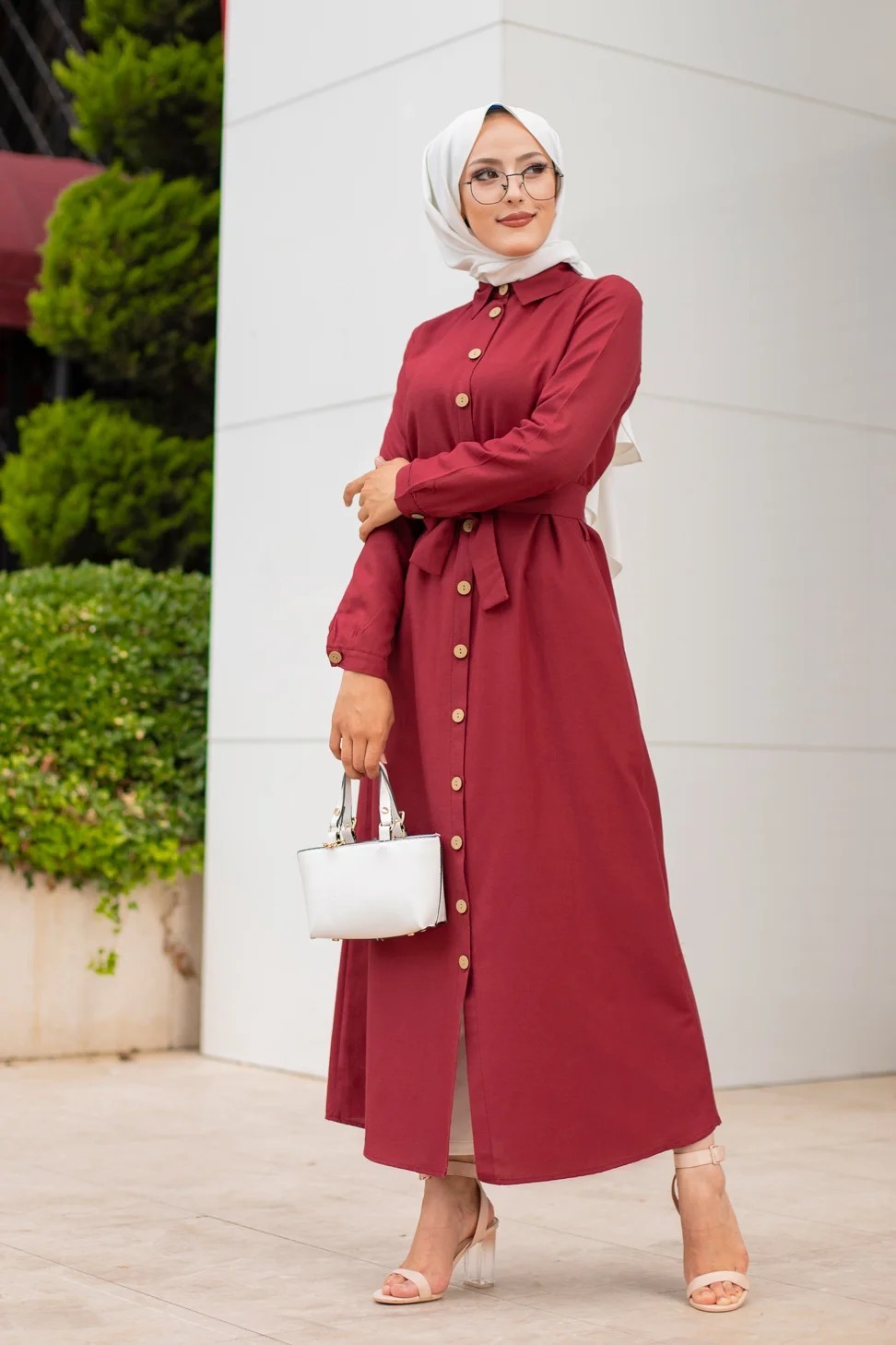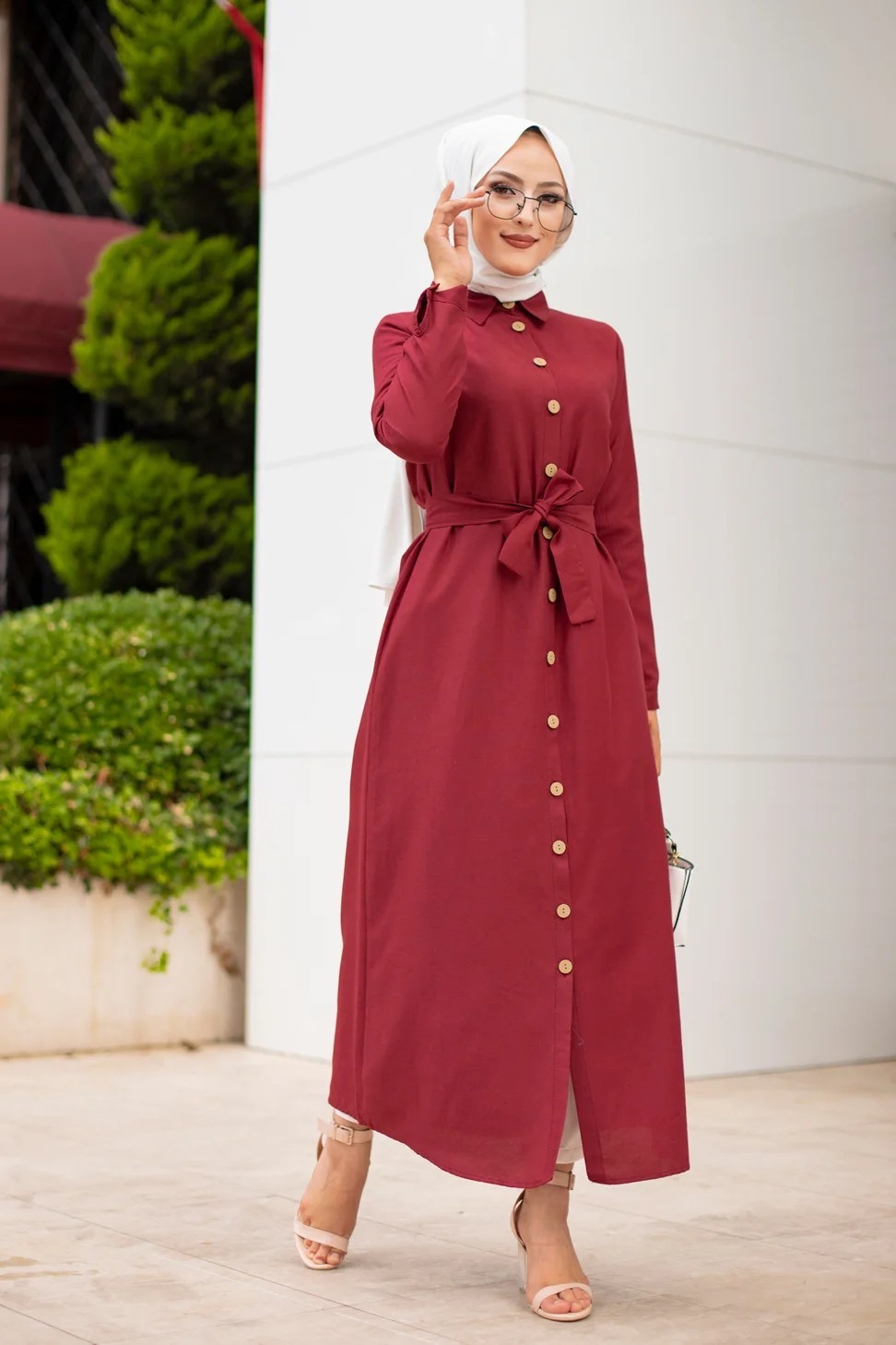 Robe boutonnée avec ceinture pour femme voilée (Vêtement Hijab Chic - Boutique en ligne française) - Couleur bordeaux Vetement & Accessoire