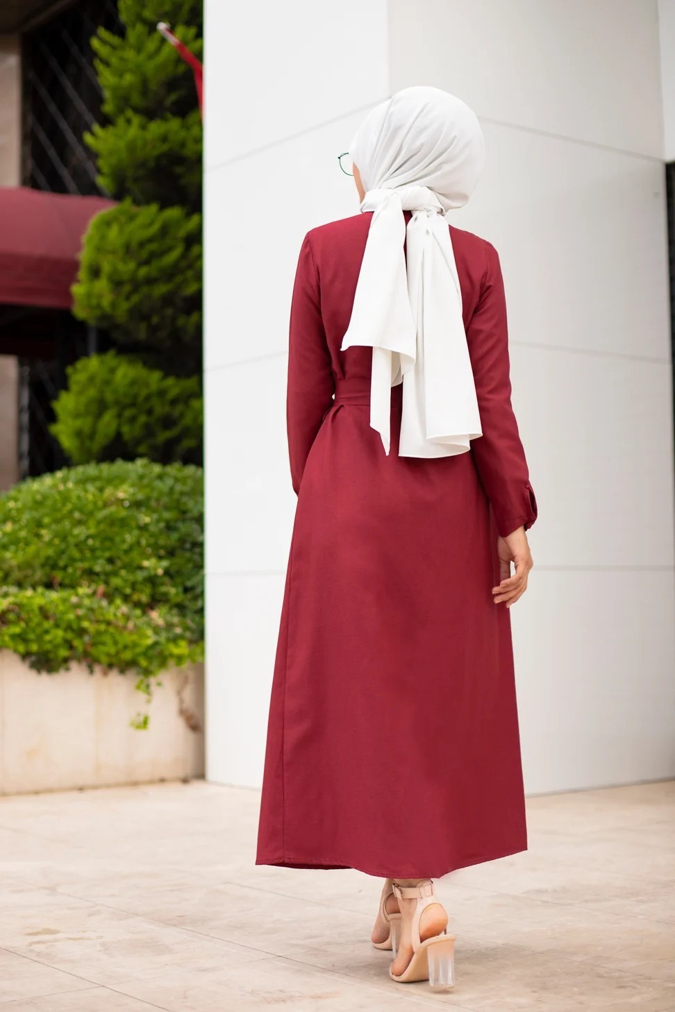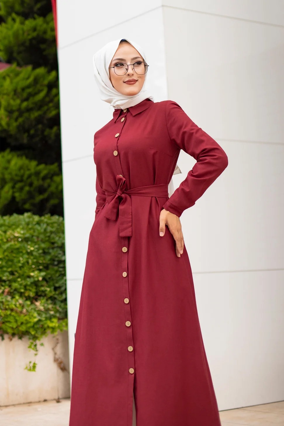Robe boutonnee avec ceinture pour femme voilee (Vetement Hijab Chic - Boutique en ligne francaise) - Couleur bordeaux