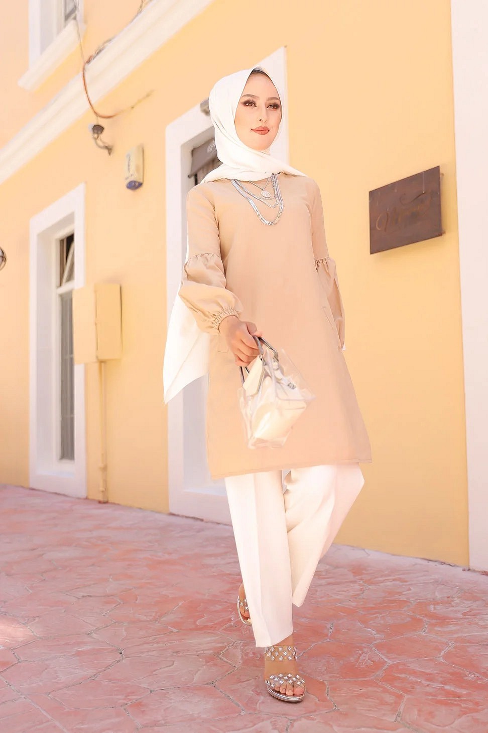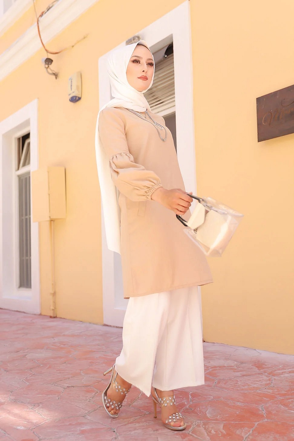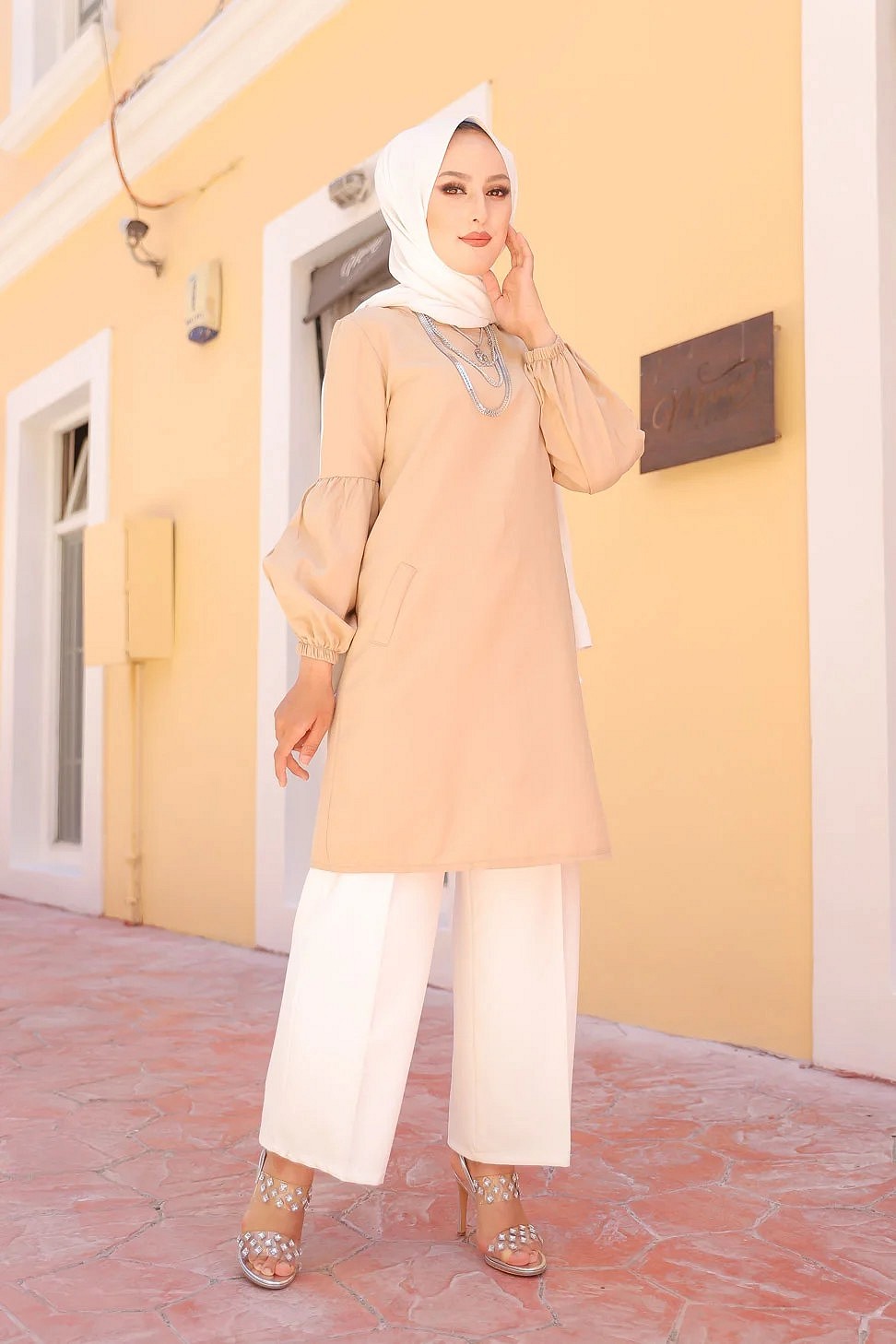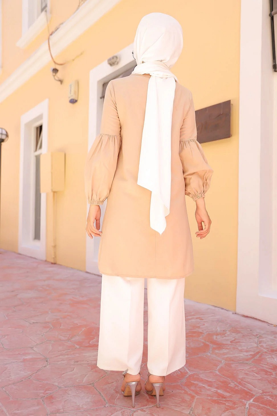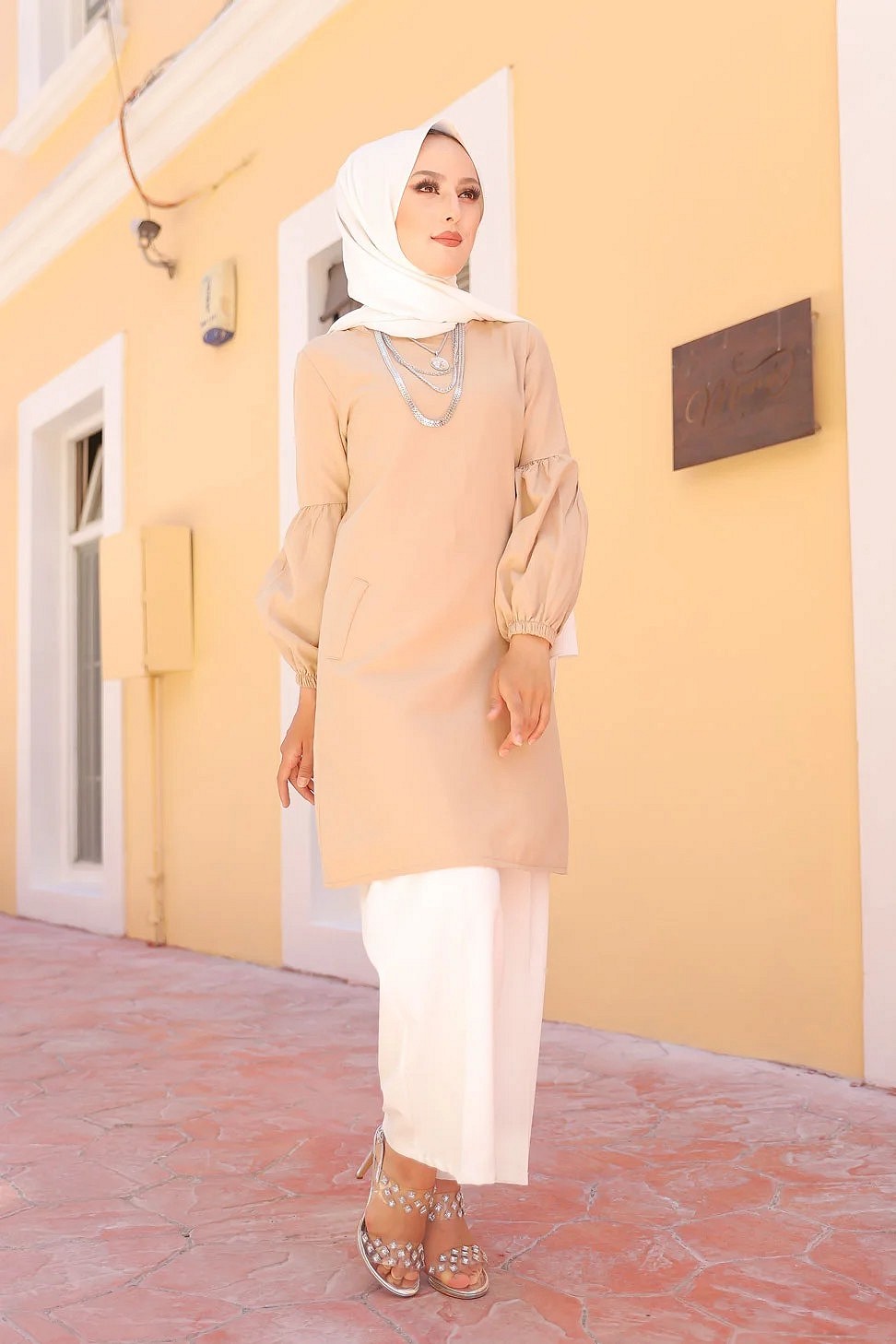 Tunique casual a manches bouffantes pour femme (Vetement pour hijab habille) - Couleur beige