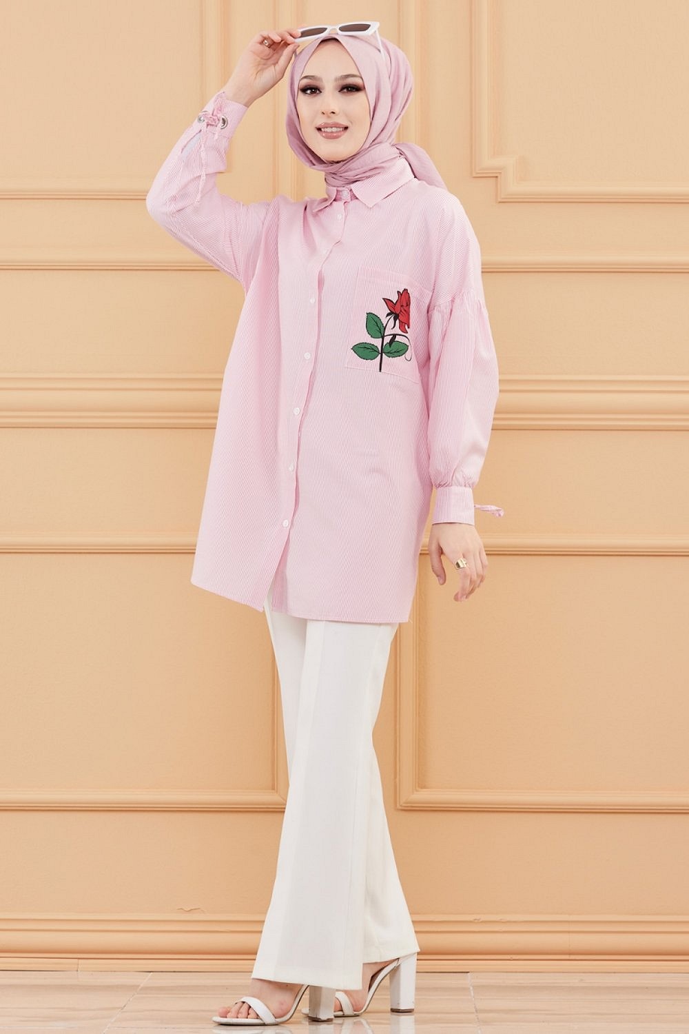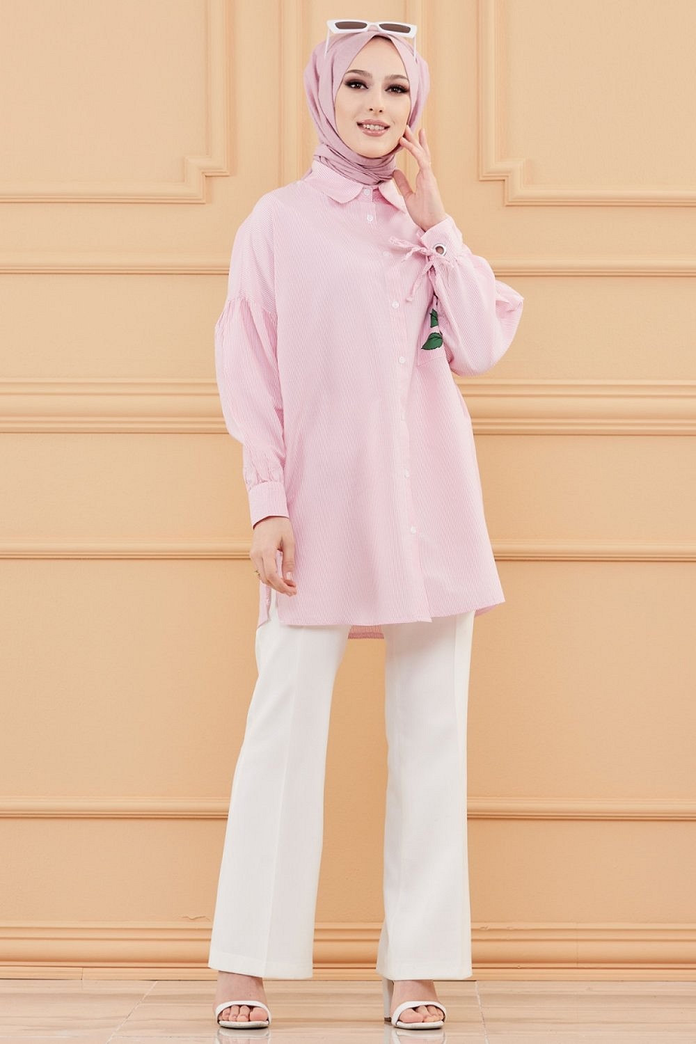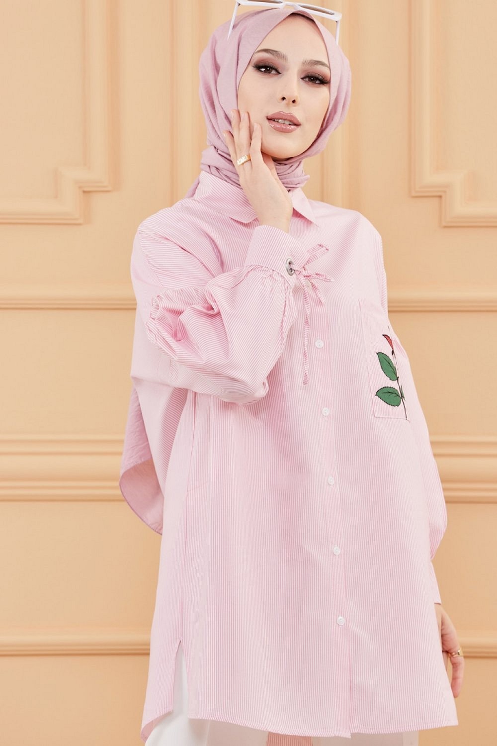 Chemise-Tunique motif fleur (Vetement pour femme voilee) - Couleur des rayures : rose clair