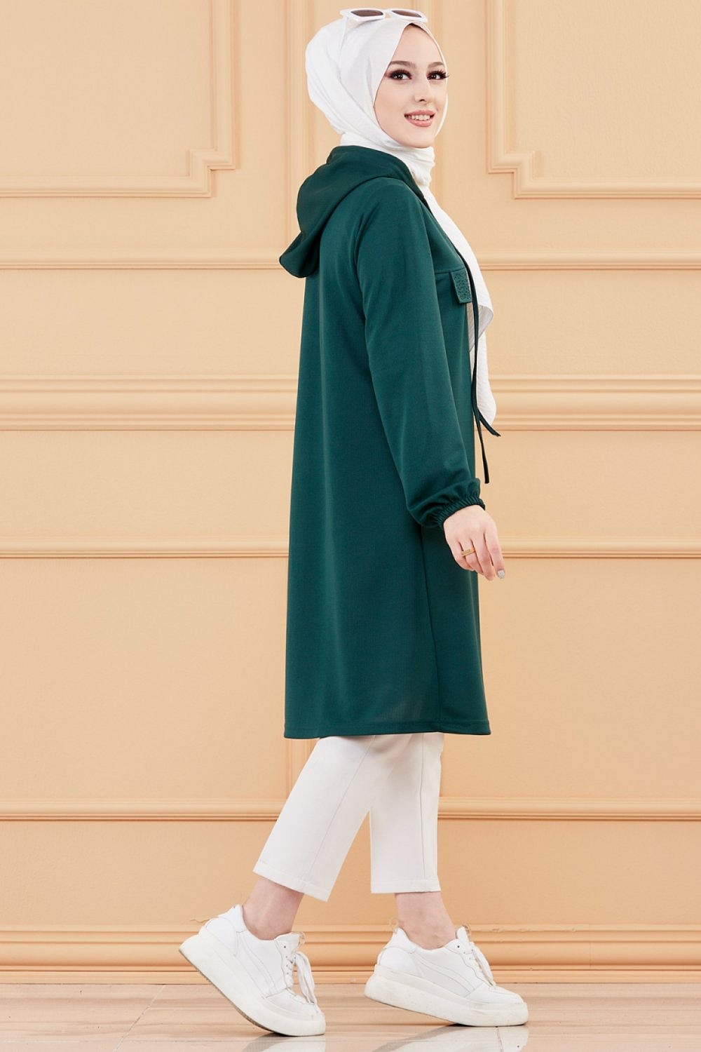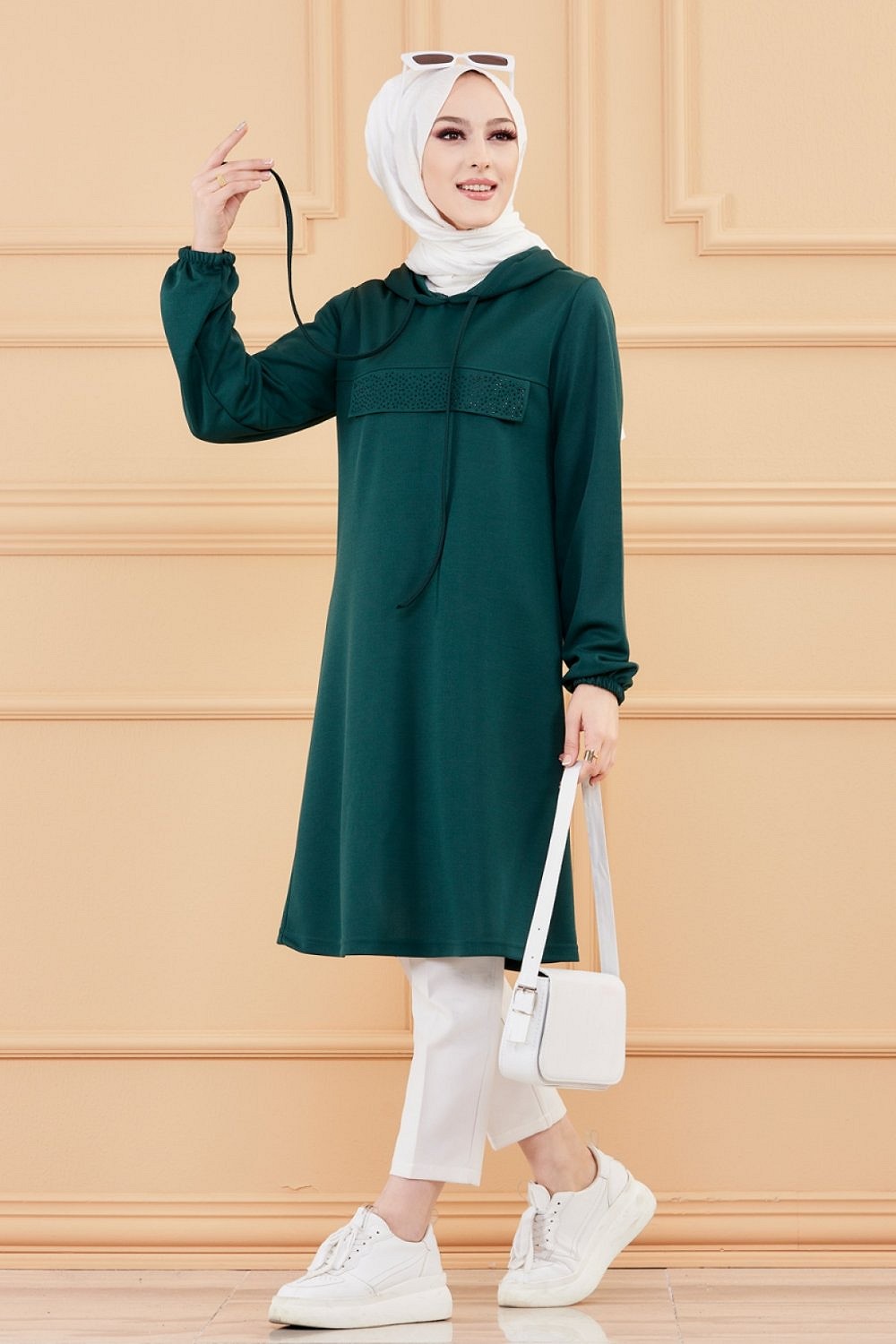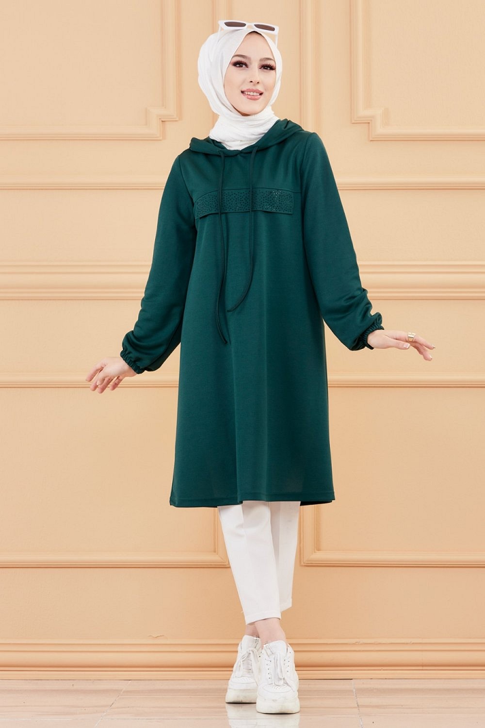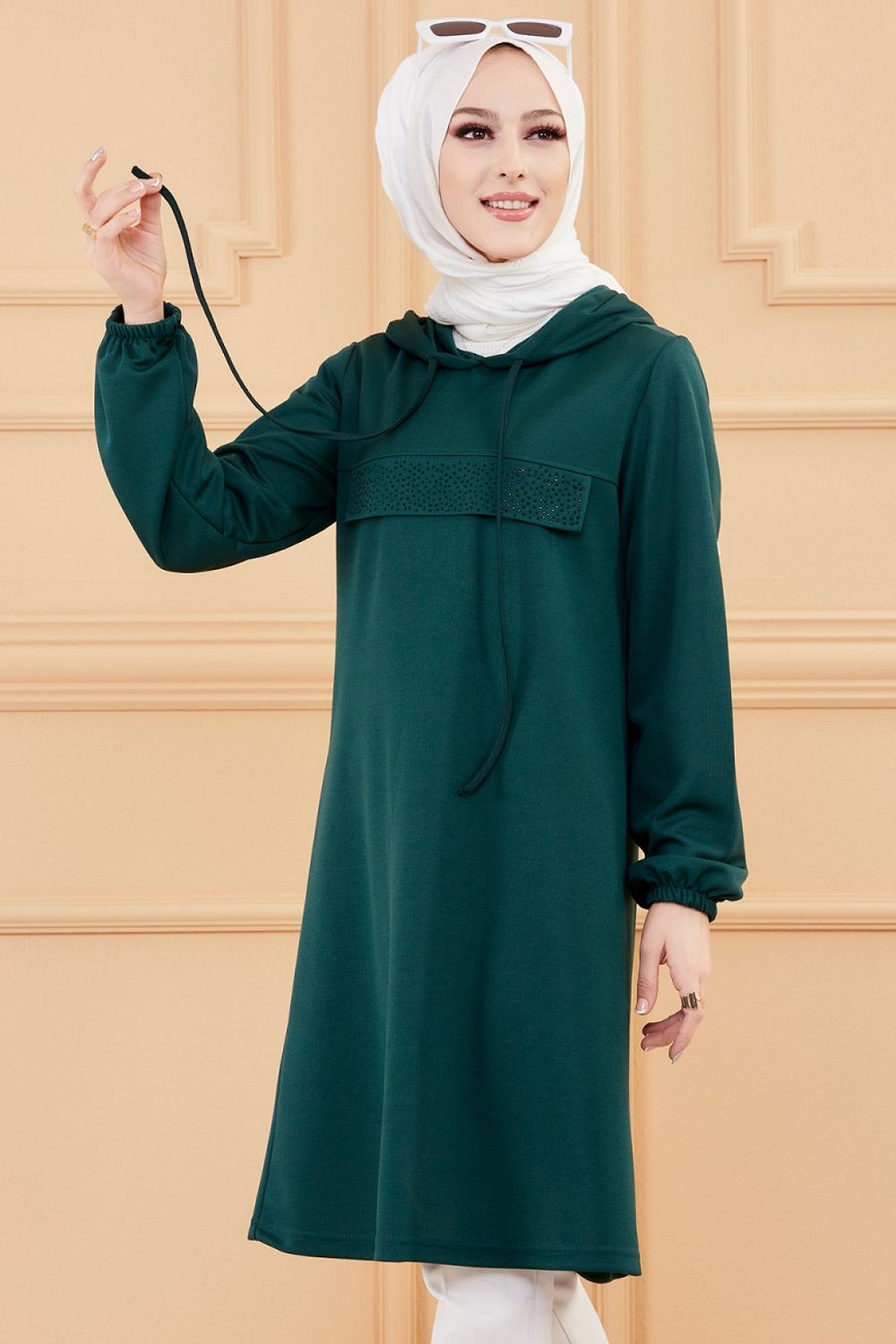 Tunique avec strass et capuche (Tenue decontractee moderne pour femme voilee) - Couleur vert emeraude