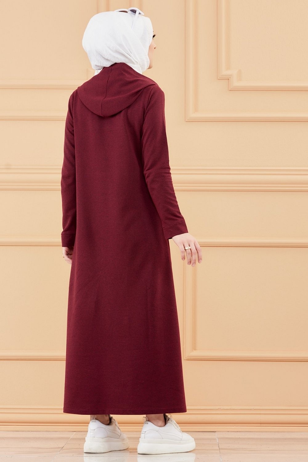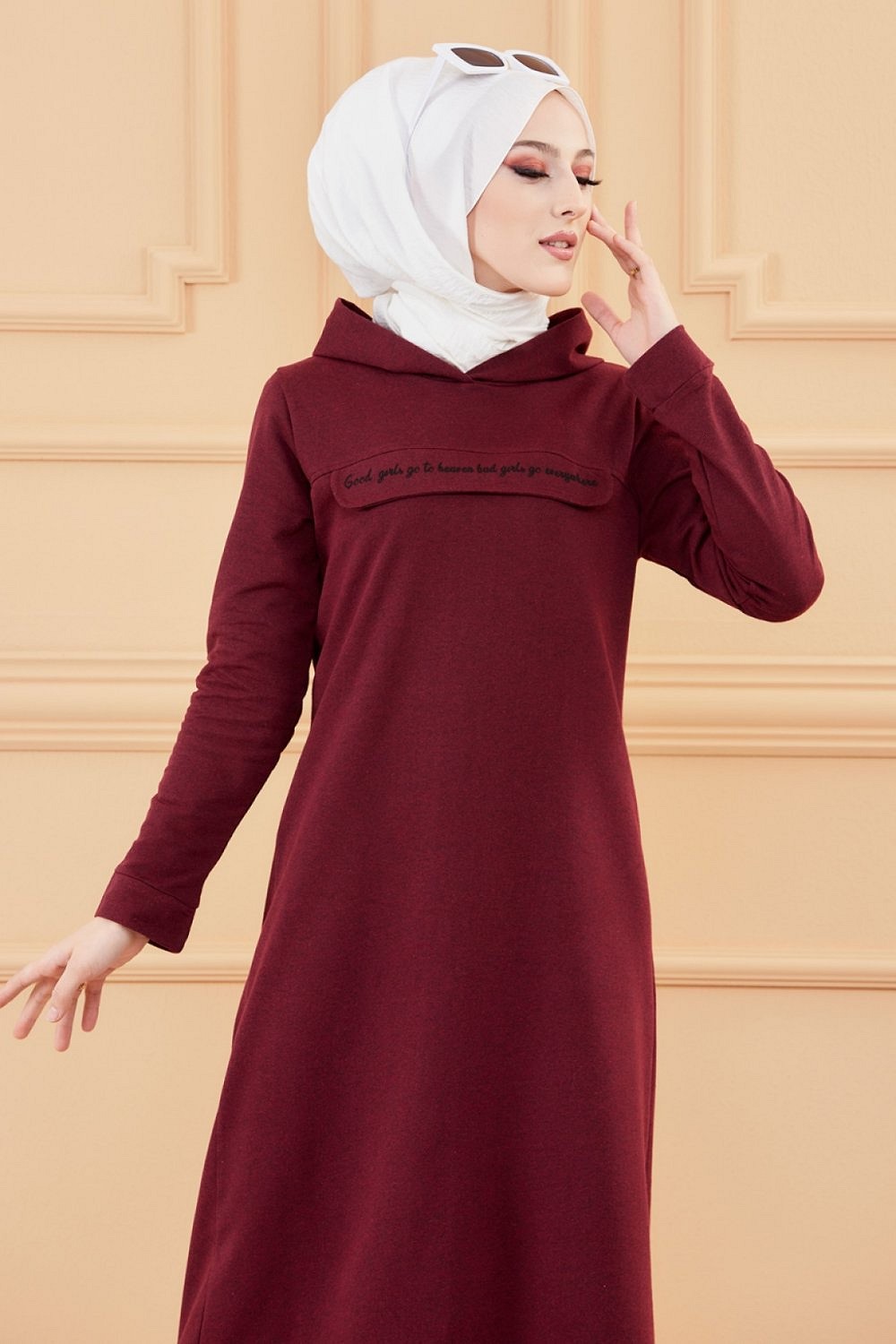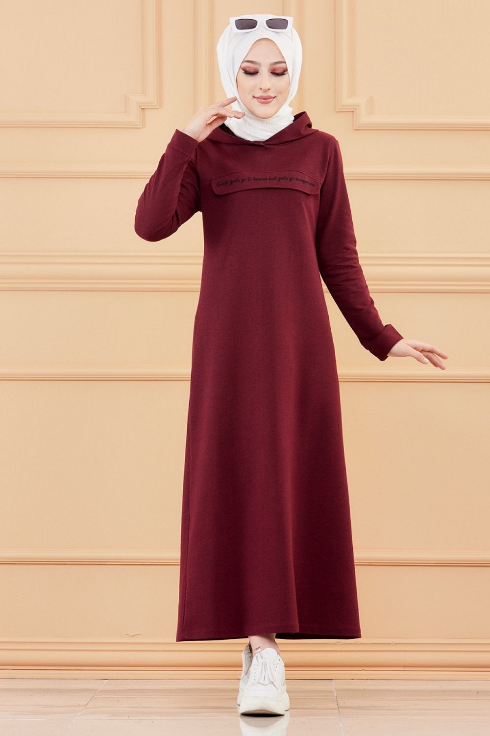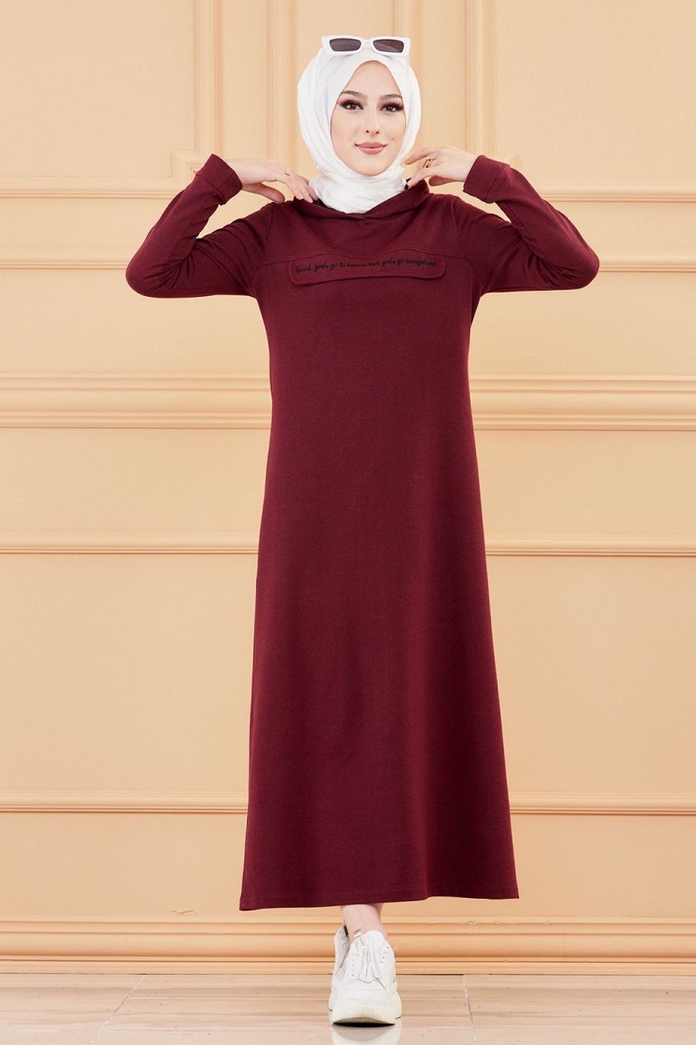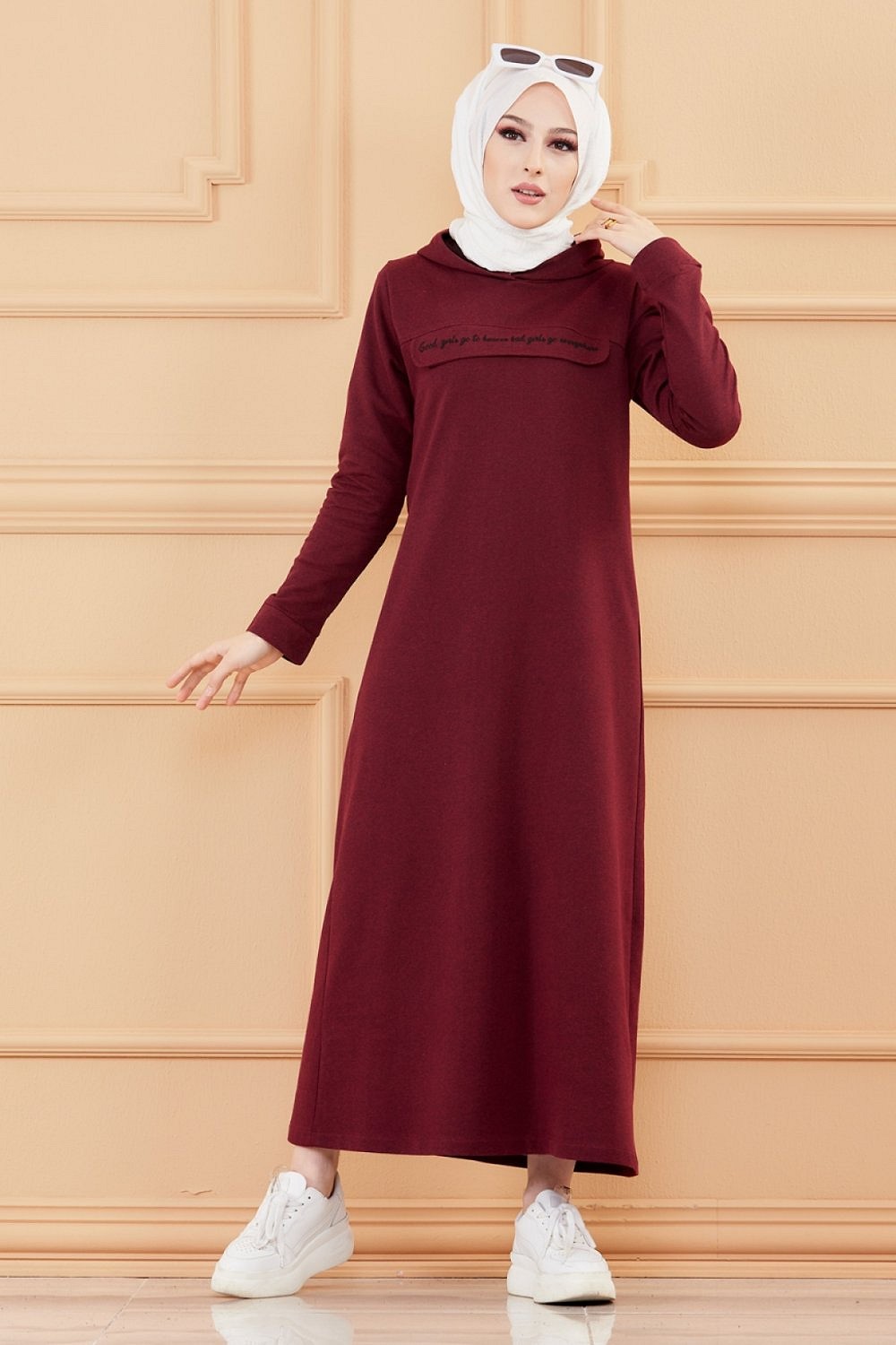 Robe-sweat long décontracté avec capuche (Tenue moderne style sport pour Hijab) - Couleur bordeaux Vetement & Accessoire