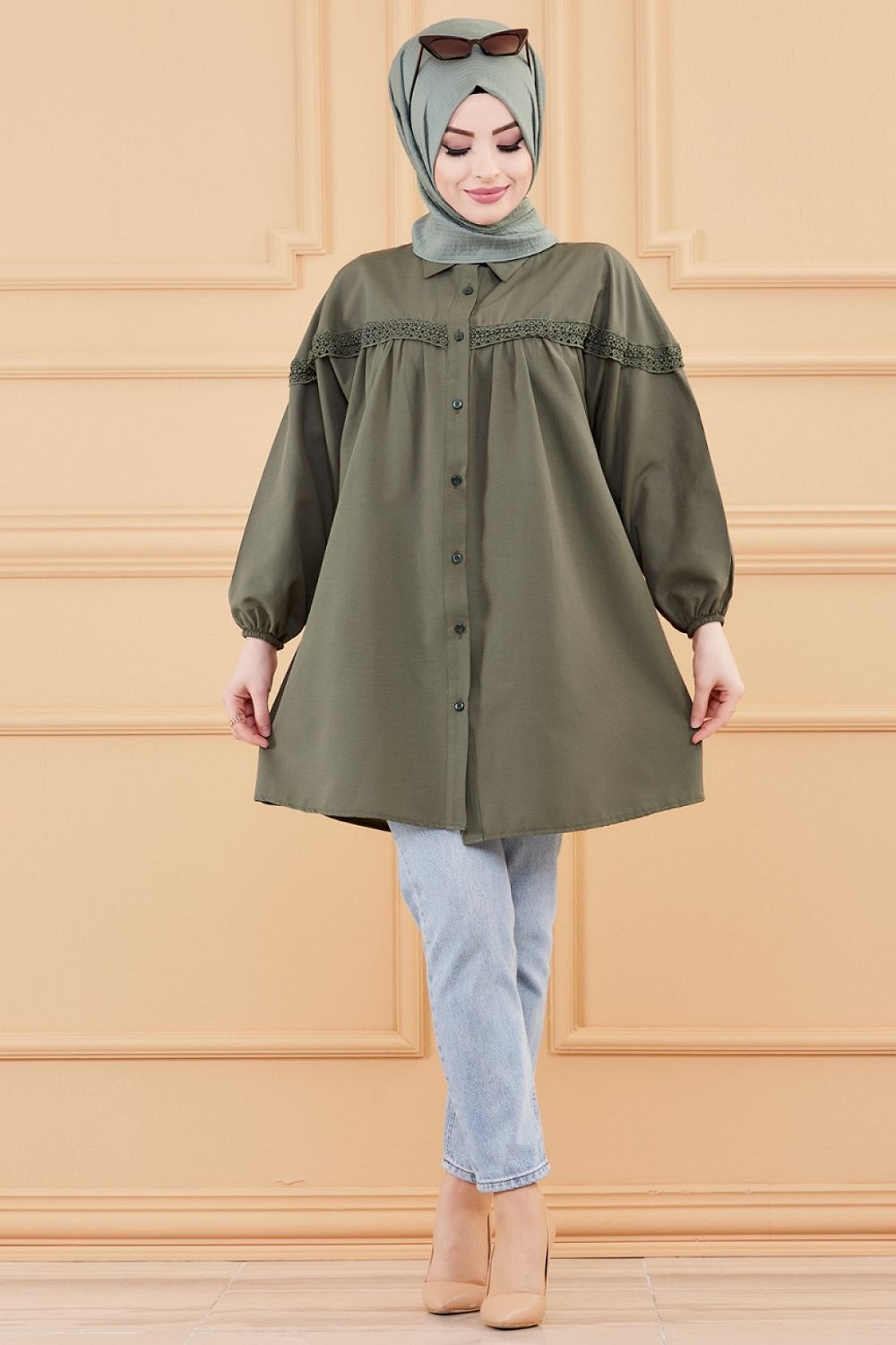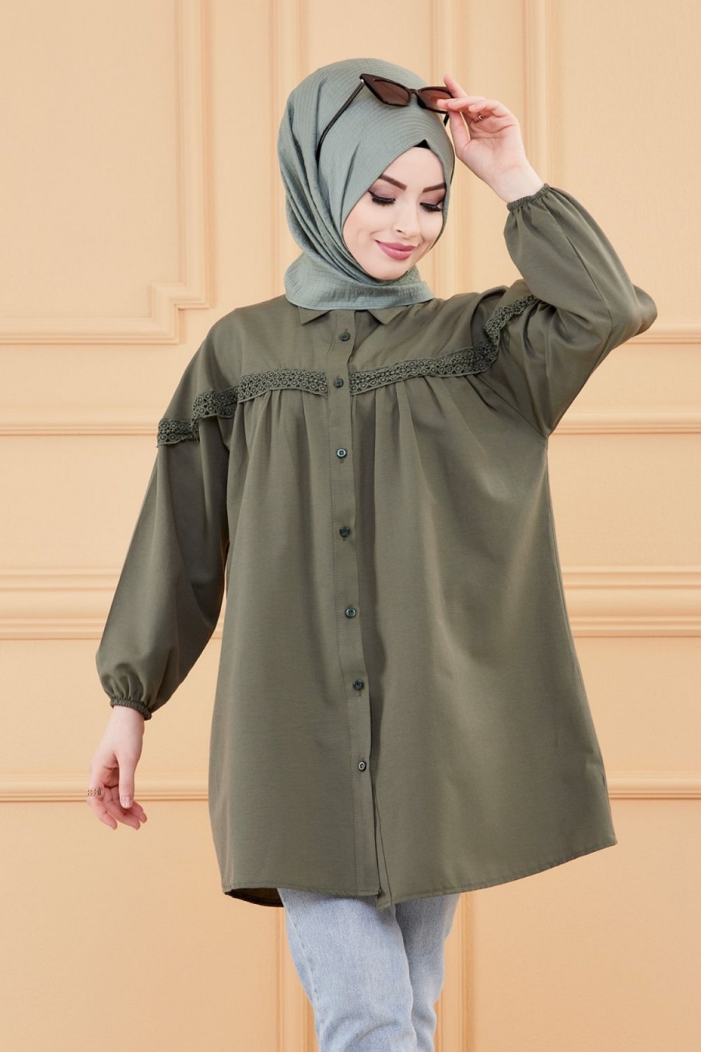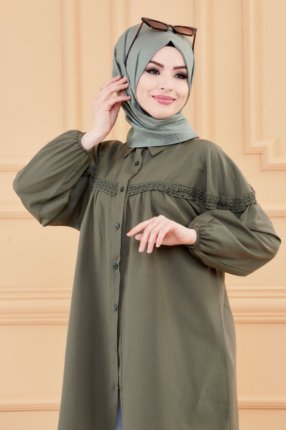 Tunique-Chemise ample avec dentelle pour femme (Vetement Hijab classique) - Couleur kaki