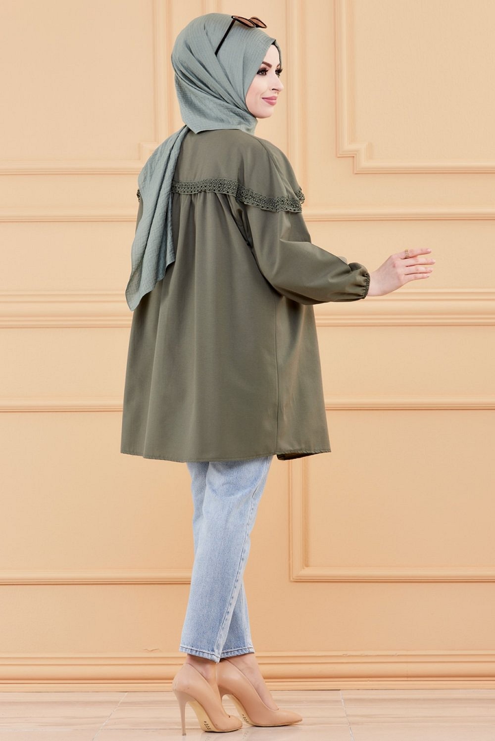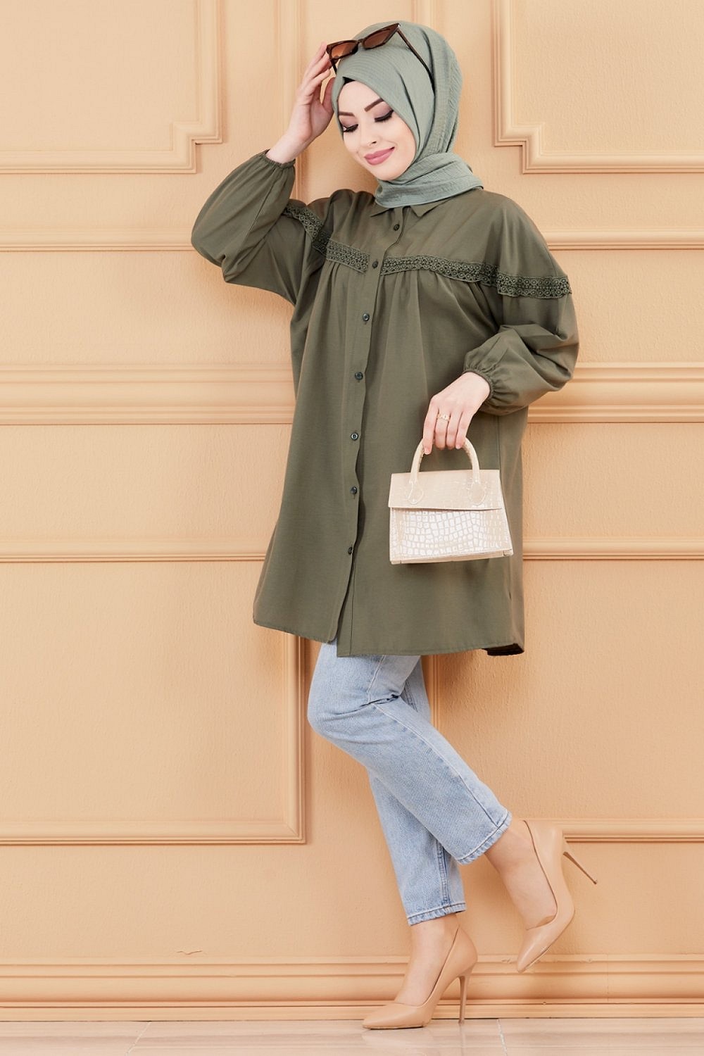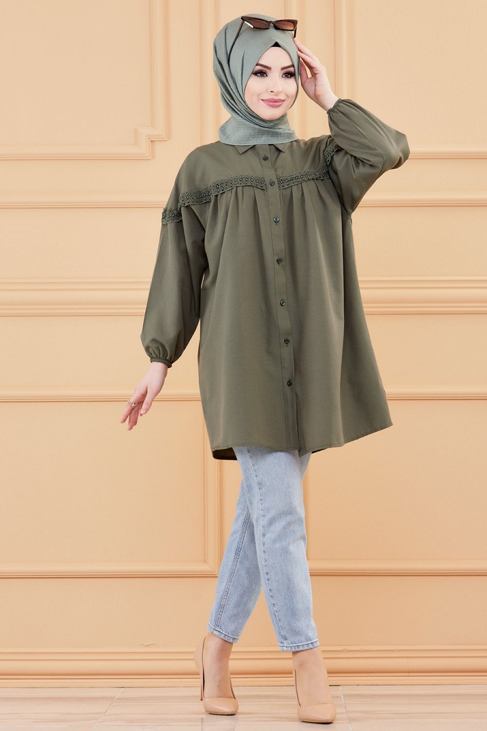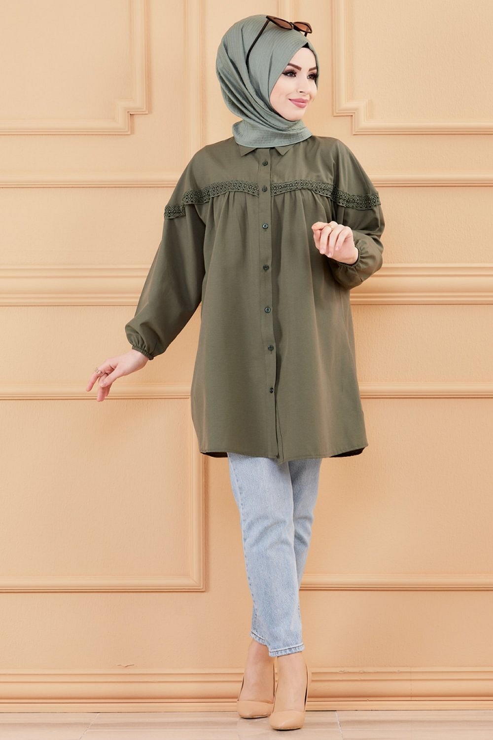 Tunique-Chemise ample avec dentelle pour femme (Vetement Hijab classique) - Couleur kaki