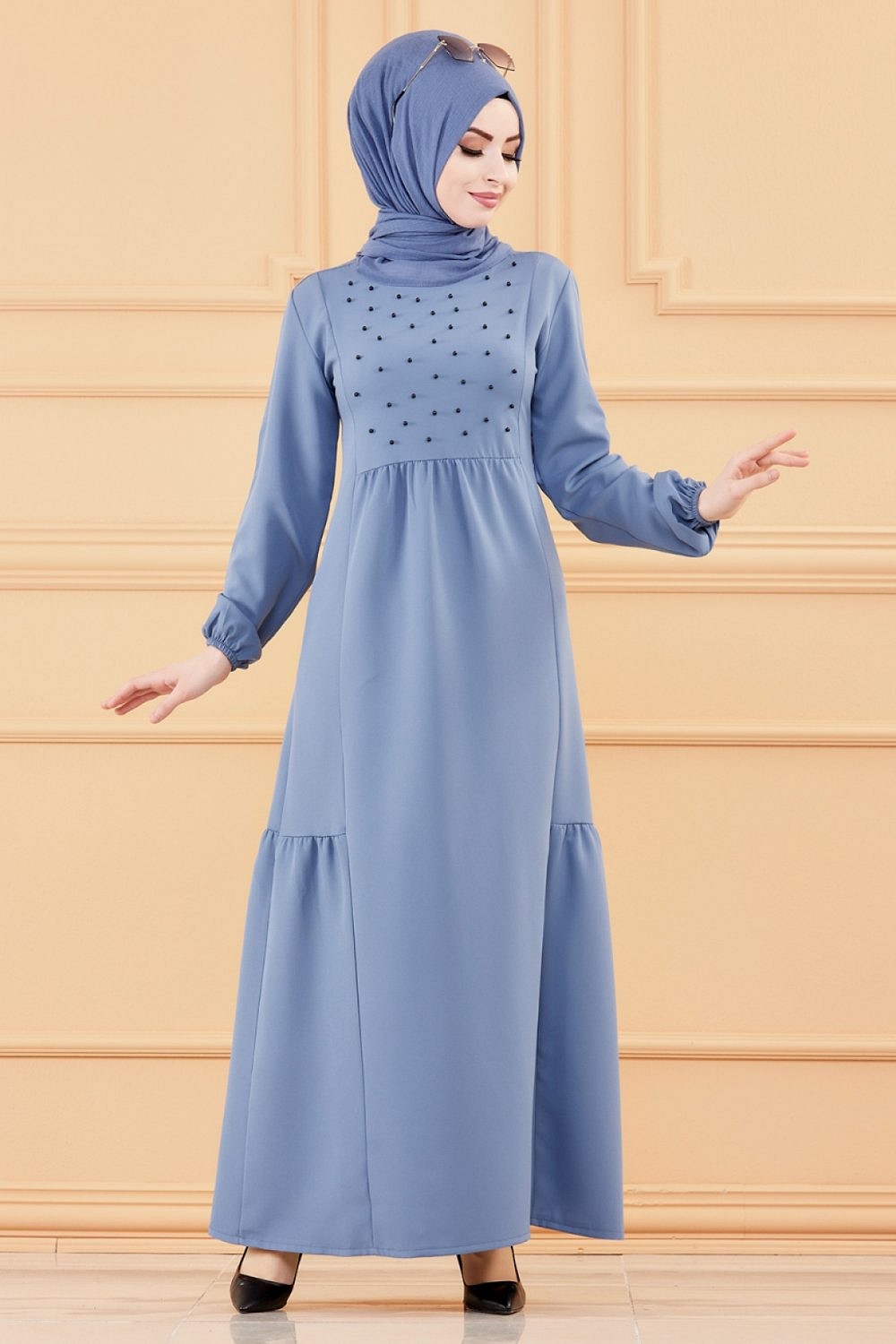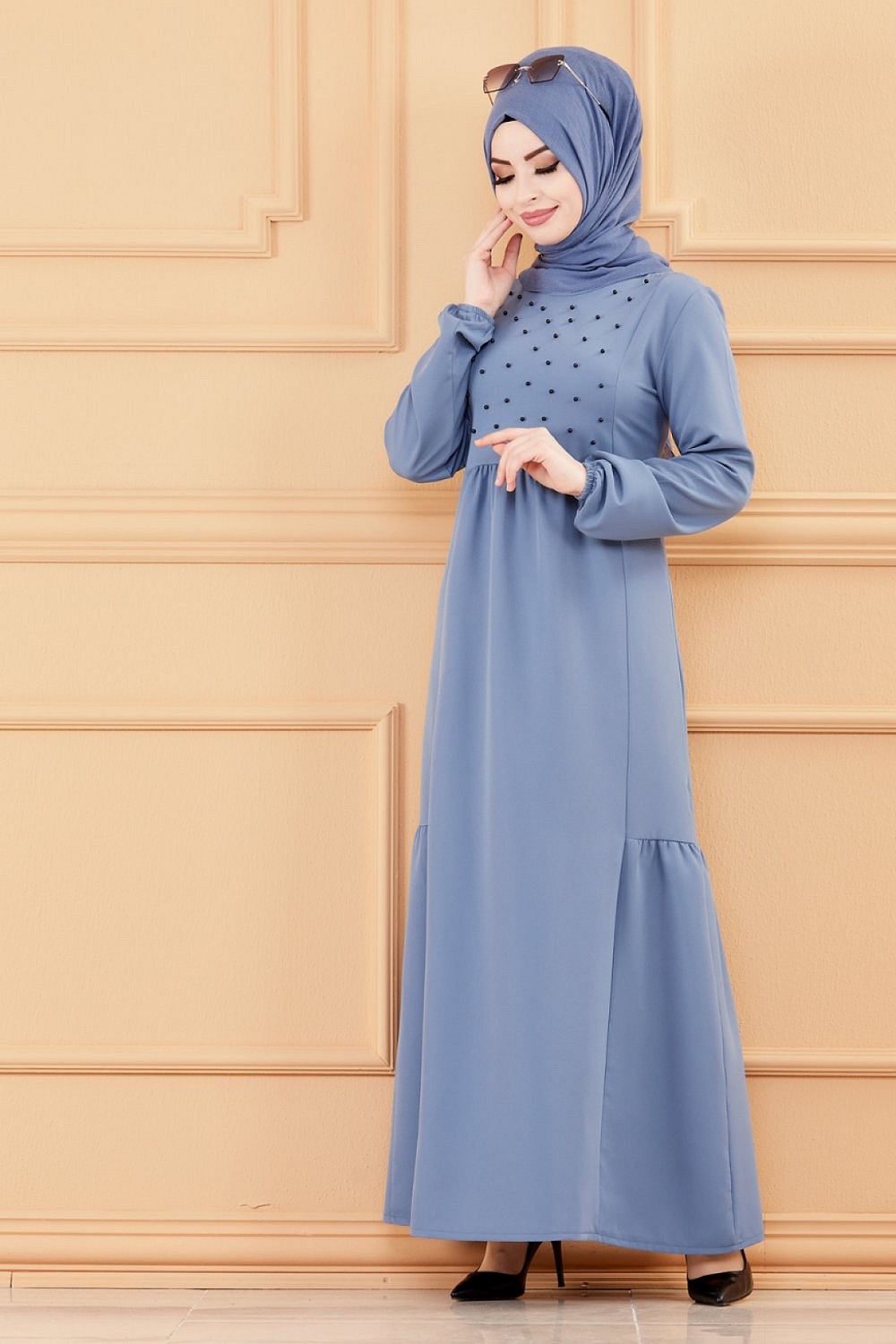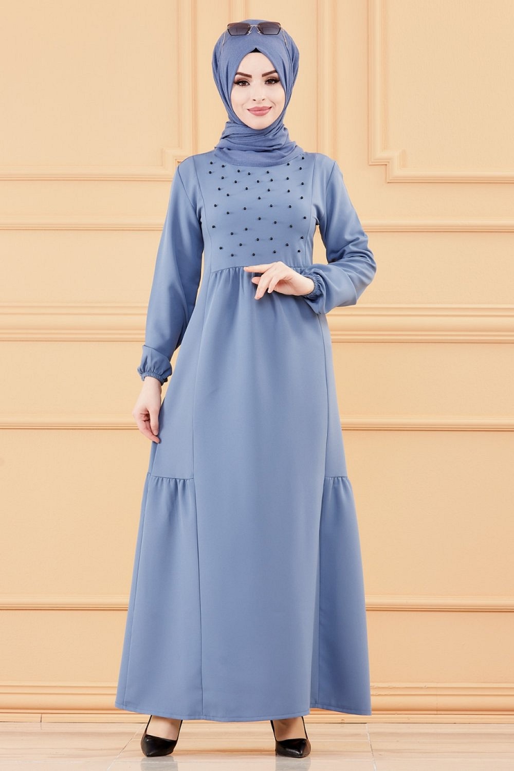 Robe longue perlee chic et classe (Vetement hijab habille pour femme) - Couleur bleu indigo