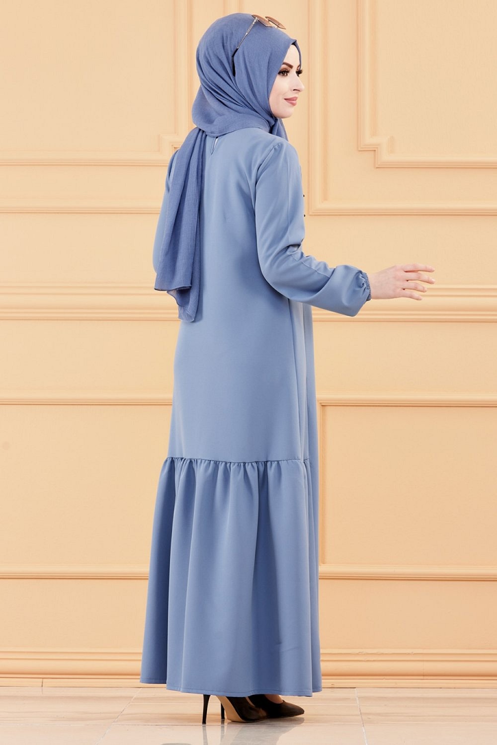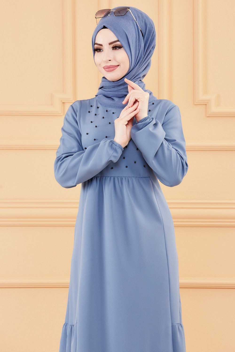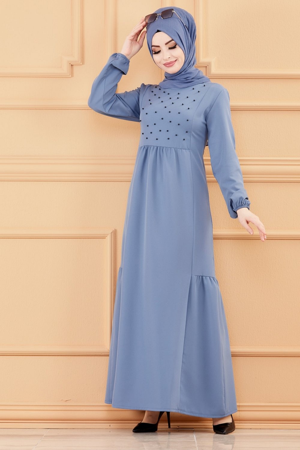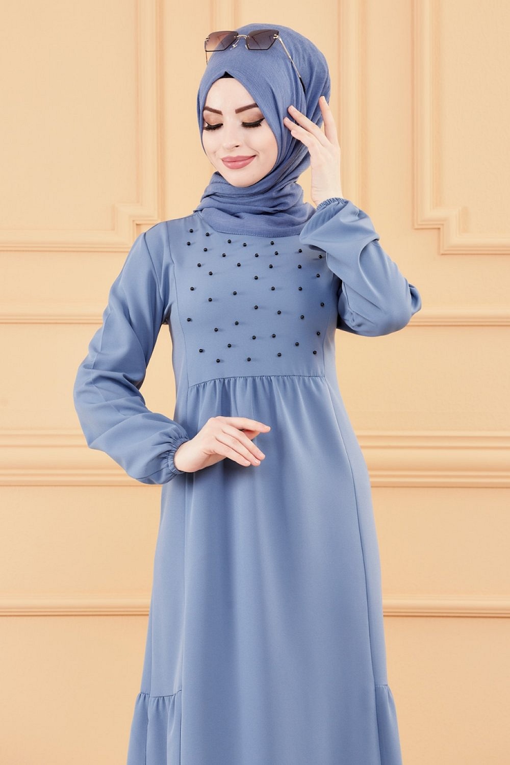 Robe longue perlee chic et classe (Vetement hijab habille pour femme) - Couleur bleu indigo