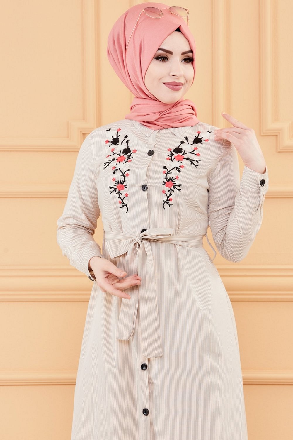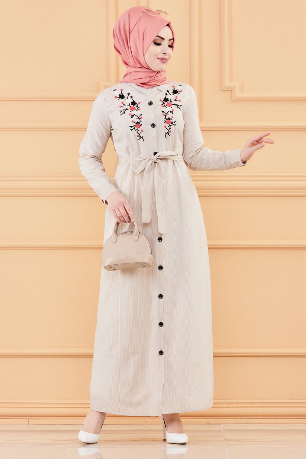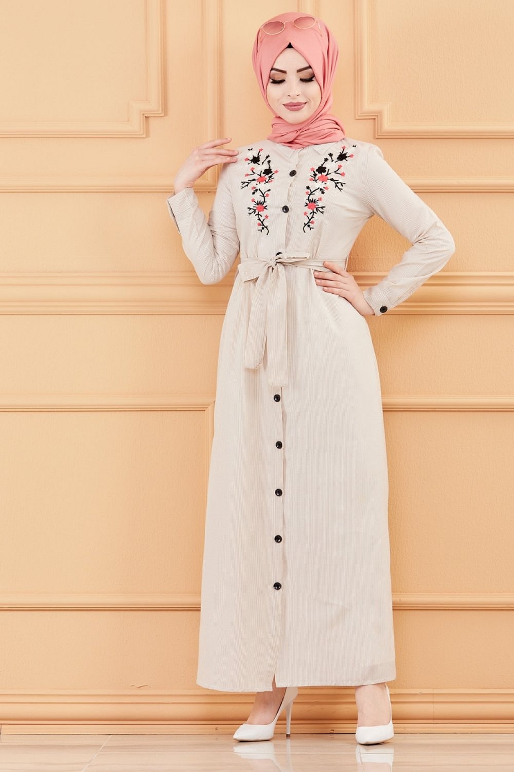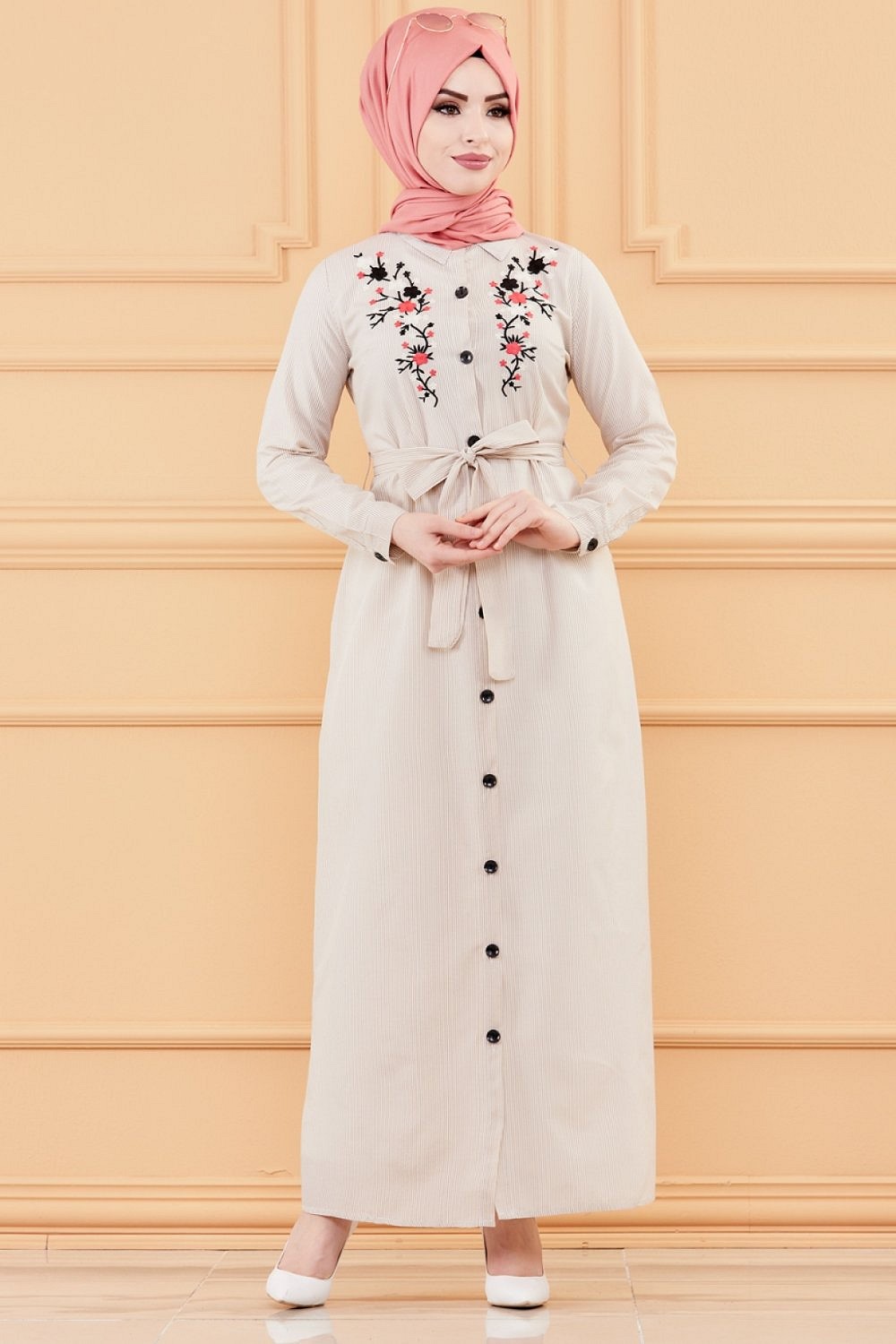 Robe longue boutonnée avec broderies et ceinture assortie - Rayures Couleur beige Vetement & Accessoire