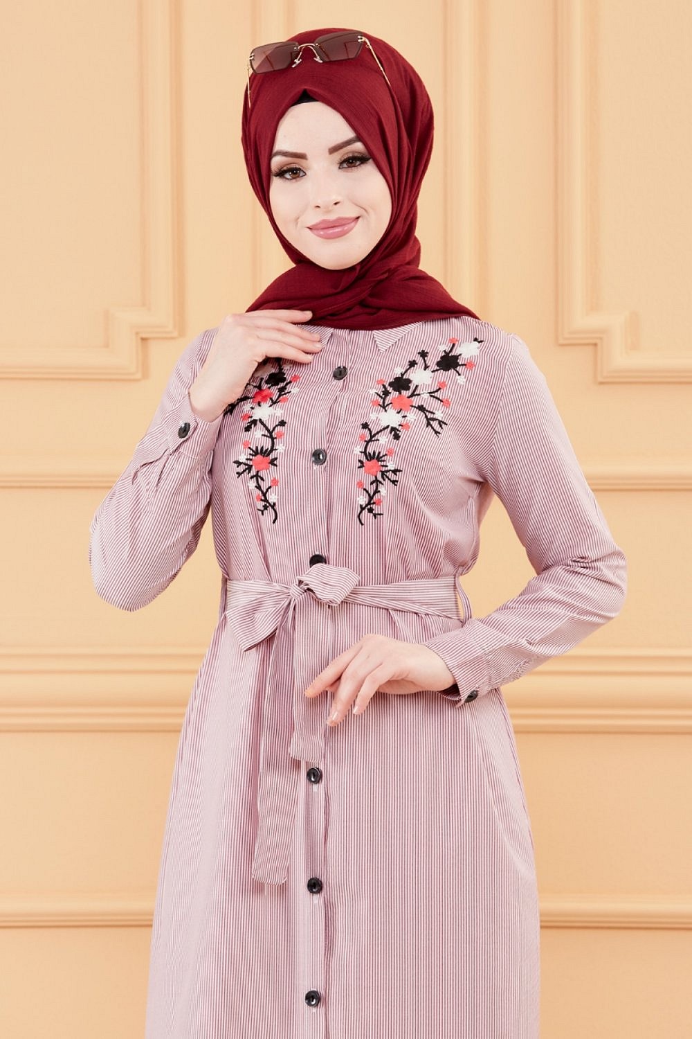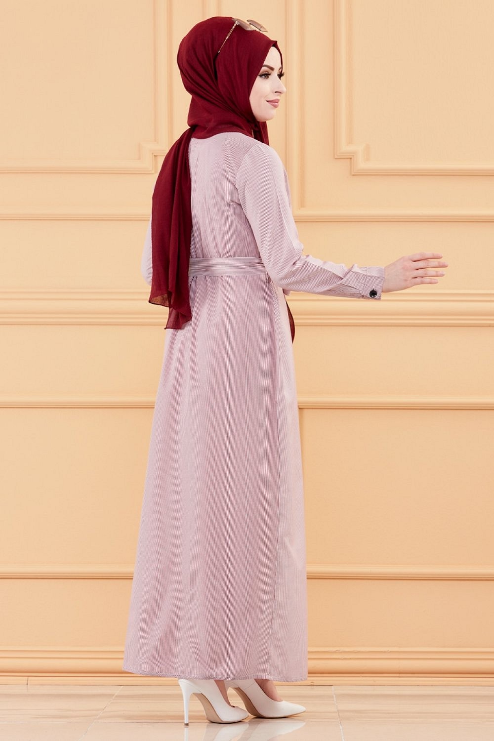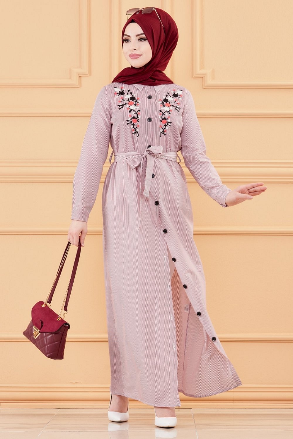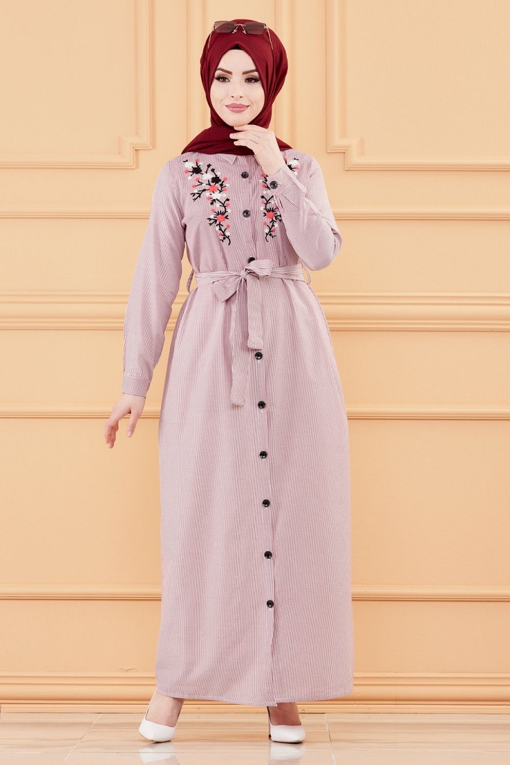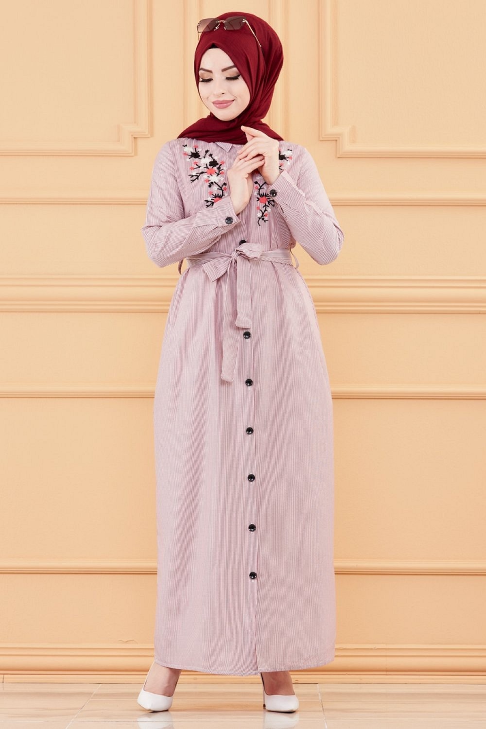 Robe longue boutonnee avec broderies et ceinture assortie (Vetement Modest Fashion pour femme voilee) - Rayures couleur bordeaux