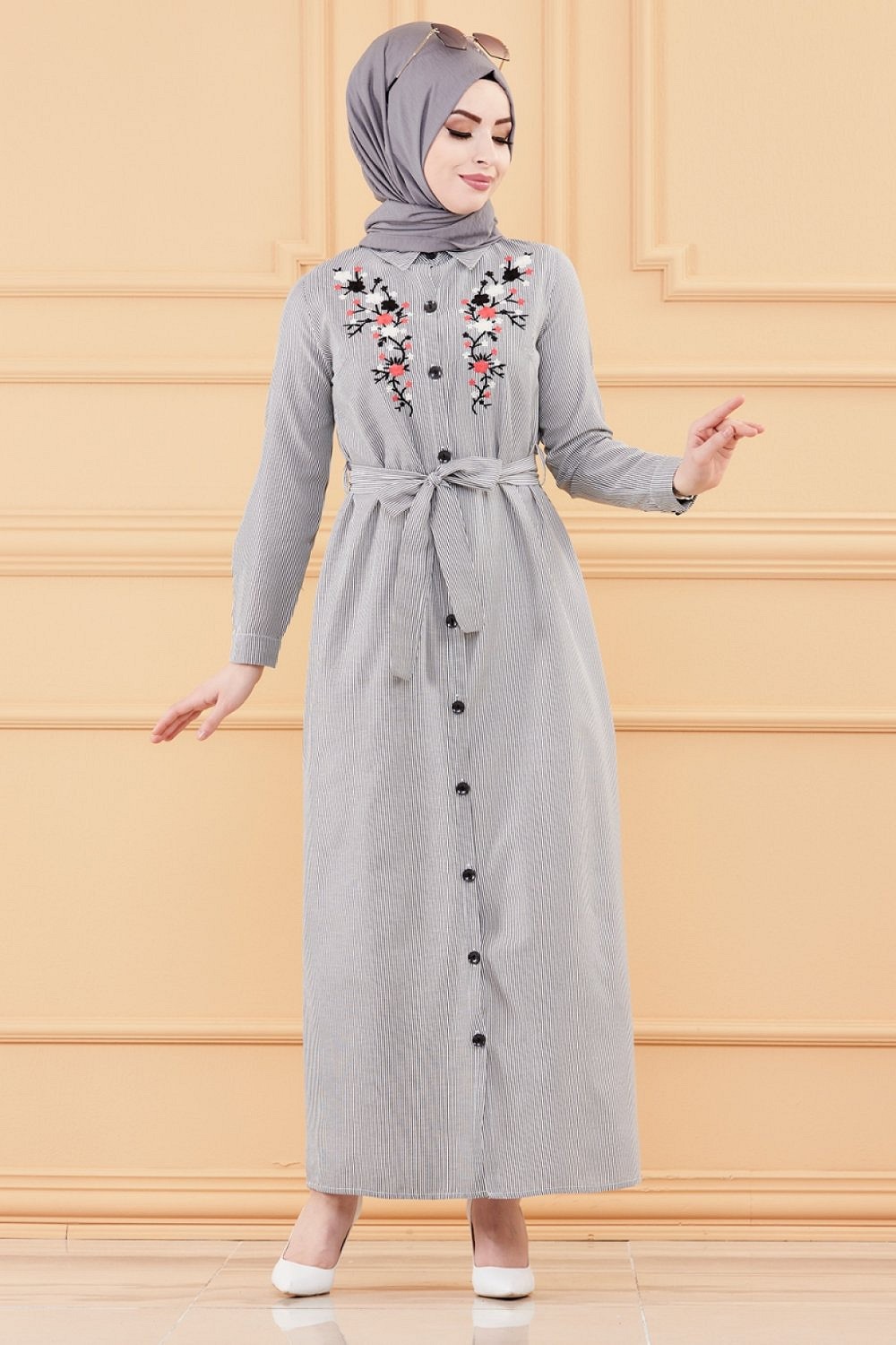 Robe longue boutonnée avec broderie et ceinture (Vêtement Hijab & Modest Fashion pour femme) - Rayures couleur noir Vetement & Accessoire