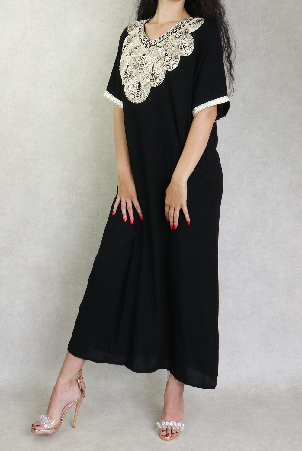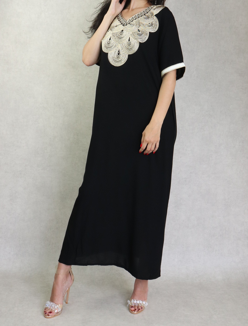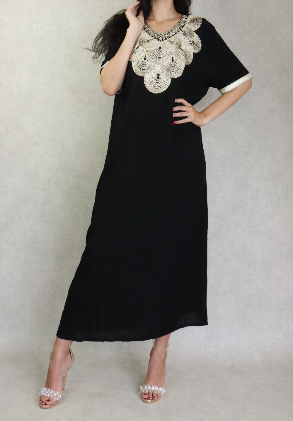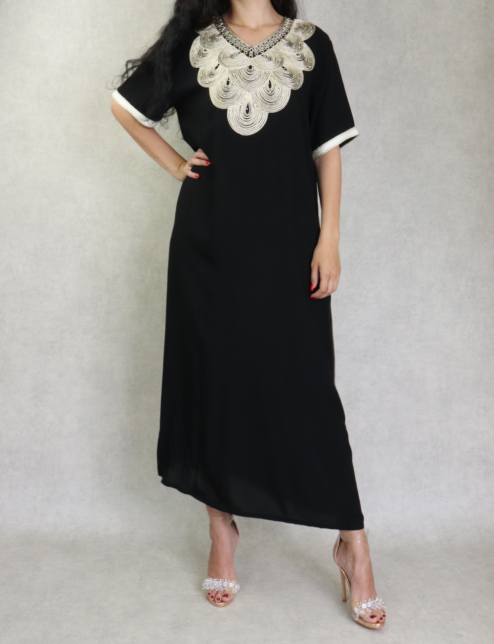 Robe longue fluide et confortable avec broderies et strass pour femme - Couleur gris - REF. 38857 (24.90 €)