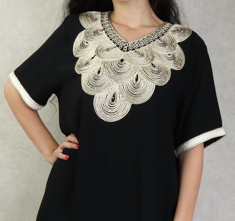 Tunique longue et ample (Grande taille) de couleur noire avec motifs dorés broderies et pompons (100% coton) - REF. 31768 (28.00 €)