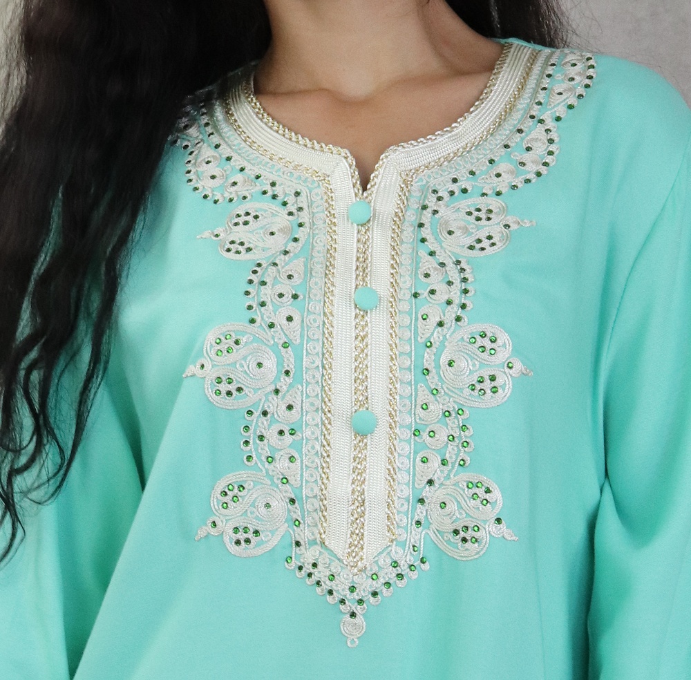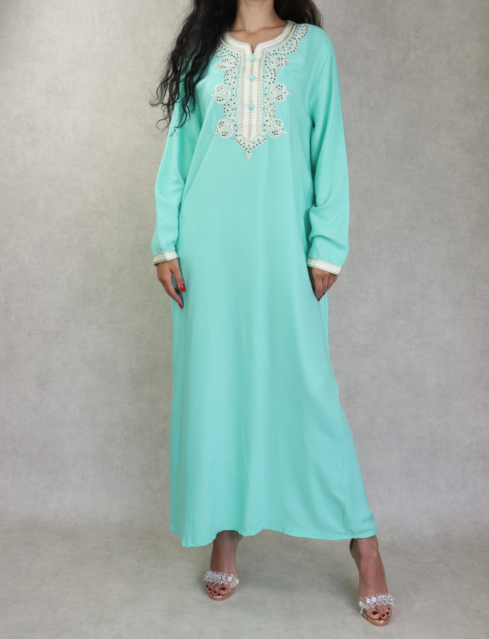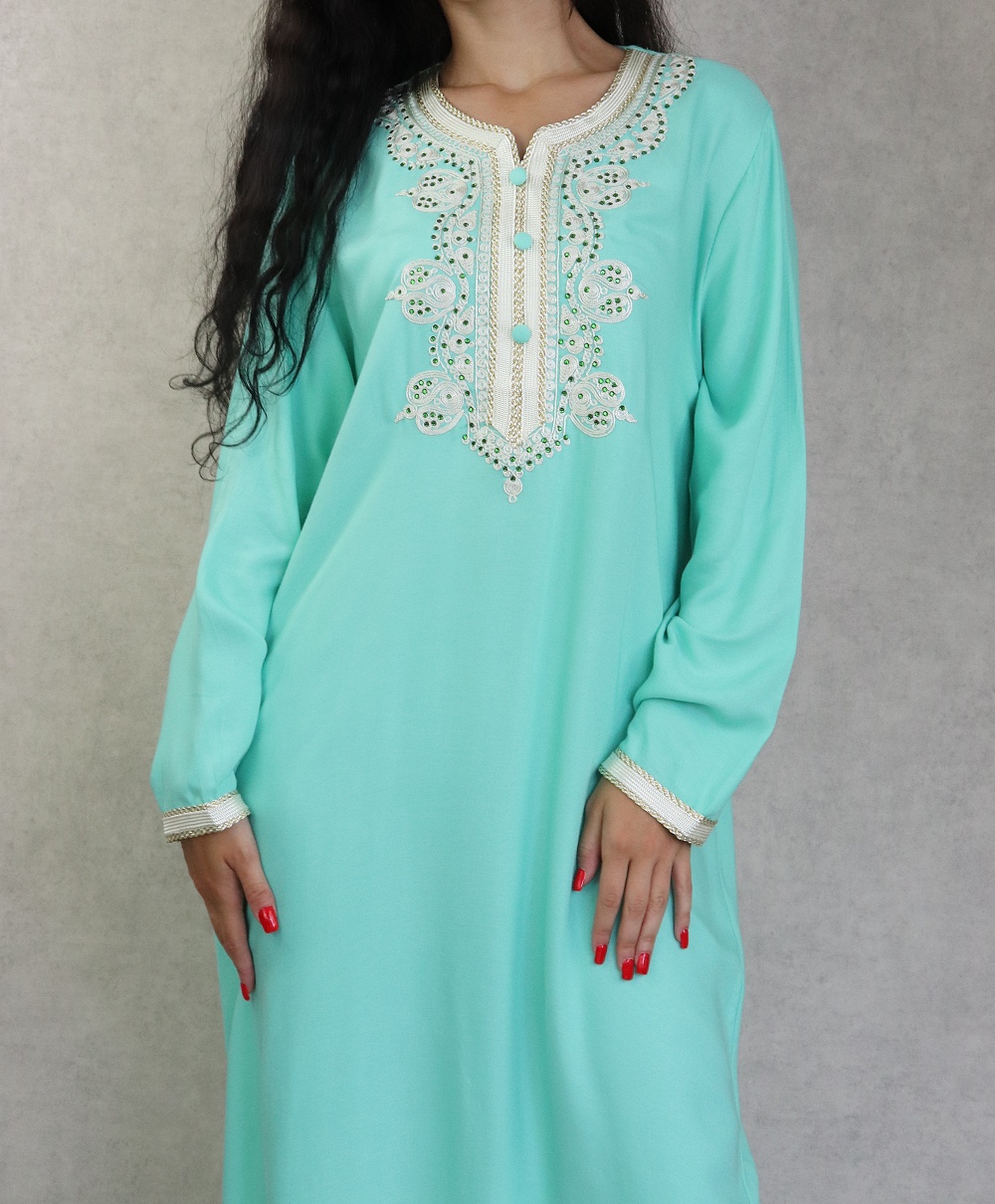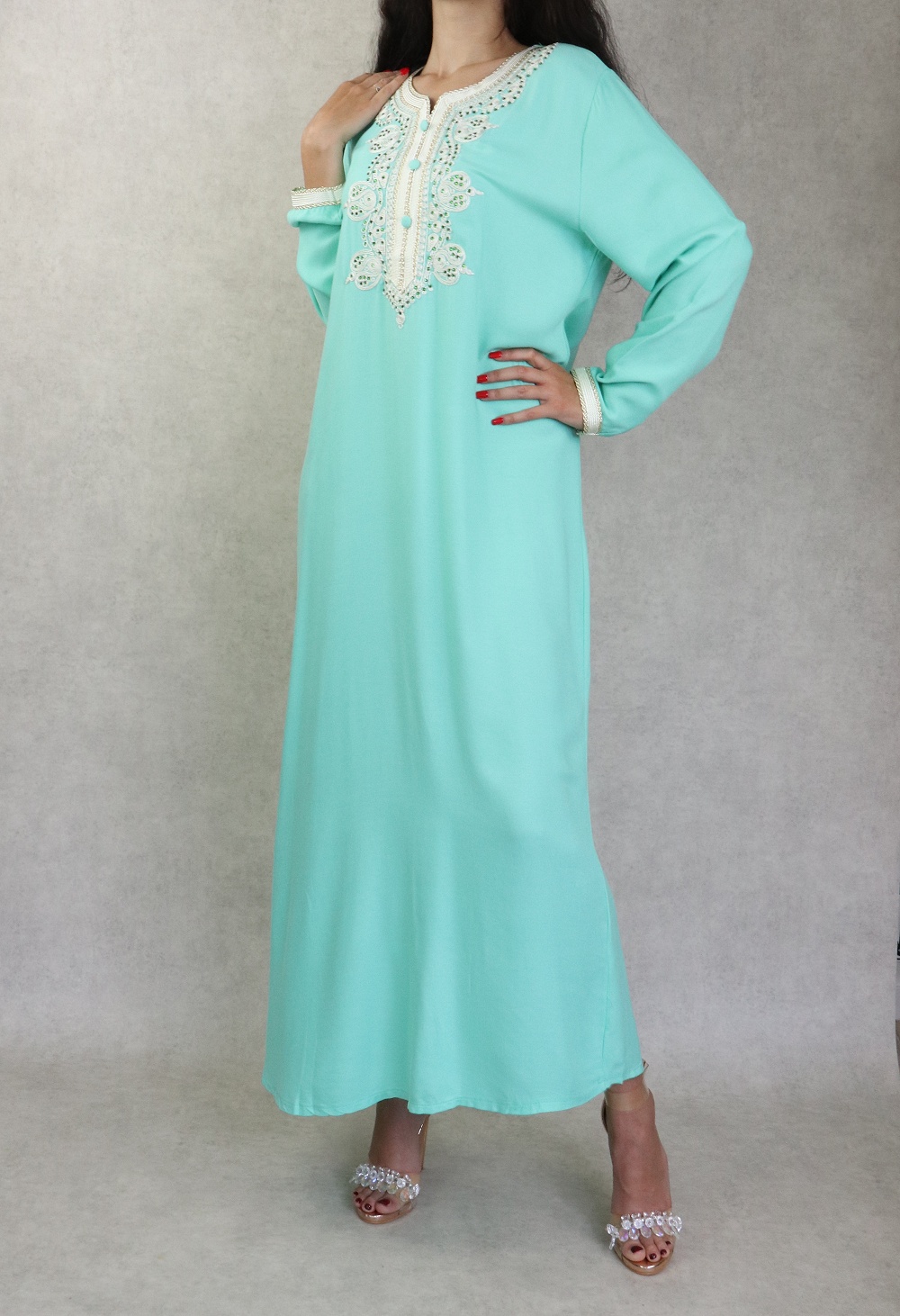 Très belle robe orientale réalisée dans un tissu épais (non transparent), fluide et doux (majorité coton). Borderie sur la partie du haut et les poignets.