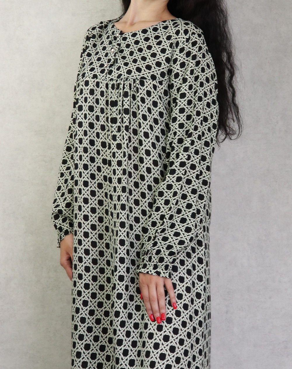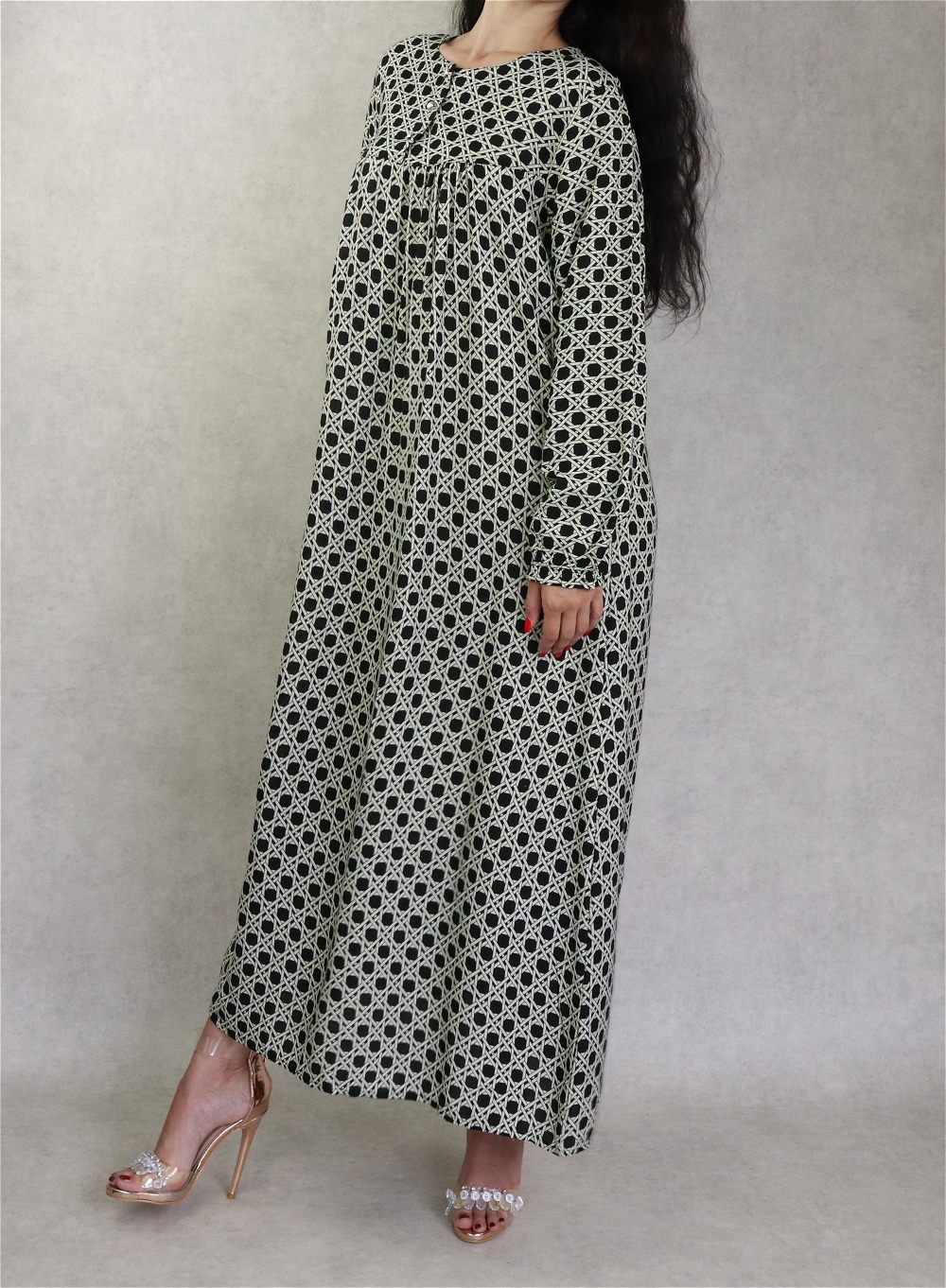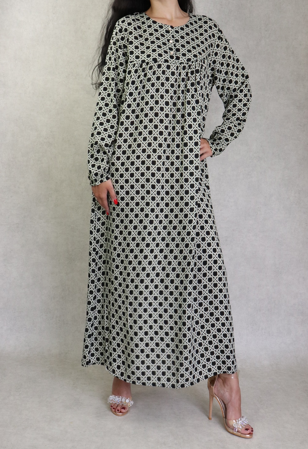 Robe longue, coupe légèrement évasée, encolure arrondie, manches longues, fermeture boutons sur le buste. Vous disposez d'un large choix de couleurs, optez donc pour la couleur que vous désirez !