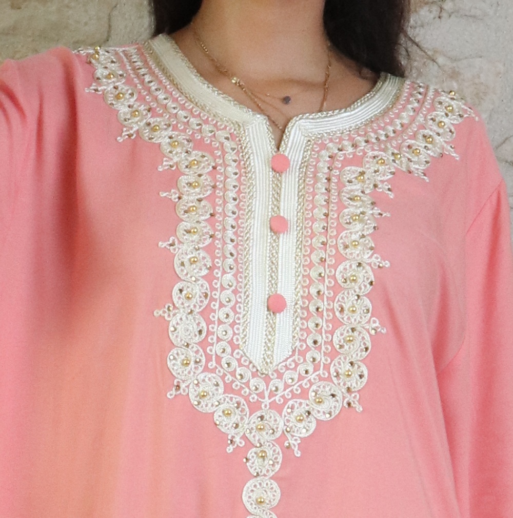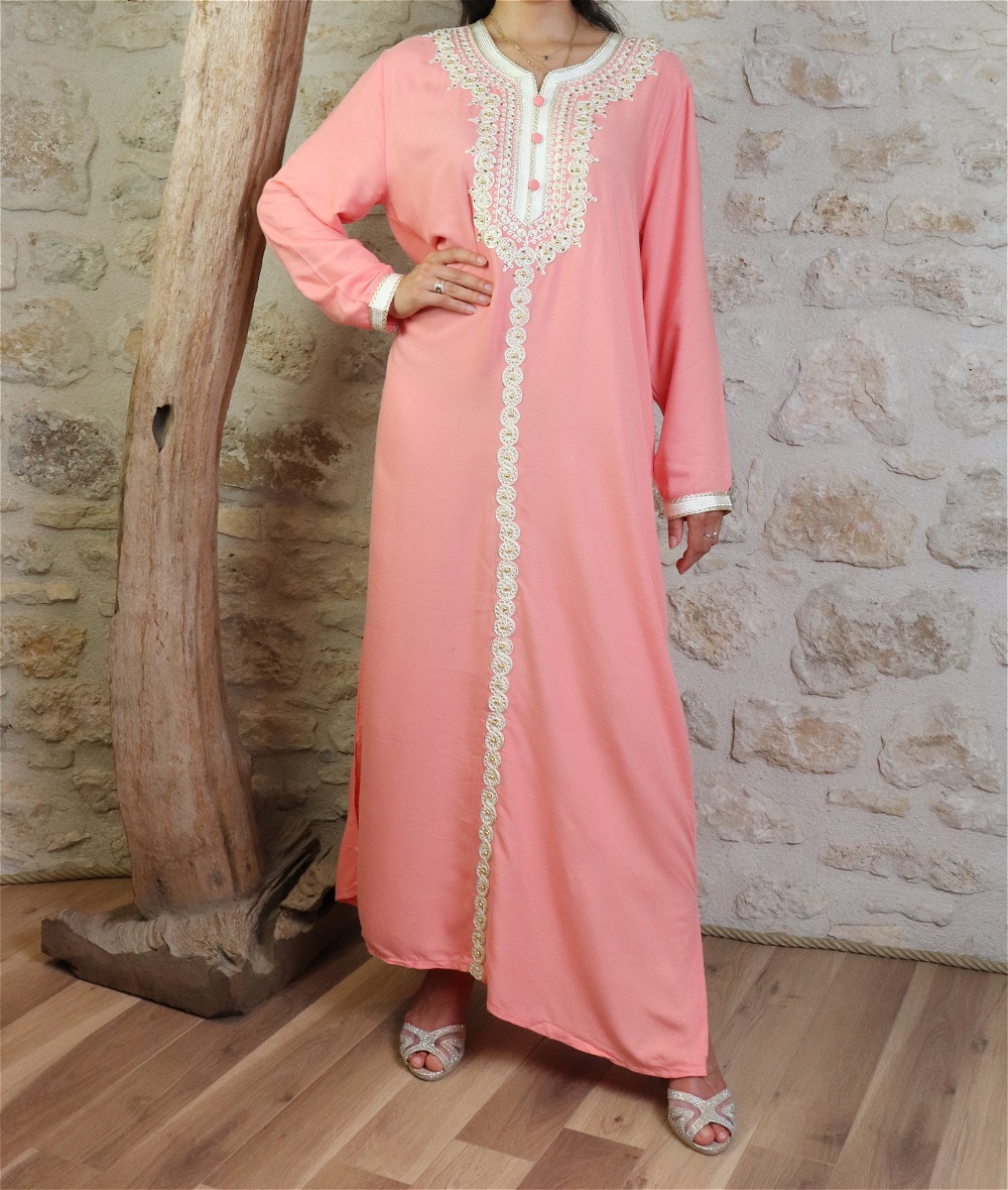Robe longue avec broderies et strass style caftan marocaine pour femme - Couleur Saumon Vetement & Accessoire