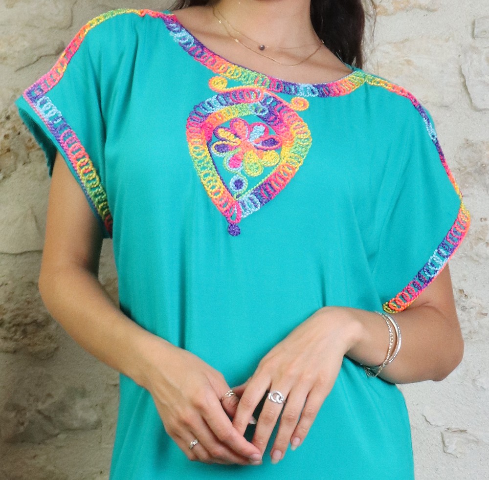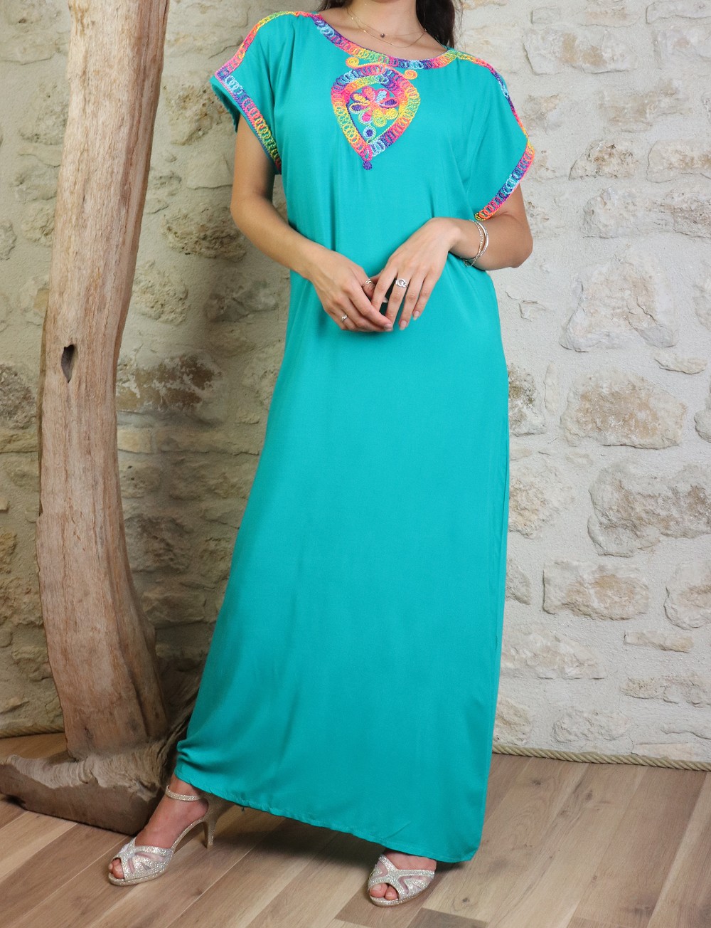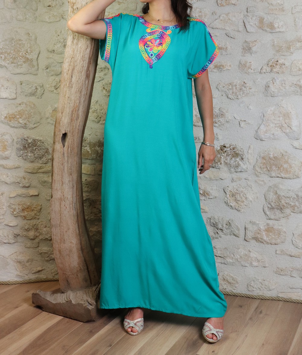 Cette belle robe longue coupe droite, ornée d'un fil multicolore, col rond.